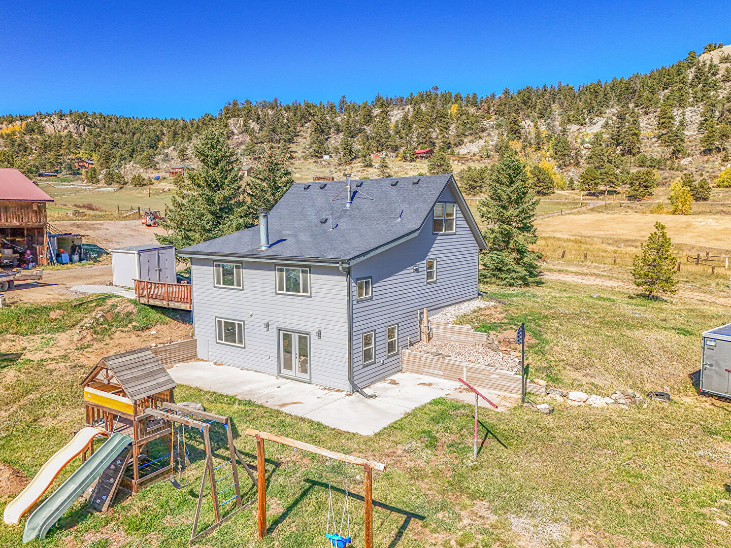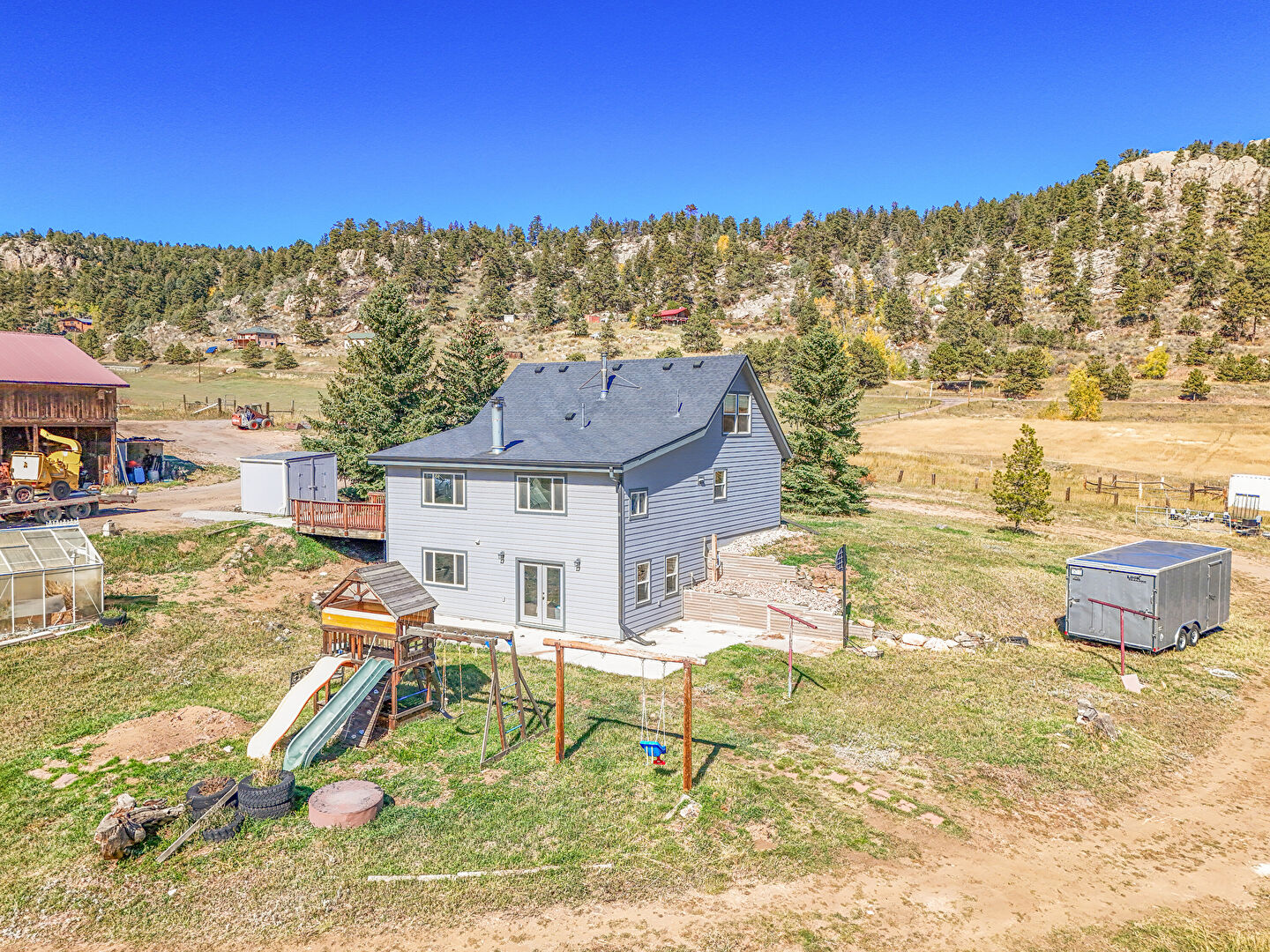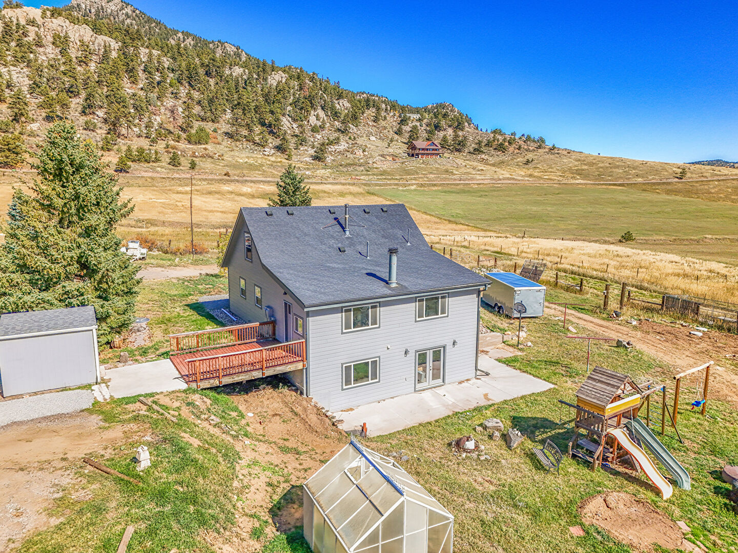 Basement Walk Out, Deck, Downspout, Fence, Forest View, French Doors, Greenhouse, Gutters, Horizontal Siding, Lawn, Mountain View, Outdoor Structure, Pad Mount Transformer, Patio, Playground, Rural View, Shed, Shingle Roof, Basement Walk Out, Deck, Downspout, French Doors, Horizontal Siding, Lawn, Mountain View, Pad Mount Transformer