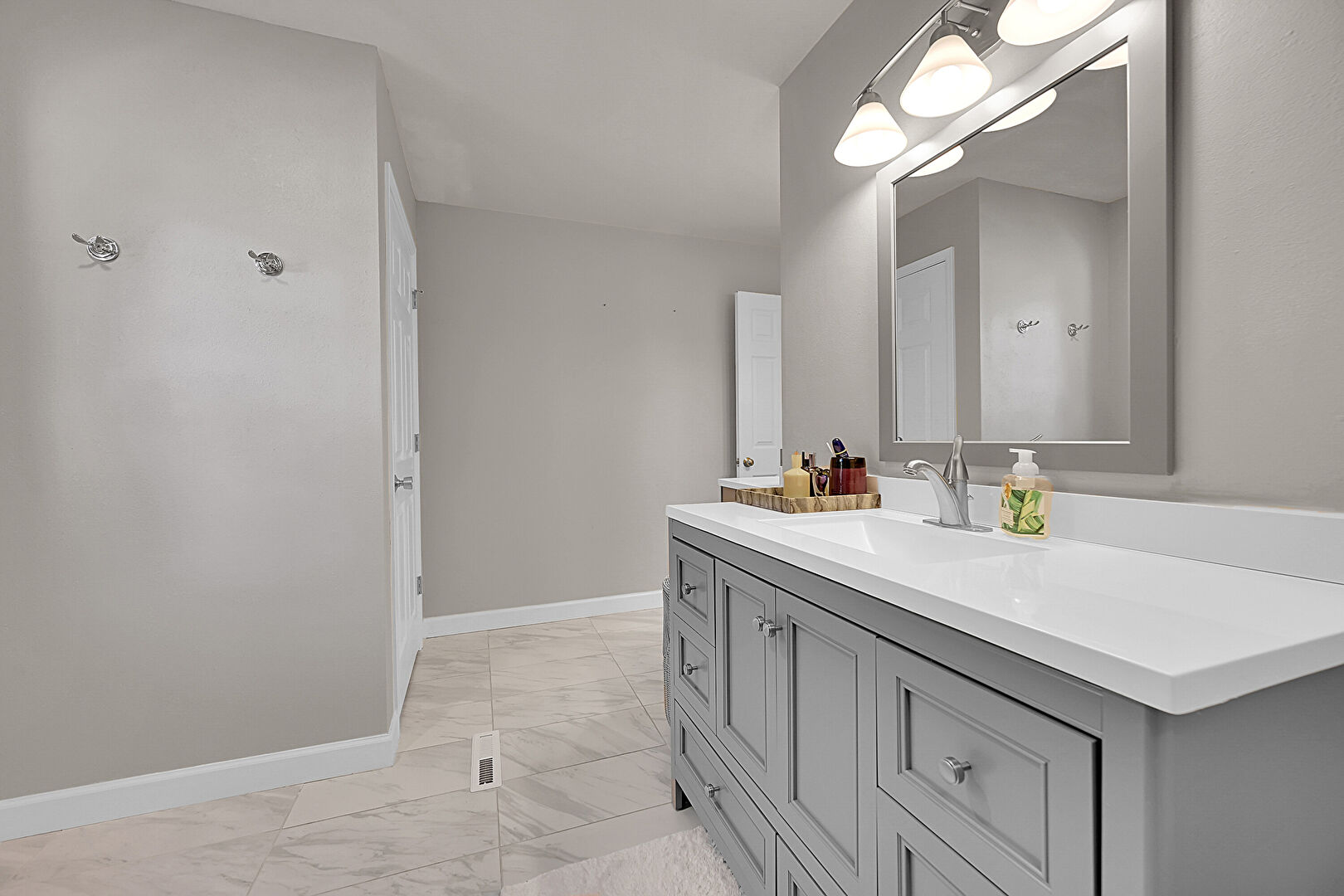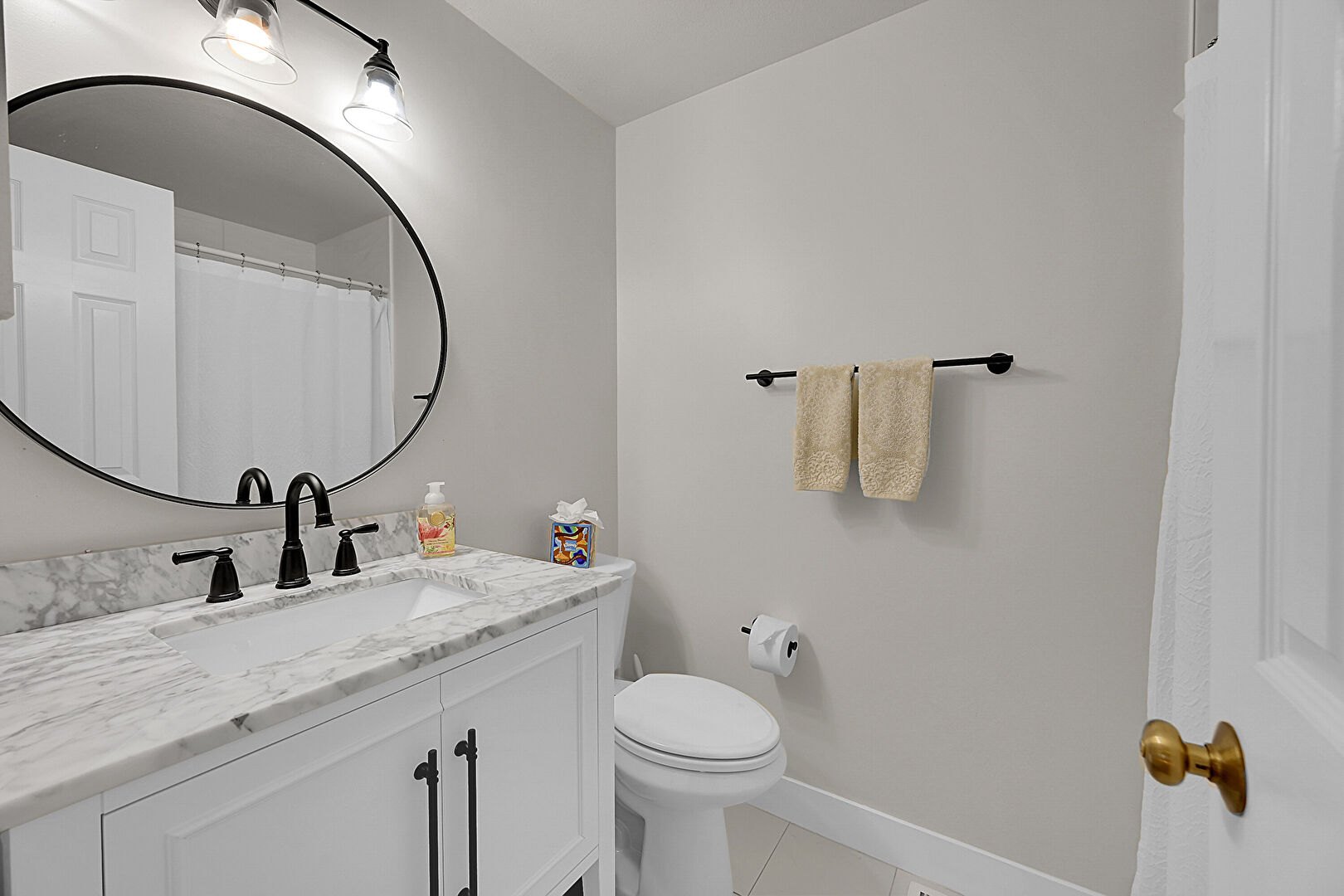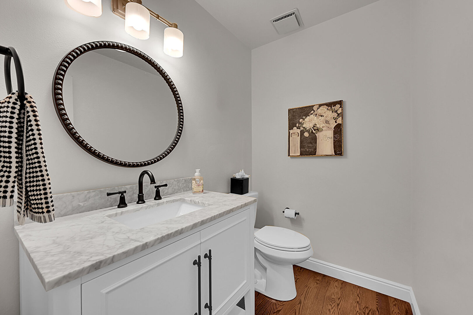Baseboards Wall, Drywall, Full Bathroom, Half Bathroom, Marble Finish Floor, Natural Light, Tile Floor, Vanity, Vent, Wood Finish Floor, Baseboards Wall, Combined Bath Shower, Drywall, Recessed Lighting