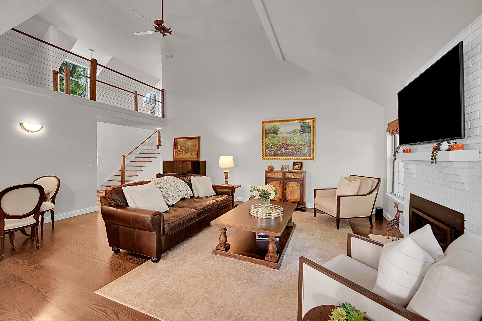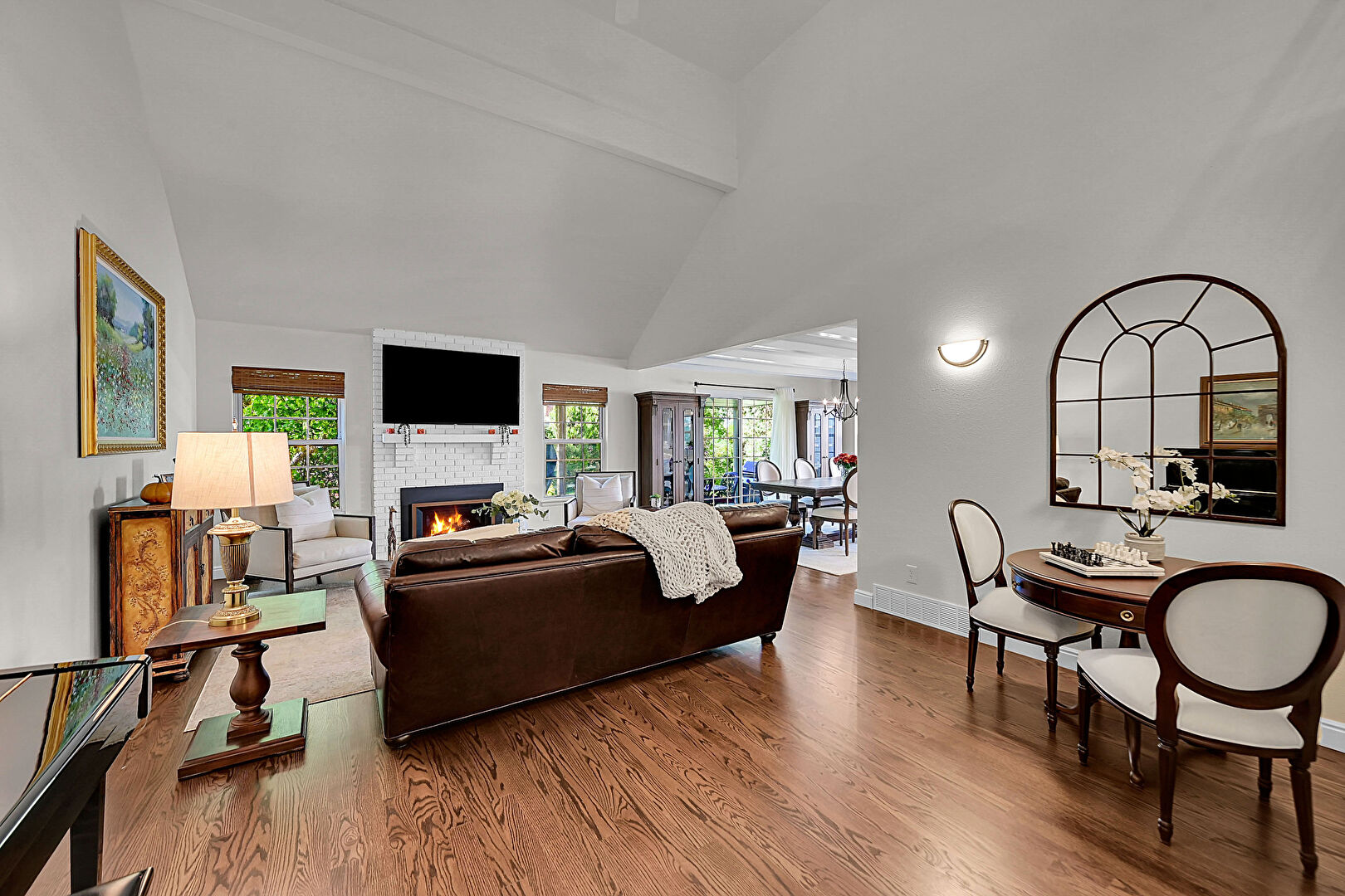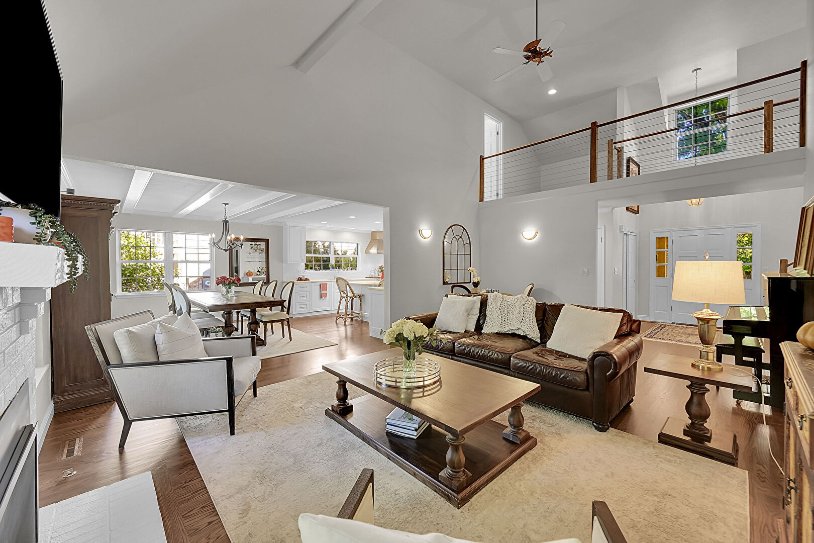 Baseboard Radiator, Baseboards Wall, Beamed Ceiling, Ceiling Fan, Drywall, Fireplace, High Ceiling, Natural Light, Notable Chandelier, Recessed Lighting, Stairs, Vaulted Ceiling, Vent, Wood Finish Floor, Beamed Ceiling, Fireplace, High Ceiling, Vent