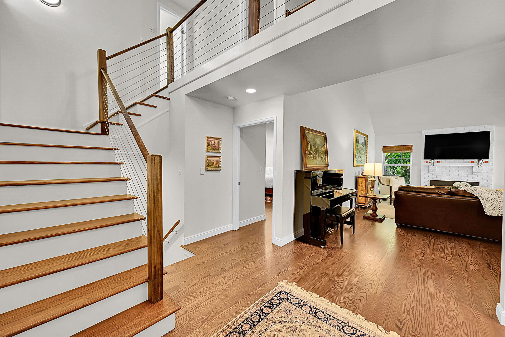 Baseboards Wall, Drywall, High Ceiling, Natural Light, Stairs, Vaulted Ceiling, Wood Finish Floor, Recessed Lighting