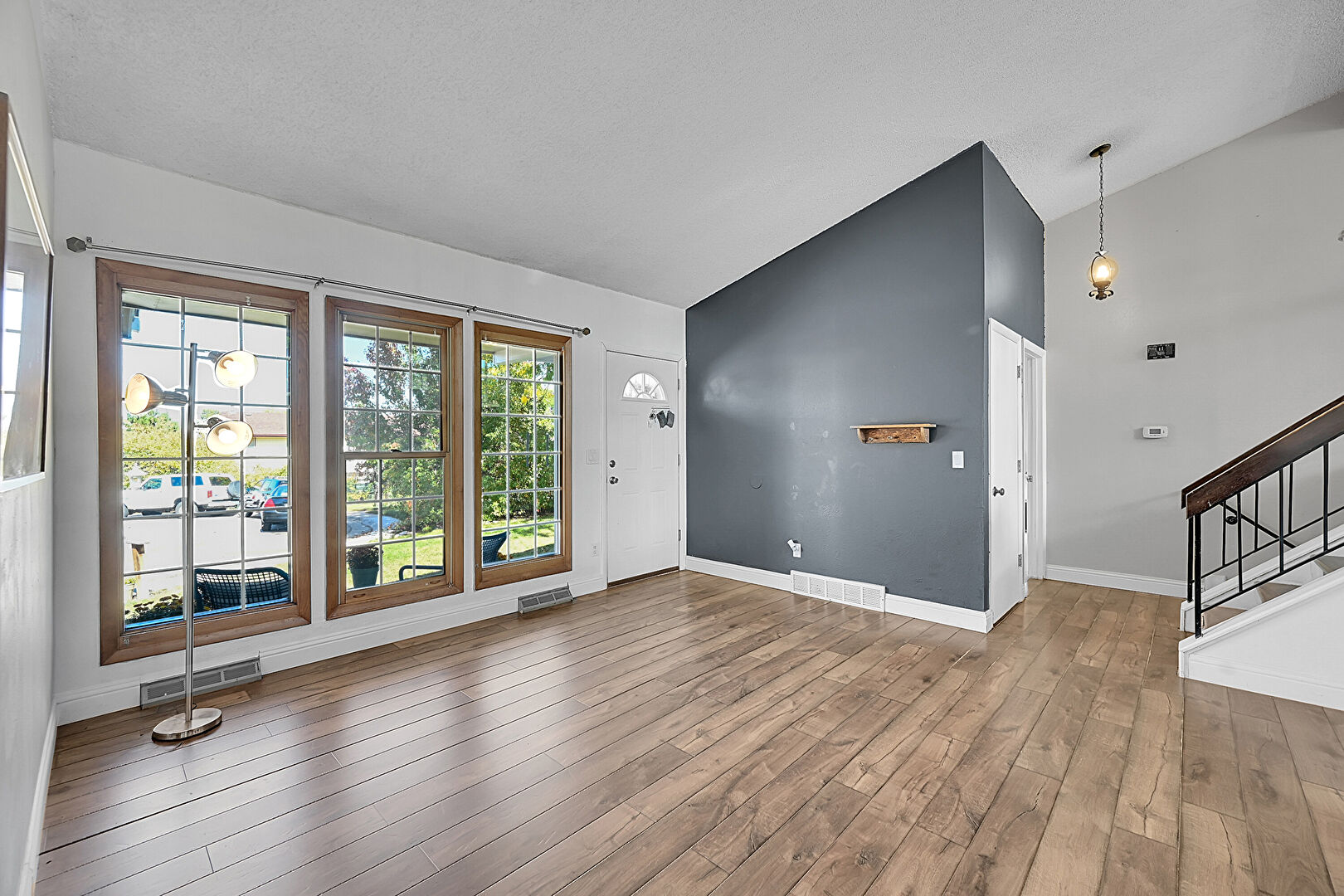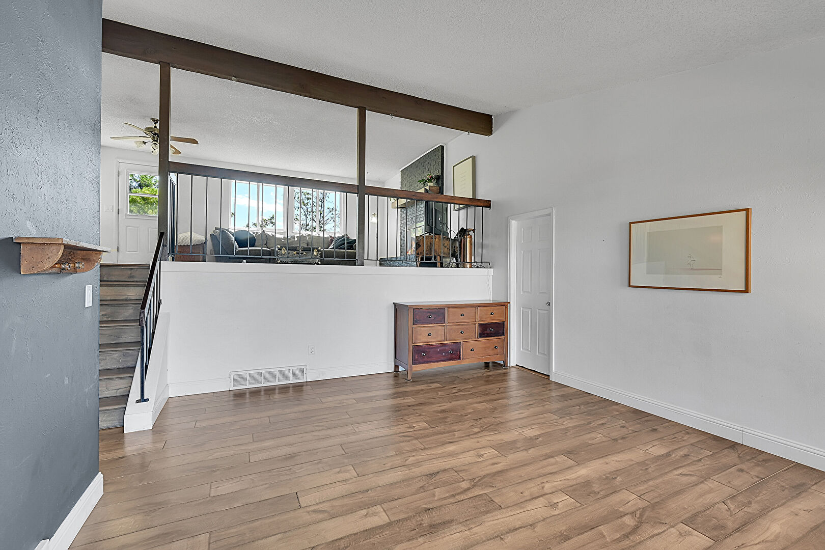 Baseboards Wall,  Beamed Ceiling,  Ceiling Fan,  Drywall,  High Ceiling,  Natural Light,  Stairs,  Vaulted Ceiling,  Vent,  Wood Finish Floor, Natural Light, Vaulted Ceiling