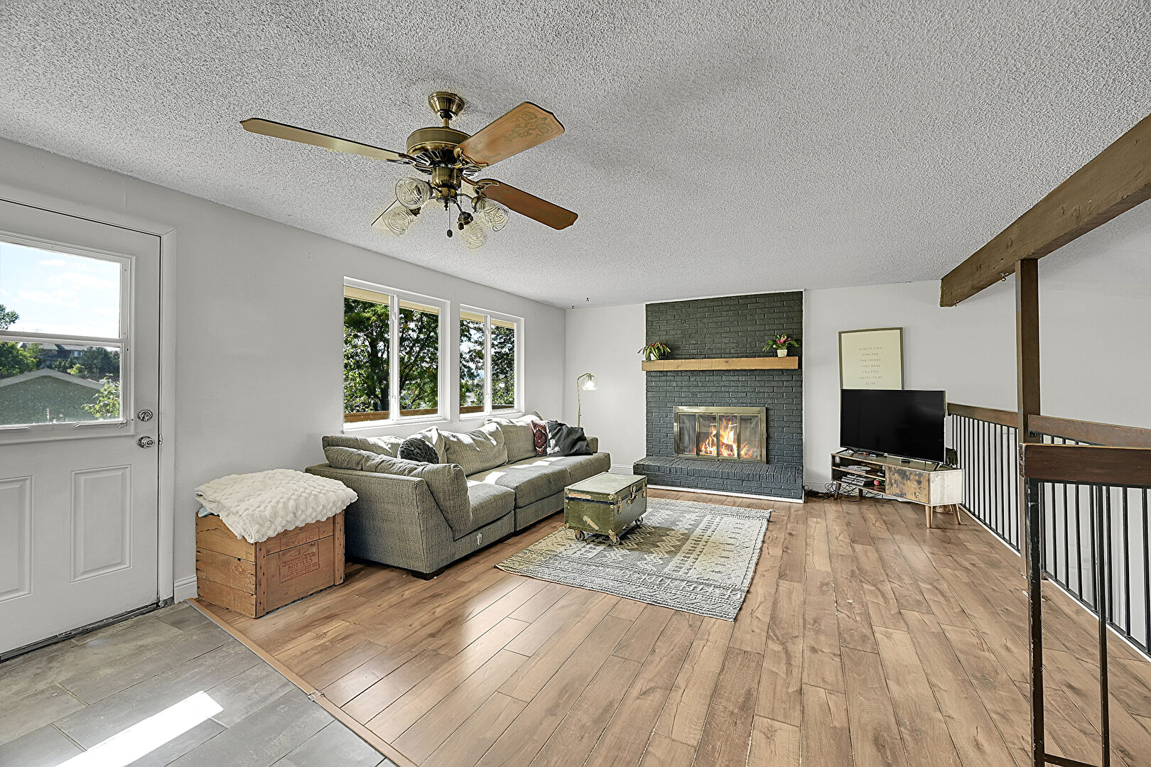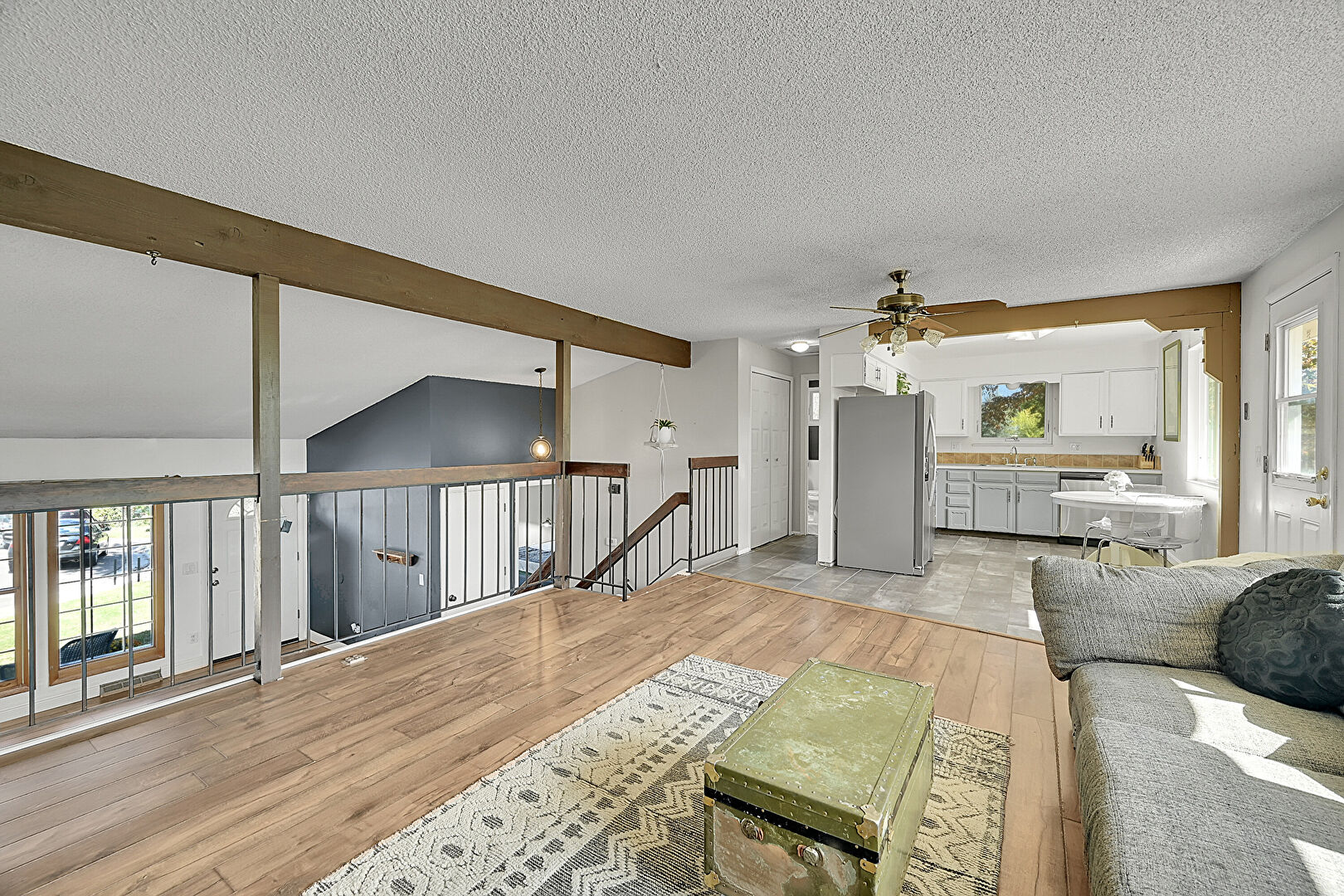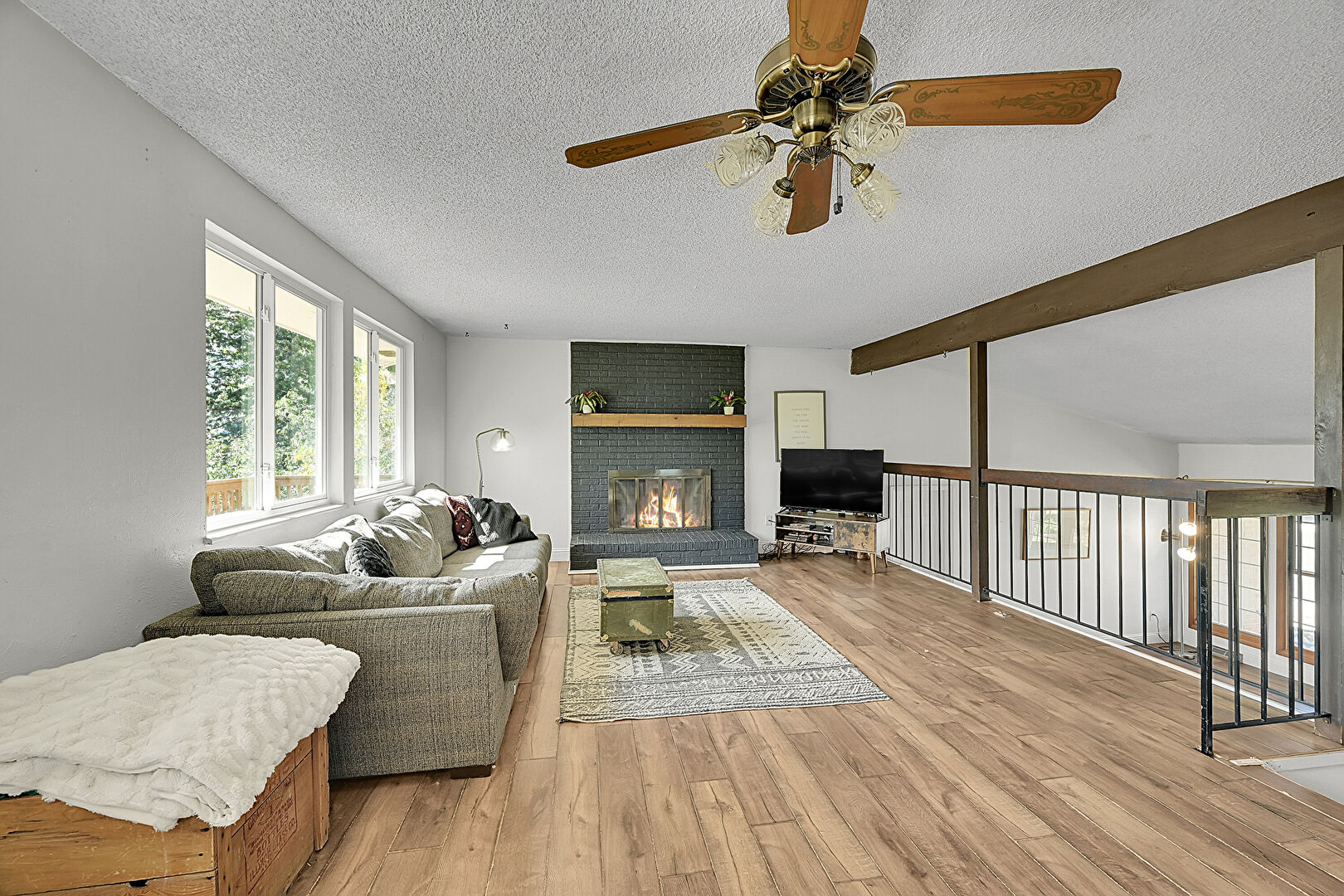Baseboards Wall,  Beamed Ceiling,  Ceiling Fan,  Drywall,  Fireplace,  Natural Light,  Textured Ceiling,  Vaulted Ceiling,  Wood Finish Floor, Beamed Ceiling, Drywall, Natural Light