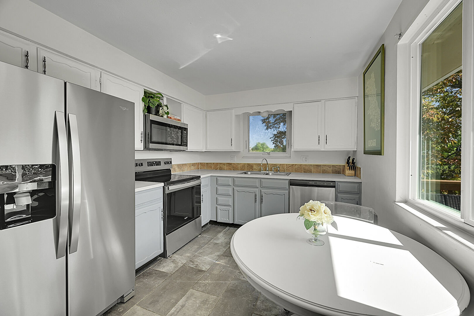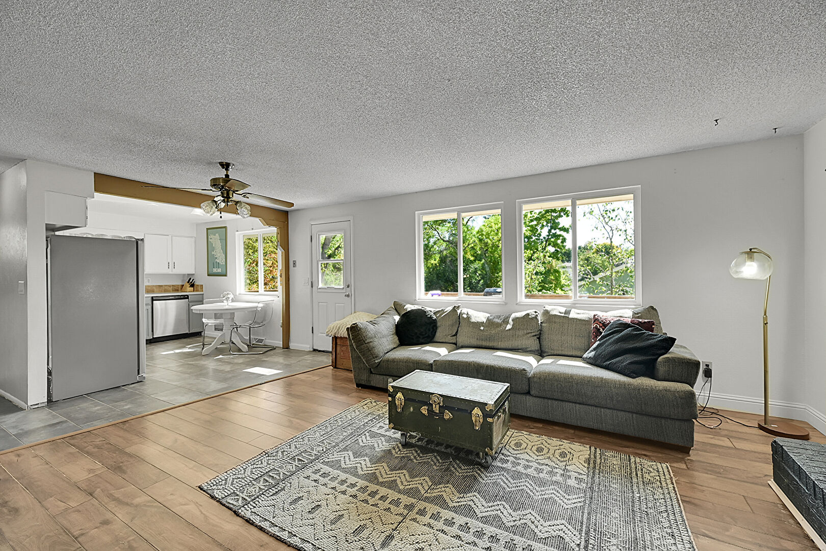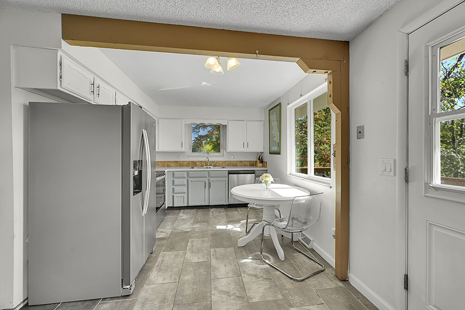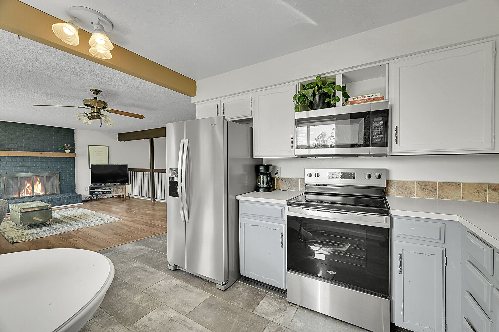 Arched Cabinets,  Baseboards Wall,  Ceiling Fan,  Drywall,  Fireplace,  Gray Cabinets,  L Shaped Kitchen,  Natural Light,  Open Shelves,  Shaker Cabinets,  Stone Finish Floor,  Textured Ceiling,  Vent,  Visible Hinge Cabinets, L Shaped Kitchen, Opens To Living Area, Shaker Cabinets