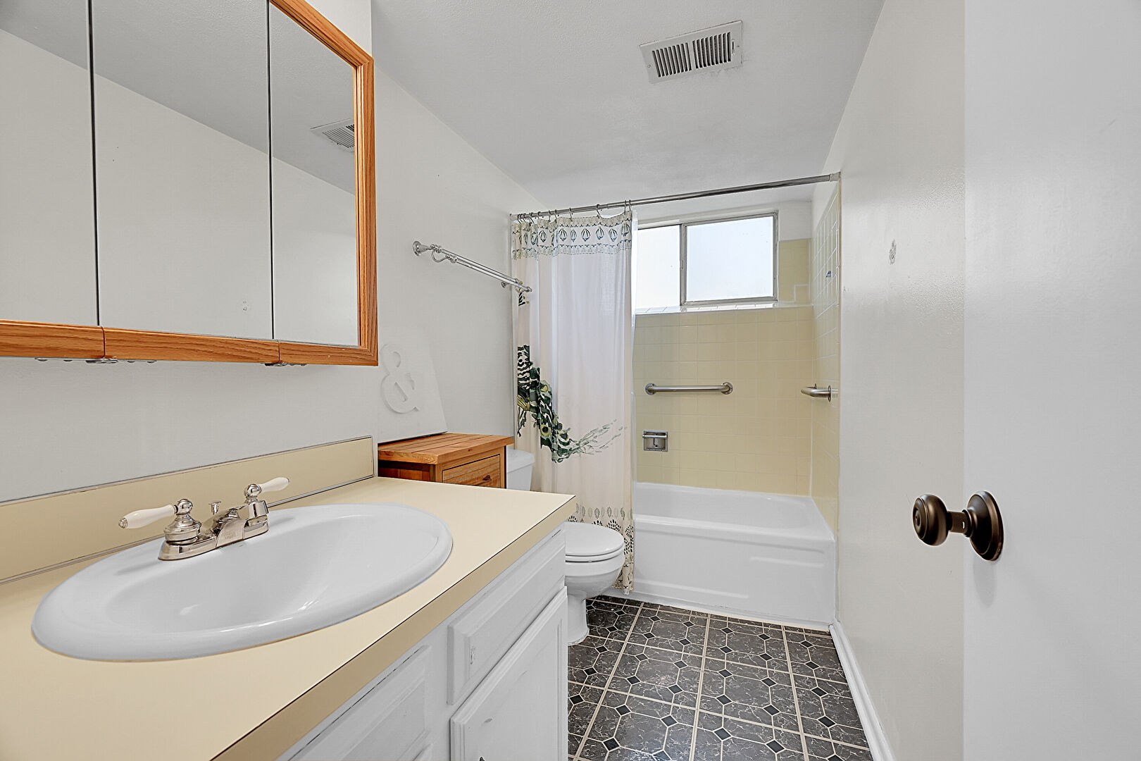 Baseboards Wall,  Combined Bath Shower,  Drywall,  Full Bathroom,  Half Bathroom,  Natural Light,  Textured Wall,  Tile Floor,  Vent, Natural Light, Vanity