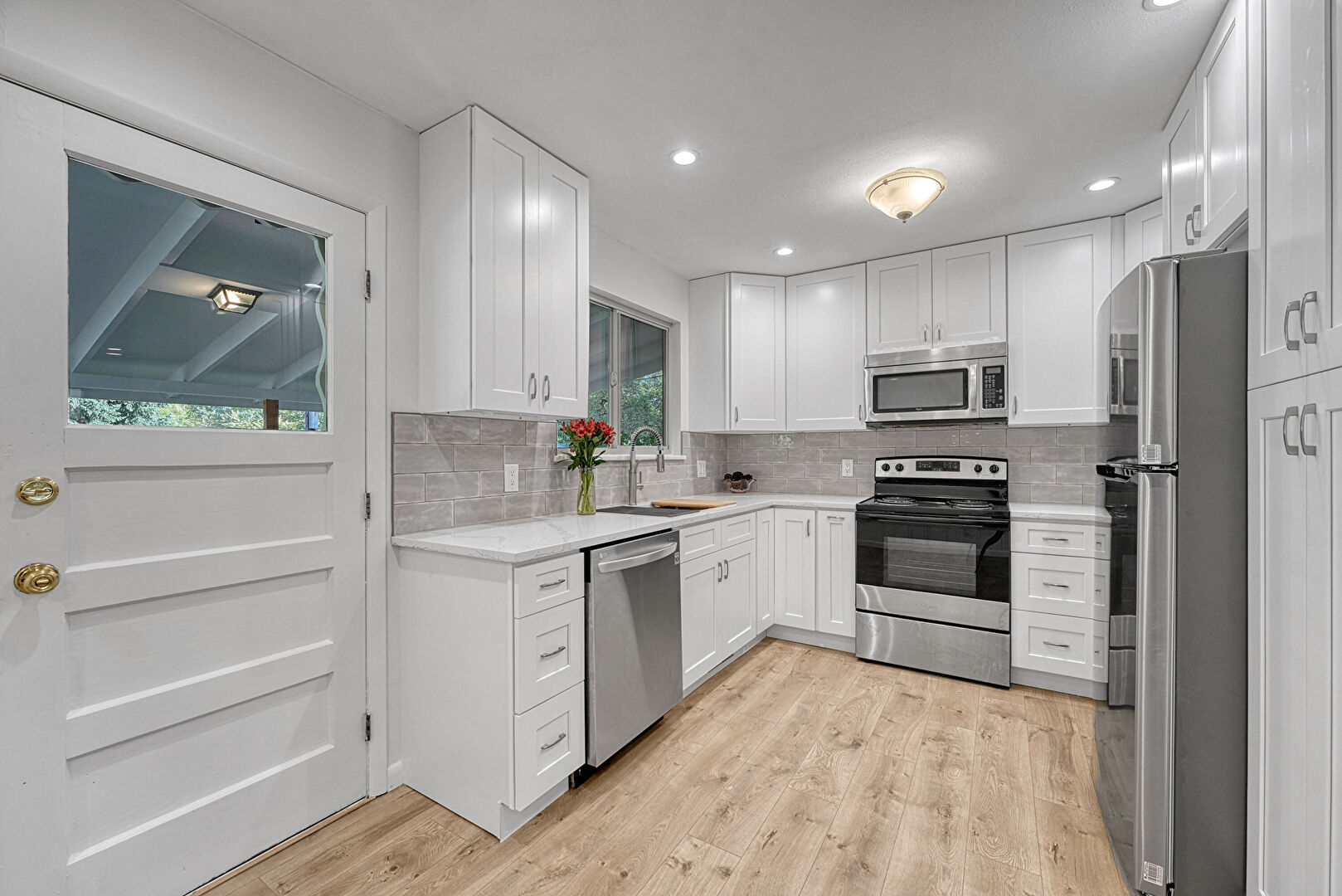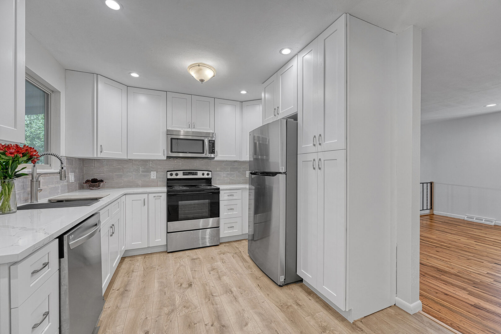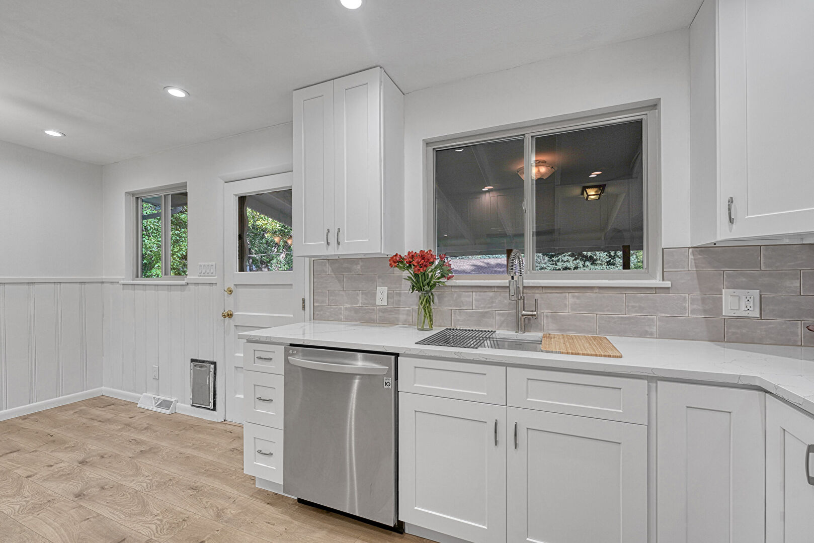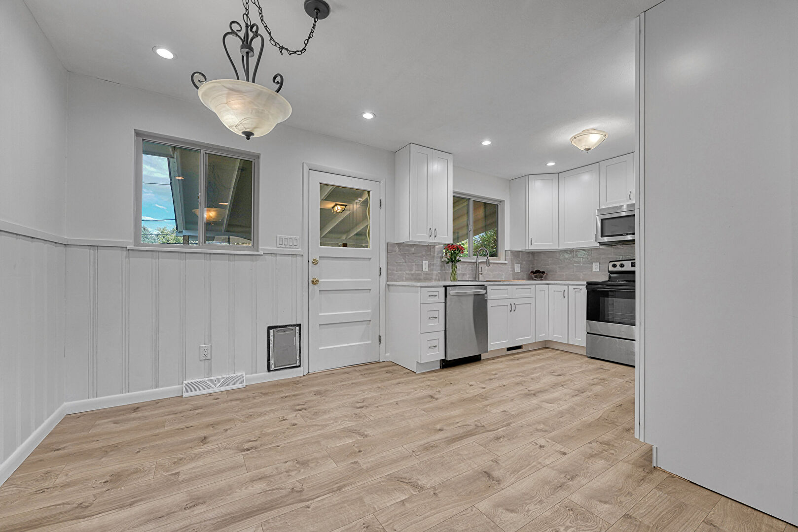 Baseboards Wall, Drywall, Natural Light, Pendant Lighting, Recessed Lighting, Shaker Cabinets, Stone Countertops, U Shaped Kitchen, Vent, Wainscot Wall, Wood Finish Floor, Natural Light, Recessed Lighting, Shaker Cabinets, Stone Countertops