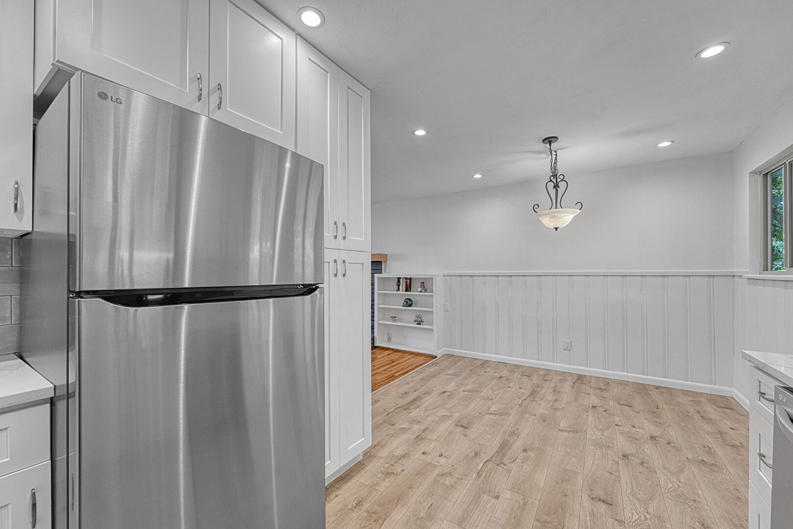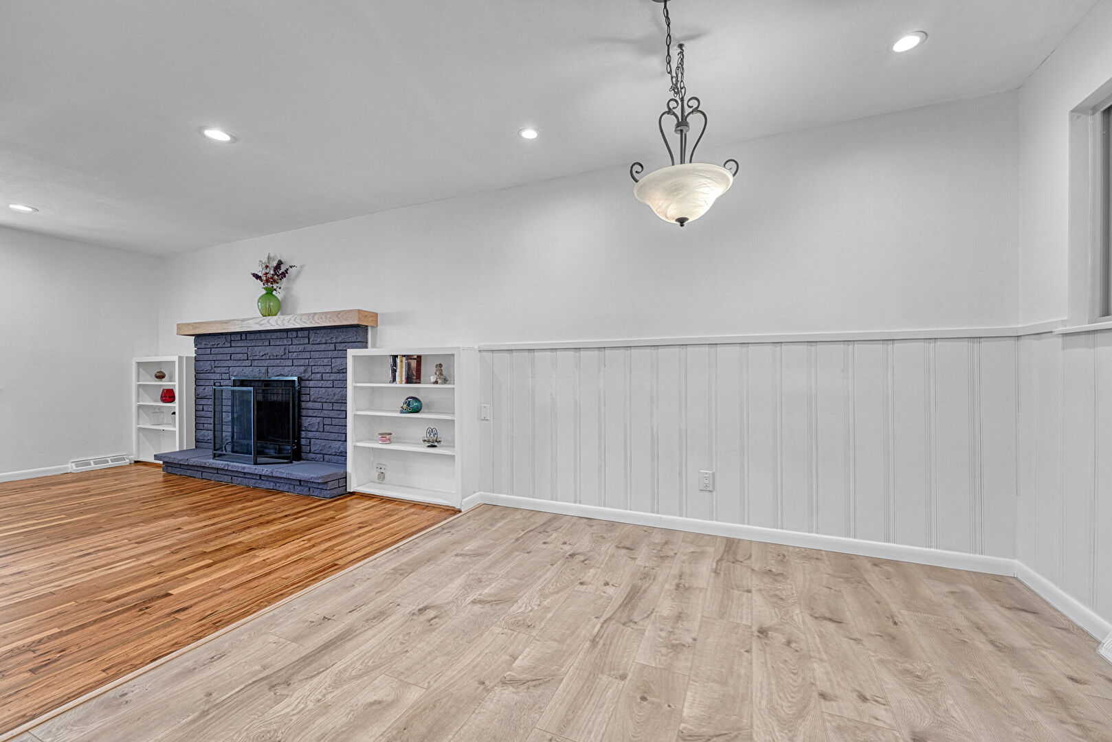 Baseboards Wall, Drywall, Fireplace, Natural Light, Pendant Lighting, Recessed Lighting, Shaker Cabinets, Stone Countertops, Vent, Wainscot Wall, Wood Finish Floor, Wainscot Wall, Wood Finish Floor