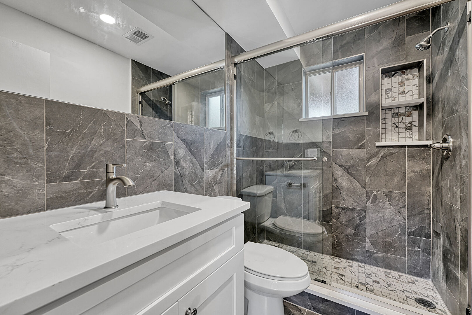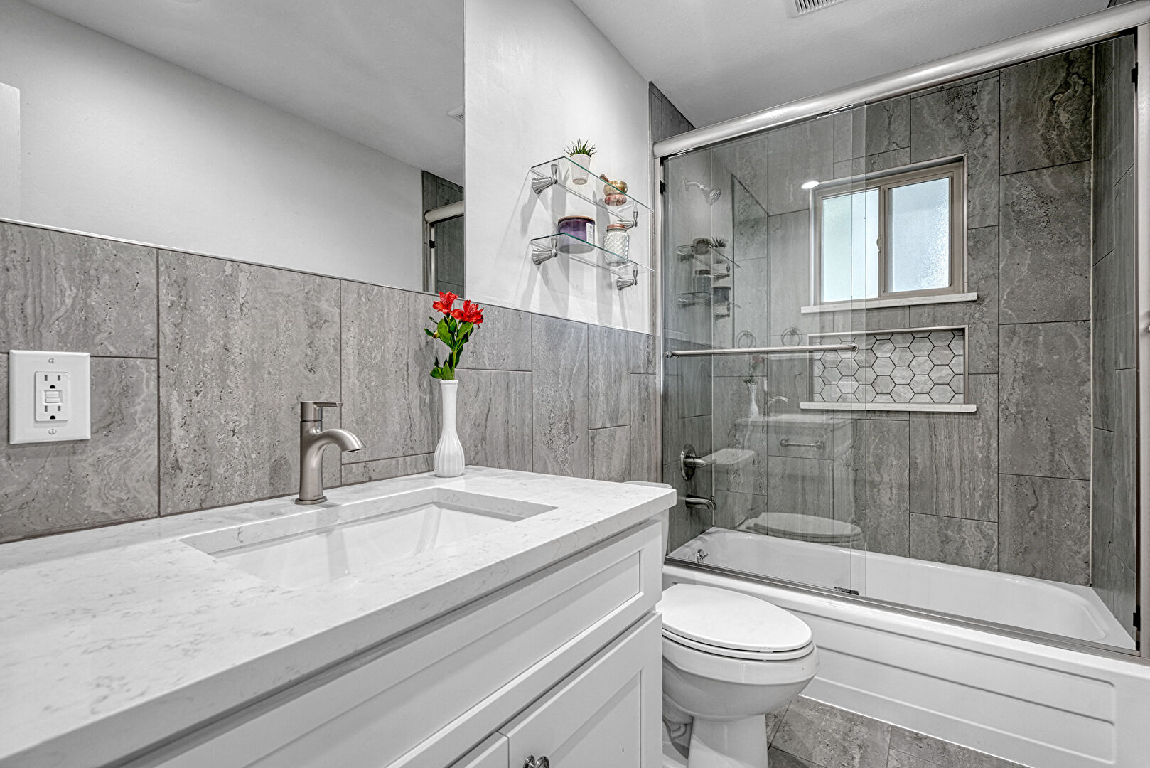 Natural Light, Tile Floor, Tile Wall, Vanity, Vent, Full Bathroom