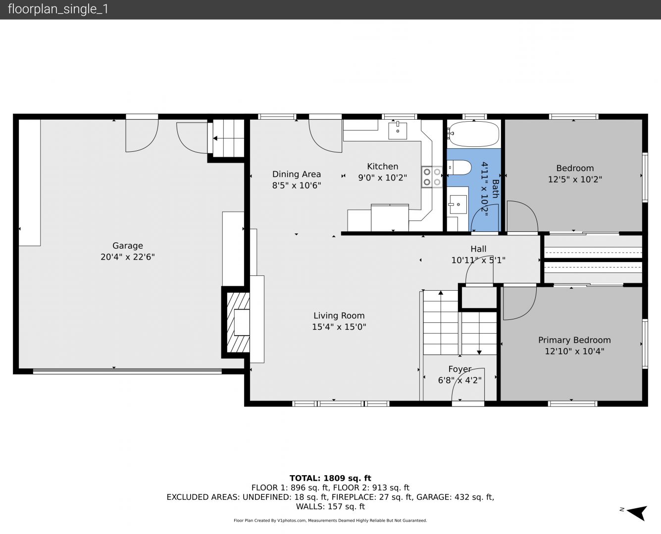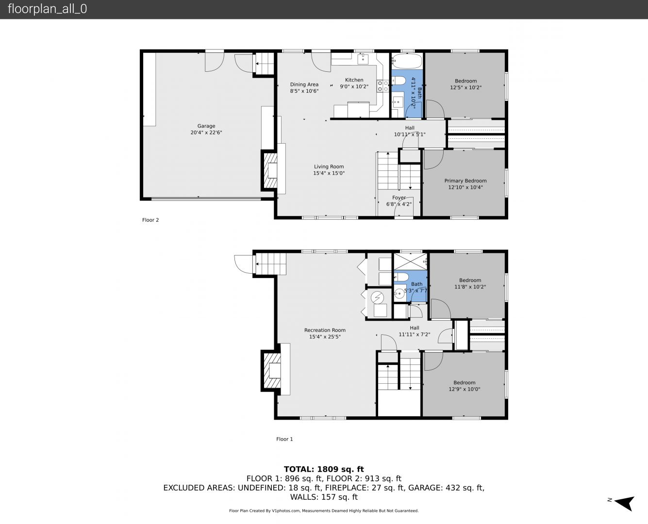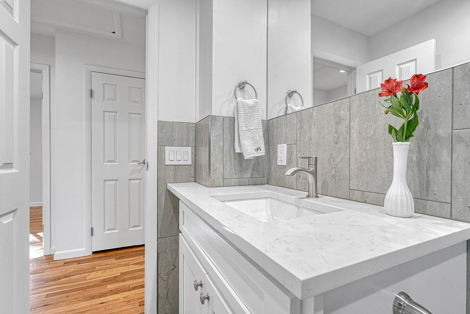 Baseboards Wall, Combined Bath Shower, Drywall, Half Bathroom, Natural Light, Tile Wall, Vanity, Vent, Wood Finish Floor, Full Bathroom, Wood Finish Floor