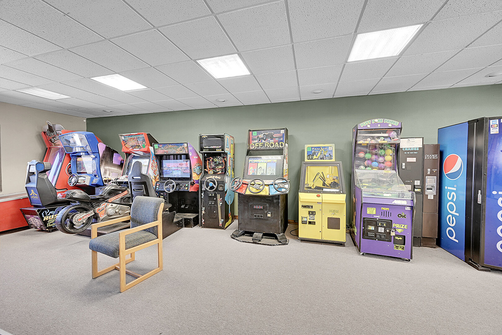 Baseboard Radiator, Billiards, Carpet, Drop Ceiling, Drywall, Vent, Drop Ceiling, Natural Light