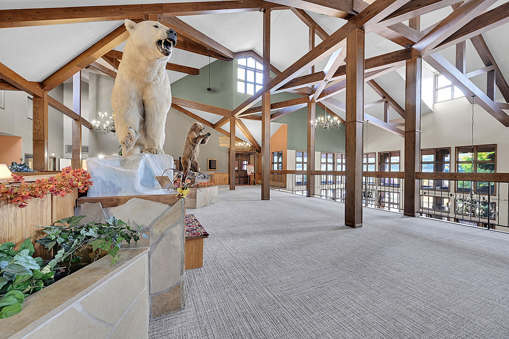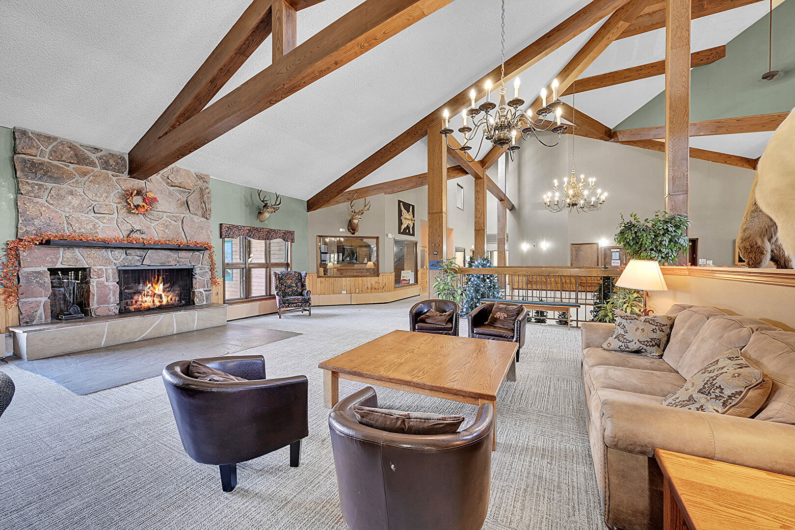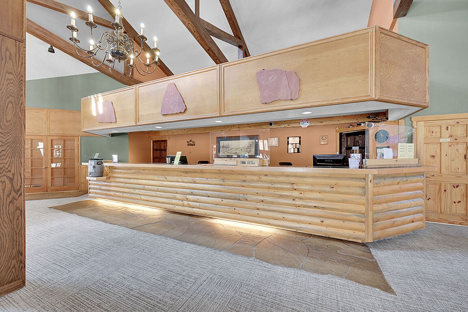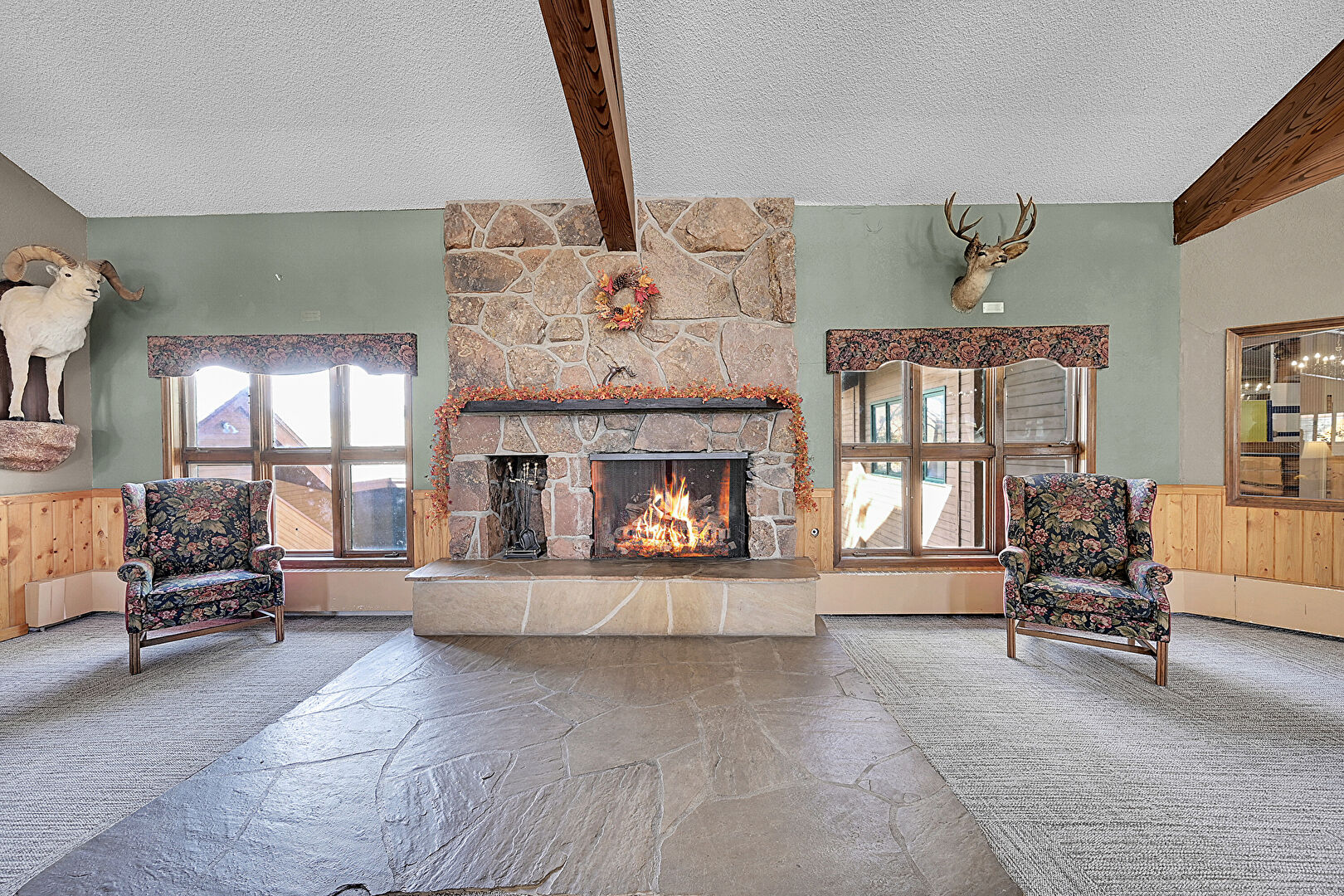 Beamed Ceiling, Carpet, Drywall, Fireplace, French Doors, High Ceiling, Natural Light, Notable Chandelier, Stairs, Stone Finish Floor, Textured Ceiling, Vaulted Ceiling, Wainscot Wall, Wood Wall, Beamed Ceiling, Carpet, Notable Chandelier