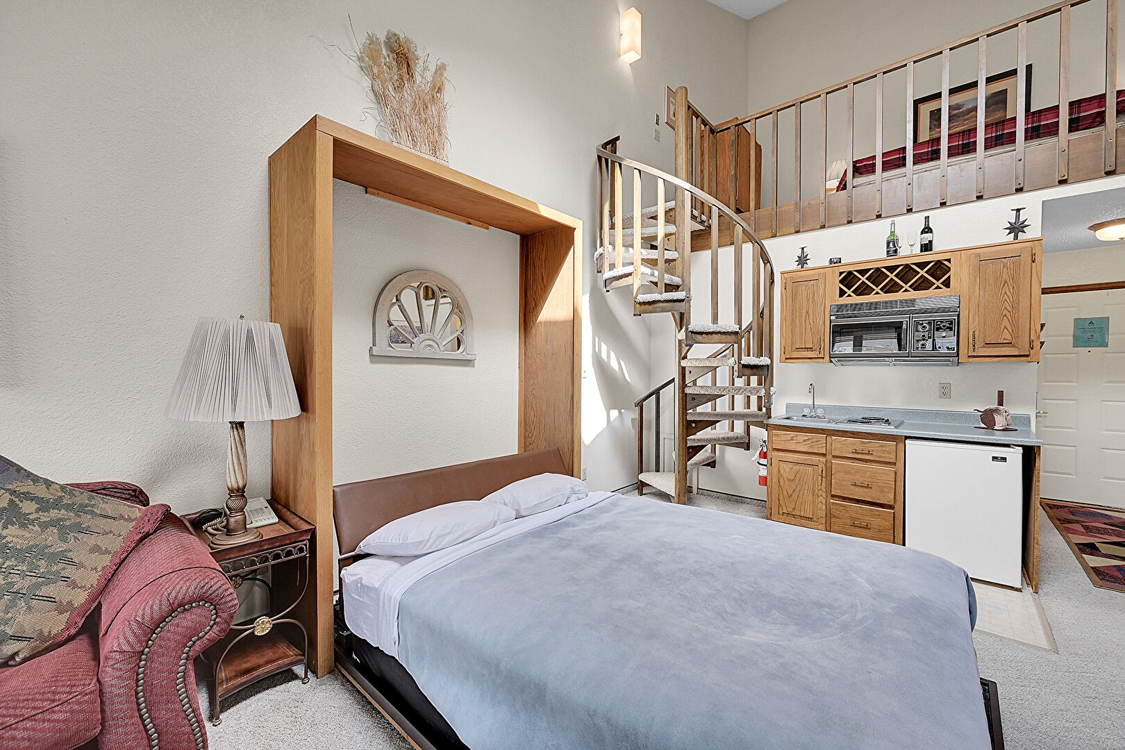 Carpet, Drywall, Medium Brown Cabinets, Raised Cabinets, Vinyl Floor, Visible Hinge Cabinets, Fire Extinguisher