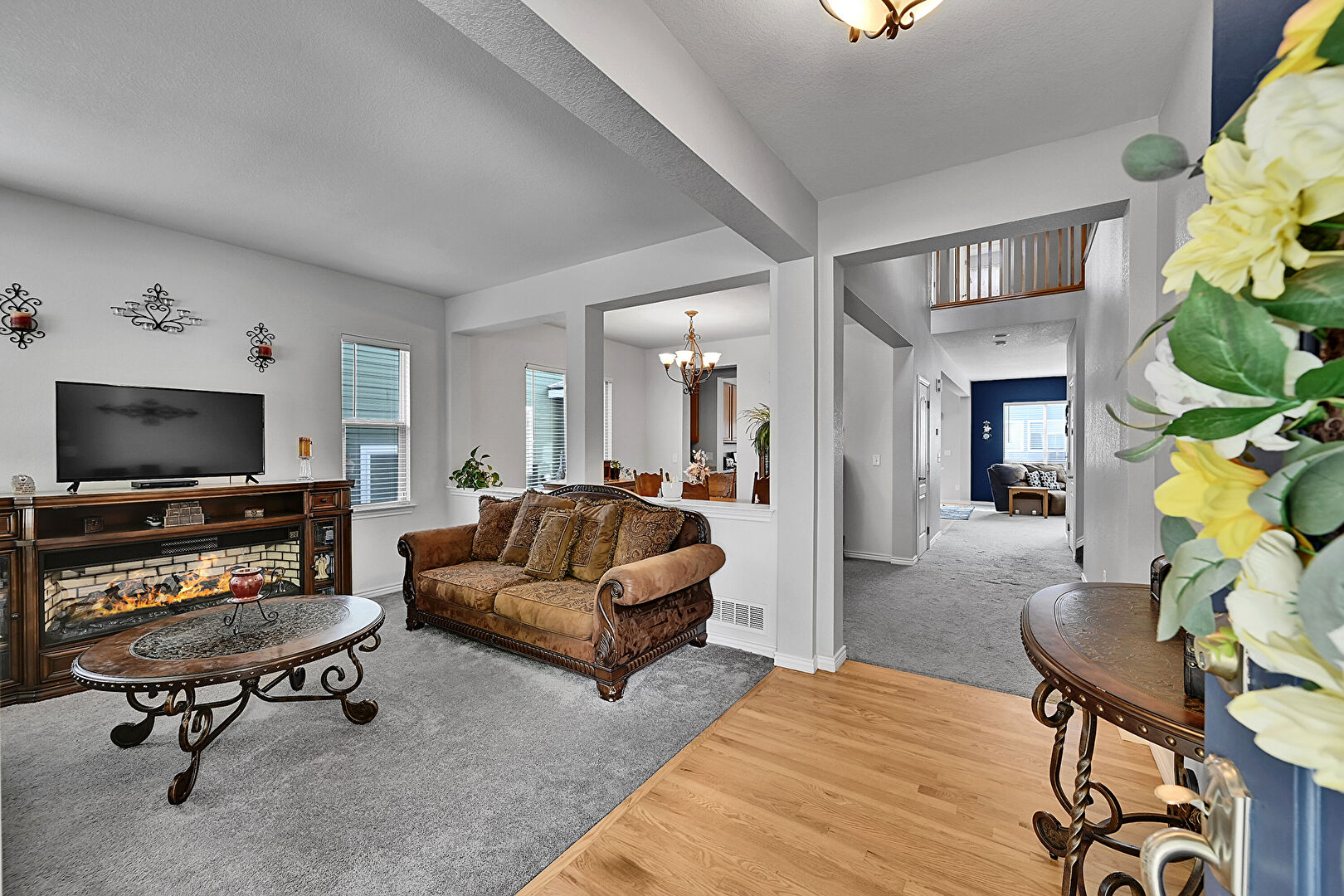 Baseboards Wall, Beamed Ceiling, Carpet, Ceiling Fan, Drywall, Fireplace, L Shaped Kitchen, Natural Light, Notable Chandelier, Textured Ceiling, Textured Wall, Wood Finish Floor, Baseboards Wall, Ceiling Fan, Drywall, Fireplace, Natural Light, Vent, Wood Finish Floor