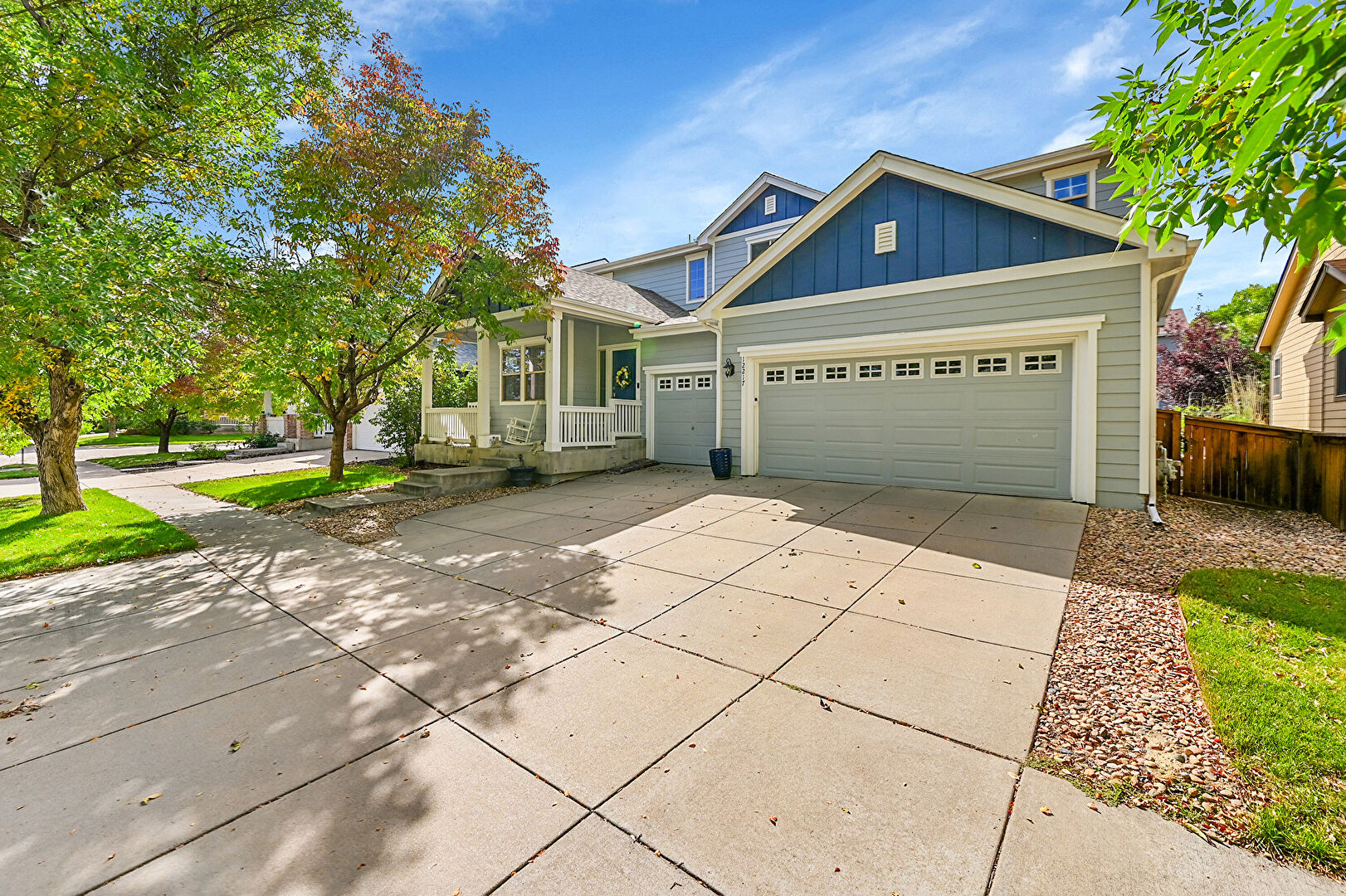 Board Batten Siding, Concrete Foundation, Deck, Downspout, Driveway, Fence, Garage, Gutters, Horizontal Siding, Lawn, Porch, Vertical Siding, Board Batten Siding, Fence, Gutters