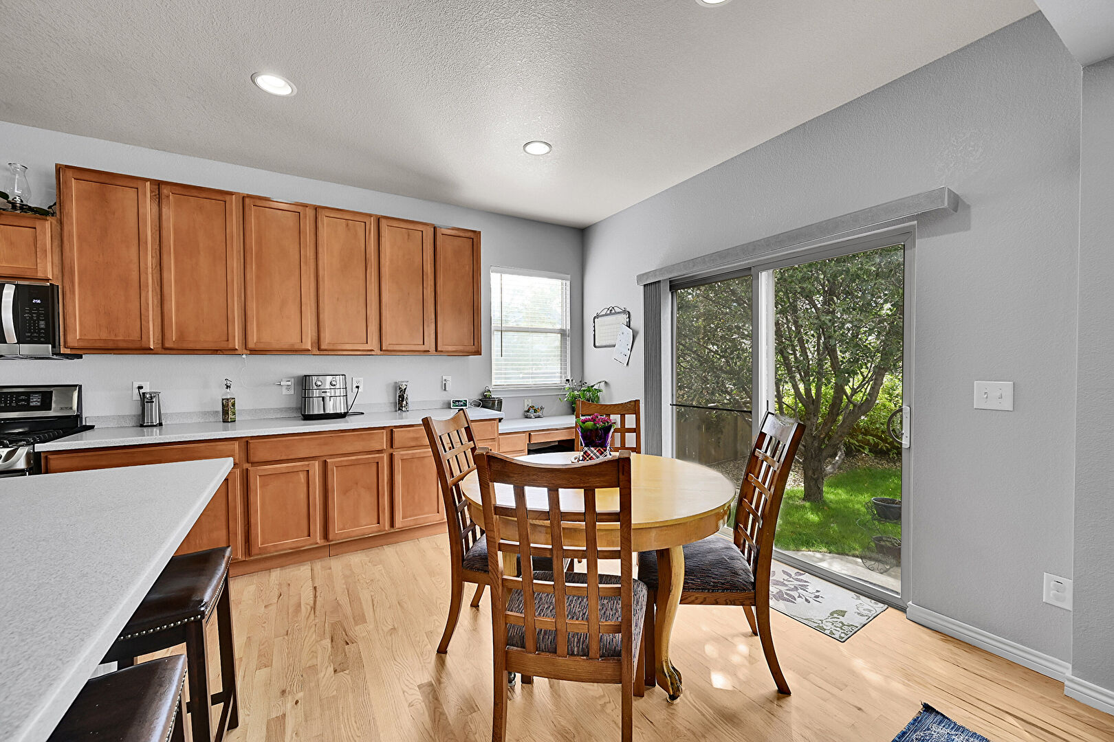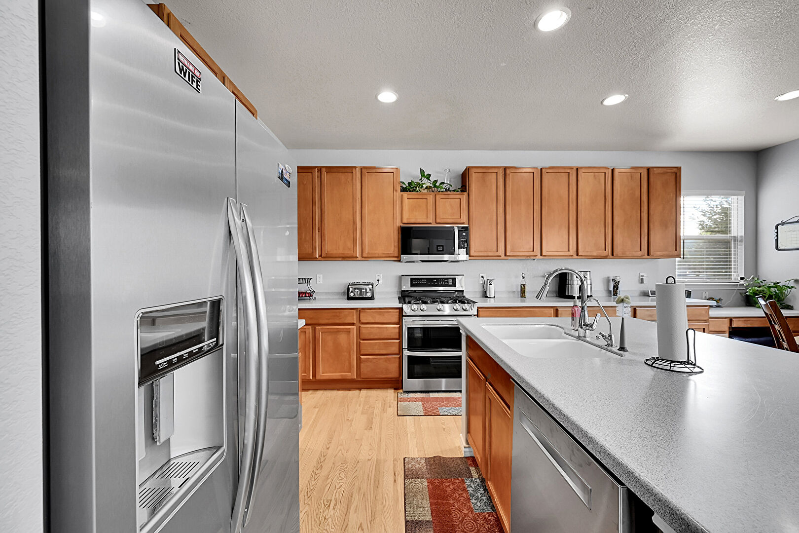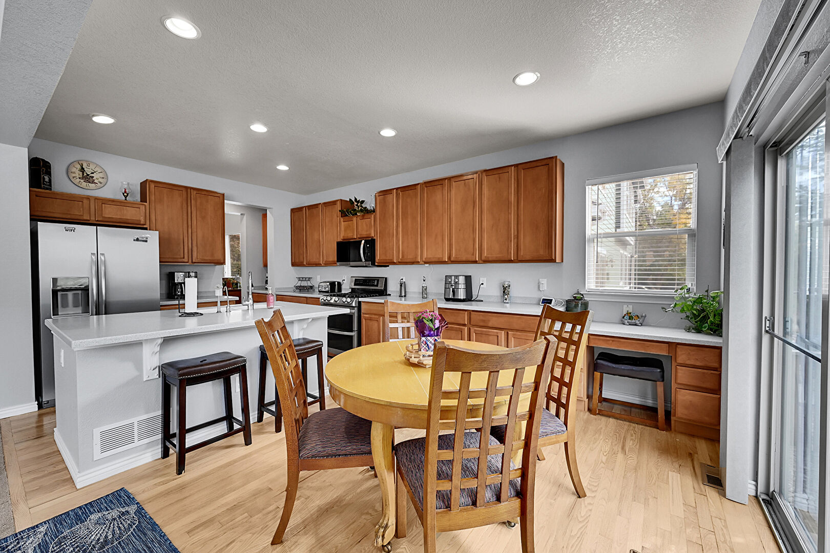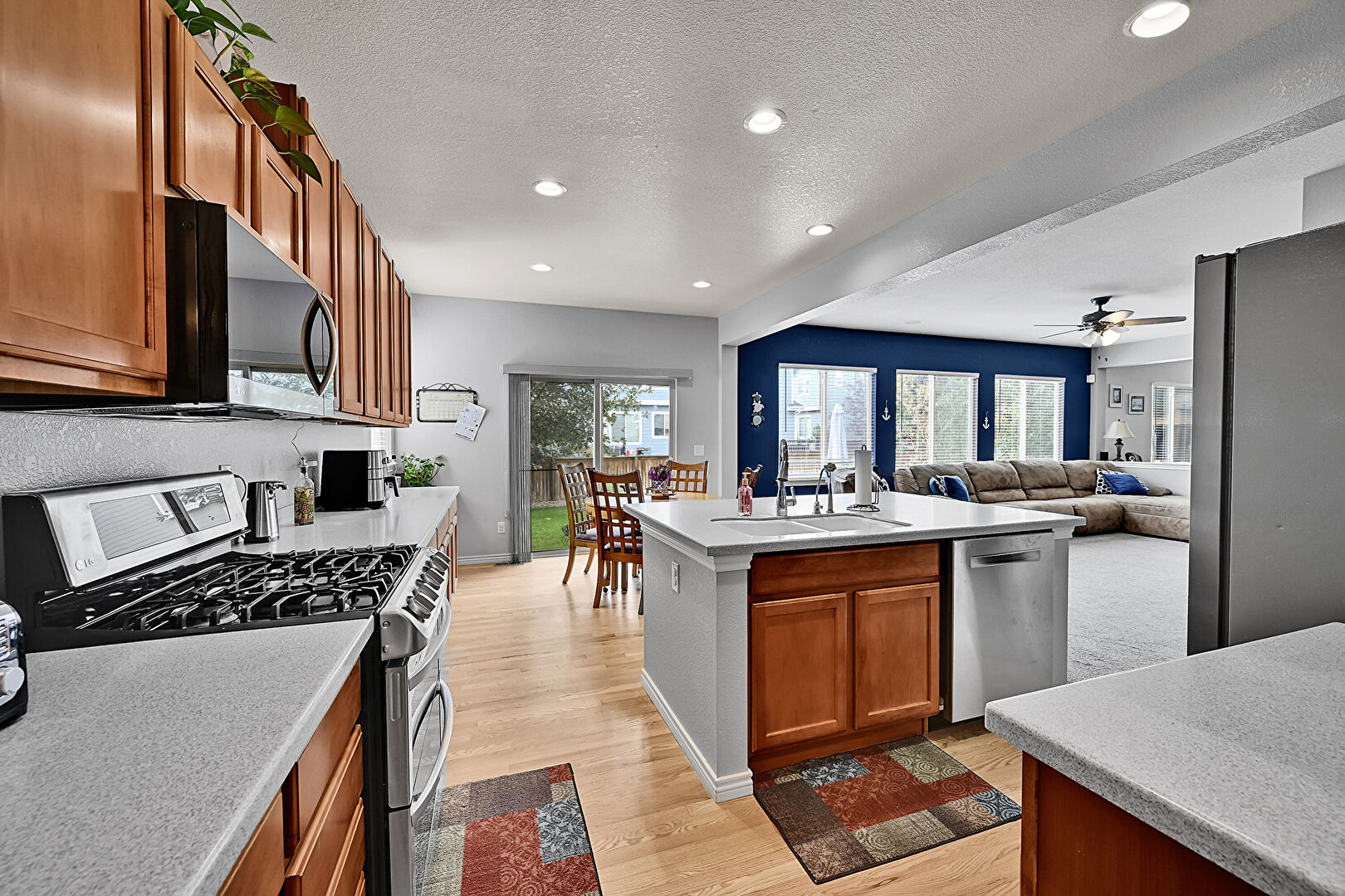 Baseboards Wall, Beamed Ceiling, Carpet, Ceiling Fan, Drywall, Fireplace, Kitchen Bar, Kitchen Island, L Shaped Kitchen, Medium Brown Cabinets, Natural Light, Opens To Living Area, Recessed Lighting, Shaker Cabinets, Stone Countertops, Textured Ceiling, Wood Finish Floor, Kitchen Bar, Kitchen Island, Opens To Living Area, Stone Countertops