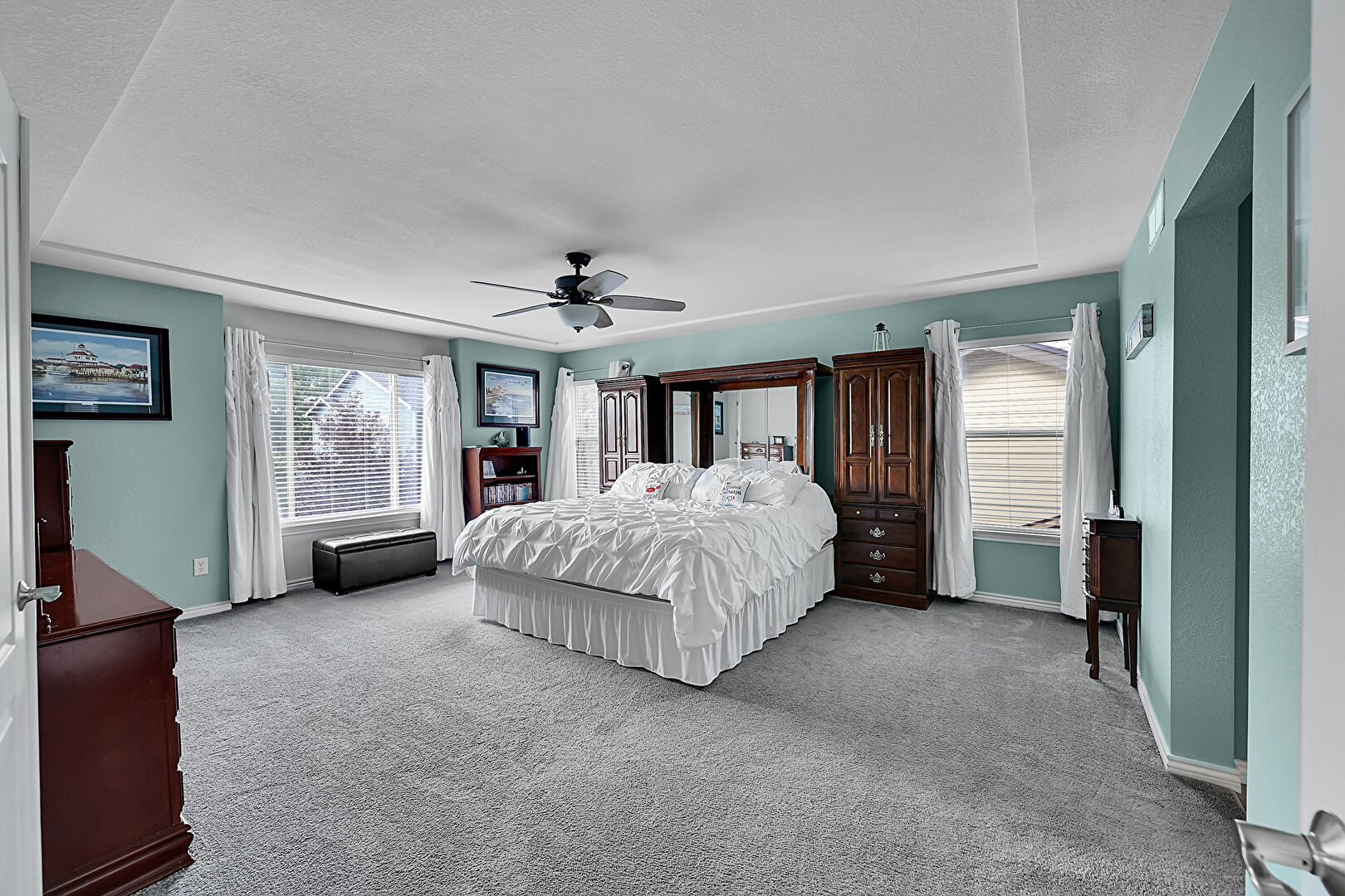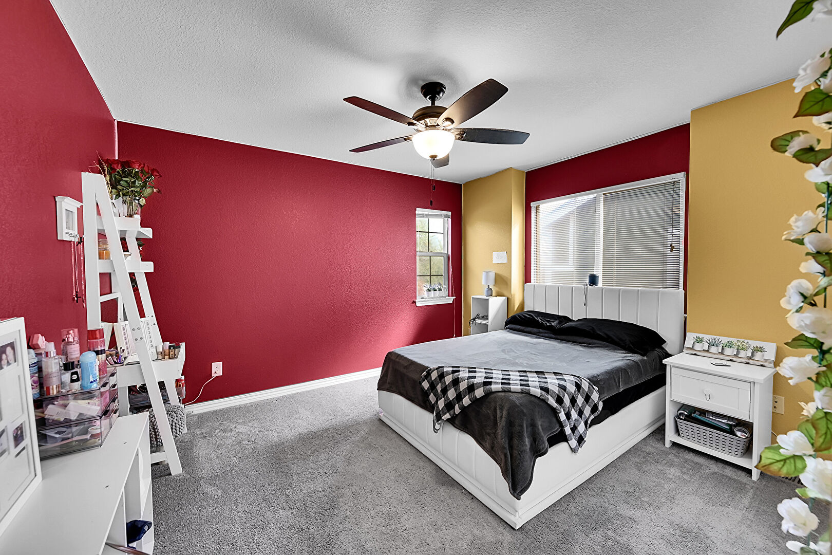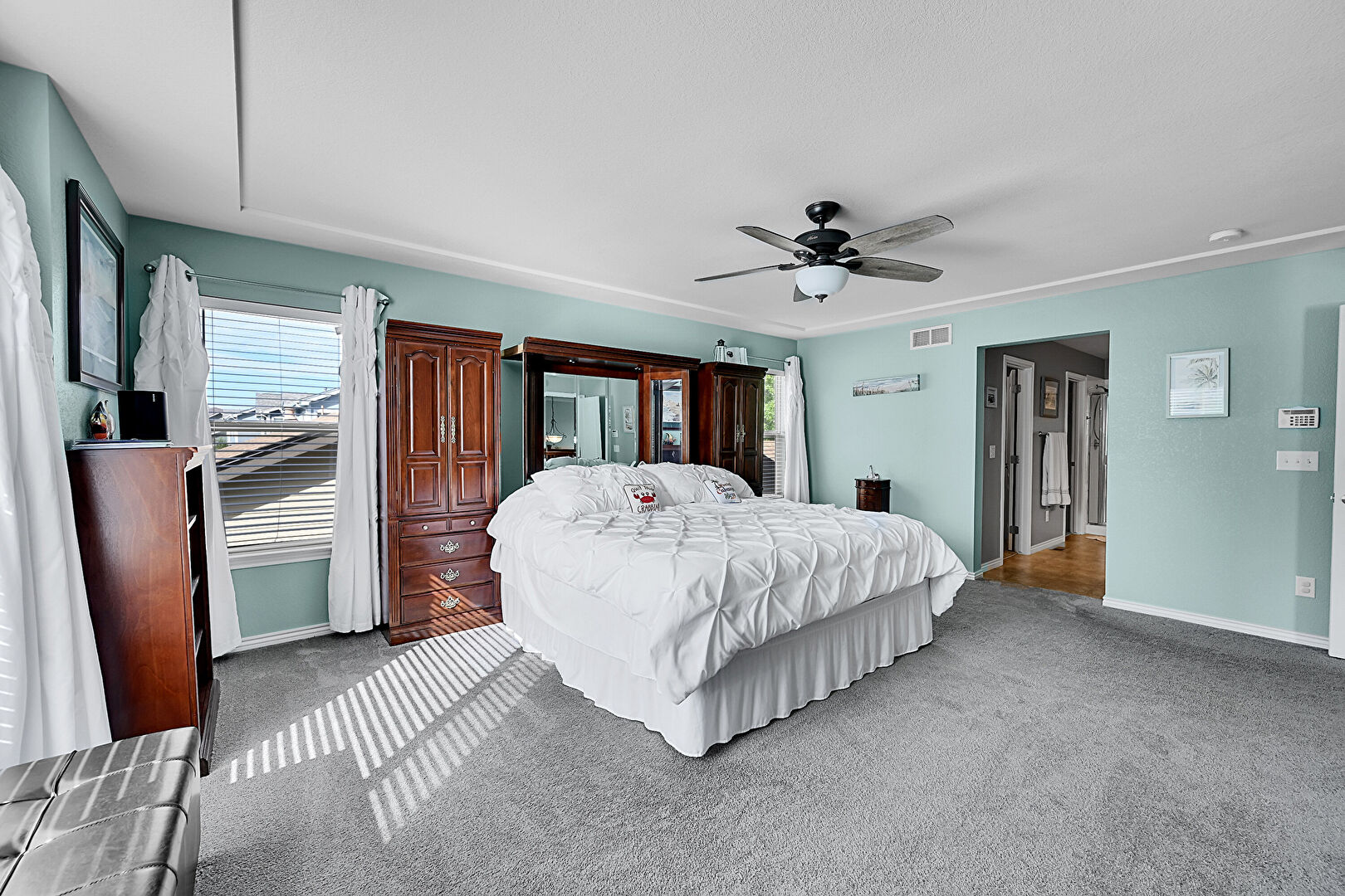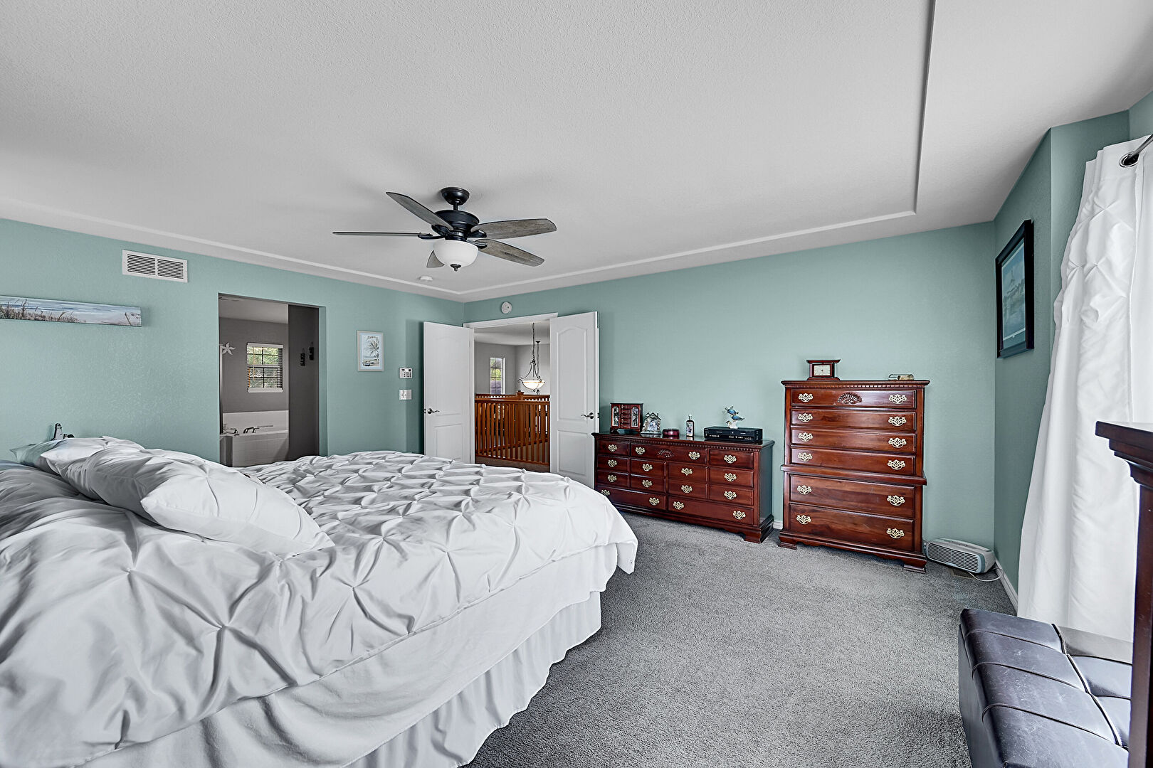 Baseboards Wall, Carpet, Ceiling Fan, Drywall, Ensuite Bathroom, Natural Light, Textured Ceiling, Vent, Baseboards Wall, Ceiling Fan, Drywall, Vent