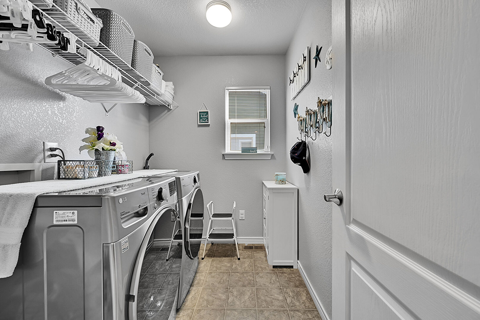 Baseboards Wall, Laundry, Natural Light, Textured Ceiling, Textured Wall, Washer Hookup, Tile Floor