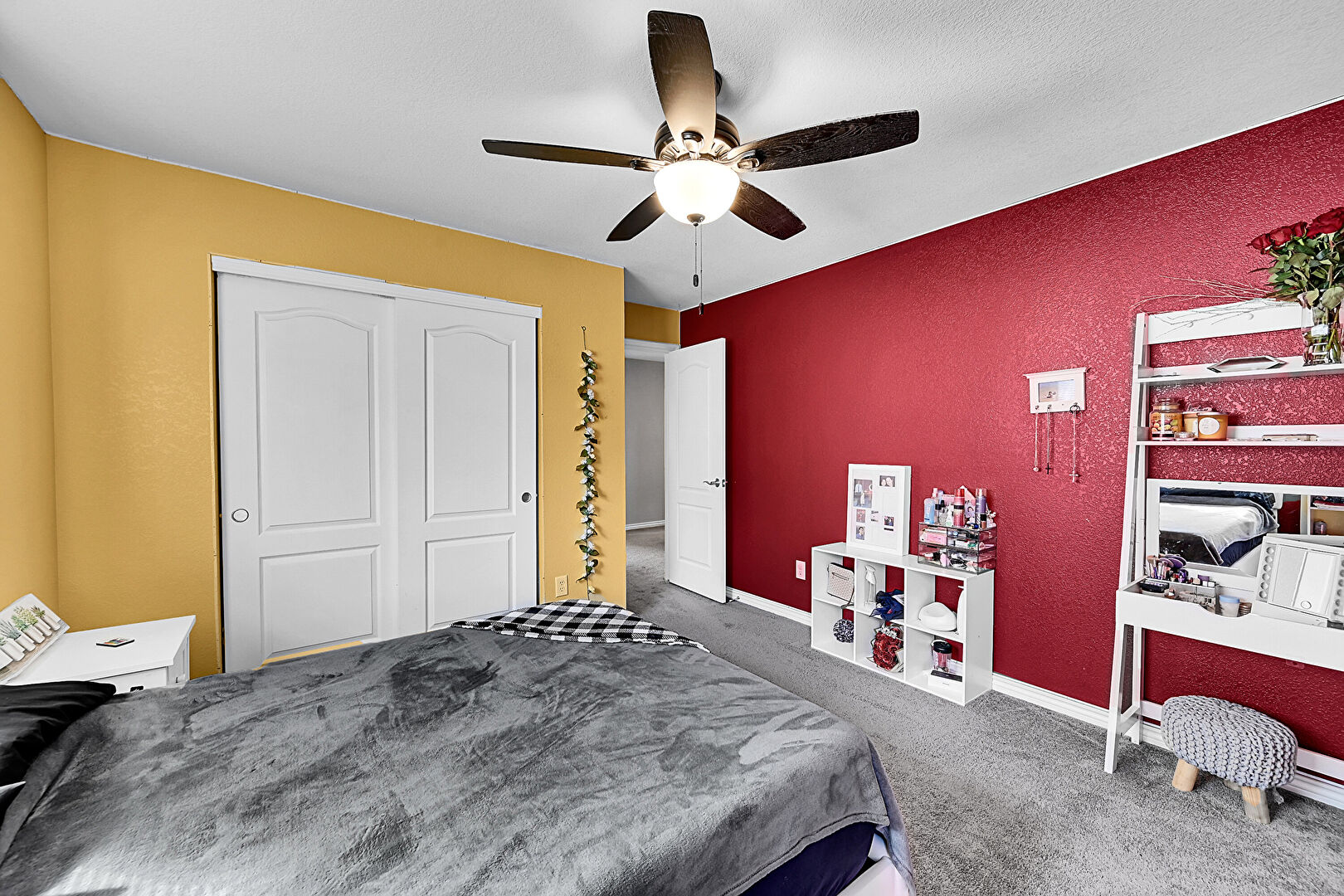 Baseboards Wall, Carpet, Ceiling Fan, Closet, Natural Light, Textured Ceiling, Textured Wall, Carpet, Drywall