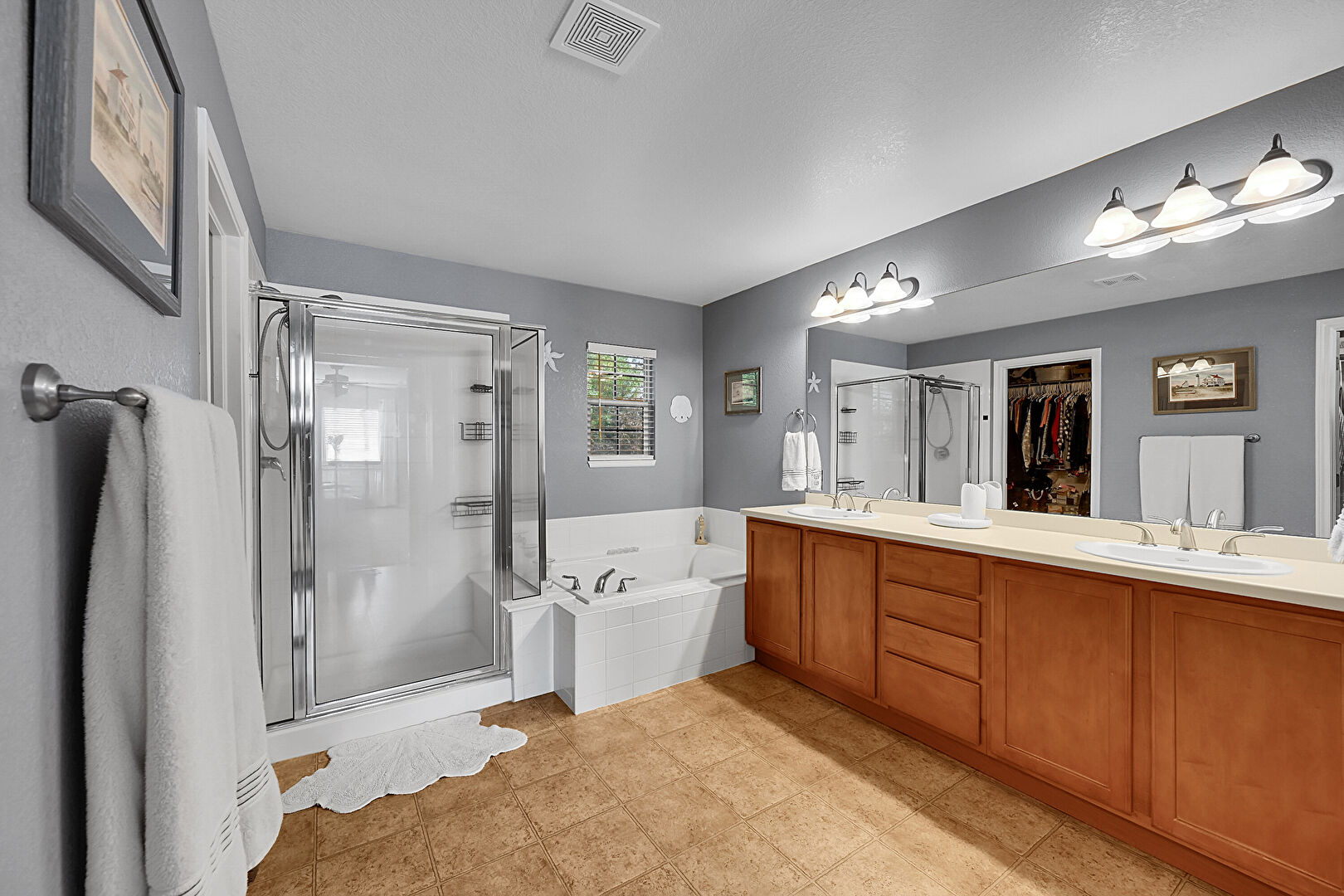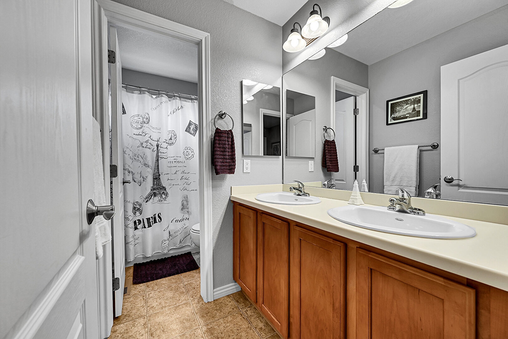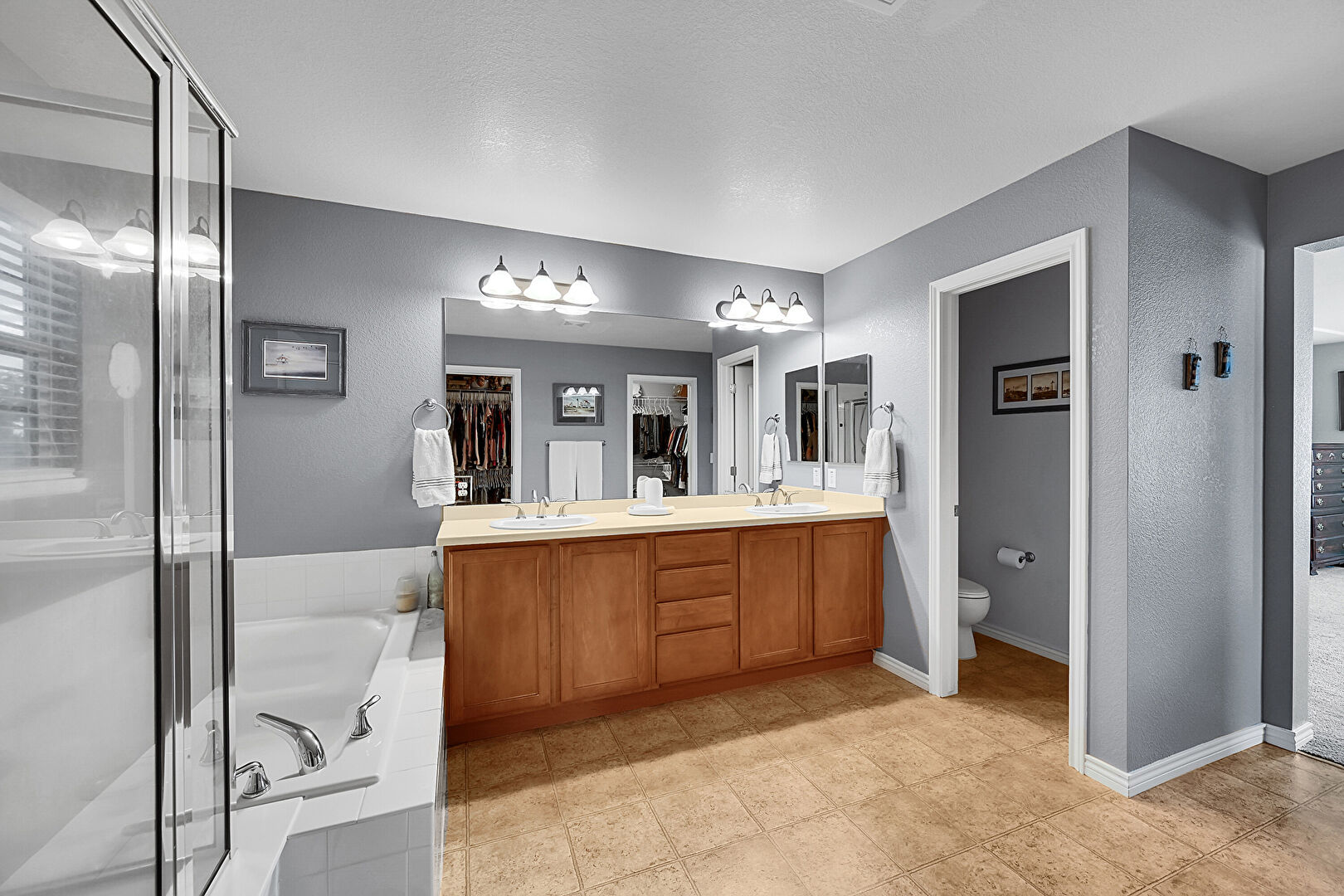 Baseboards Wall, Double Vanity, Drywall, Full Bathroom, Natural Light, Textured Ceiling, Tile Floor, Walk In Closet, Water Closet, Textured Wall, Vent