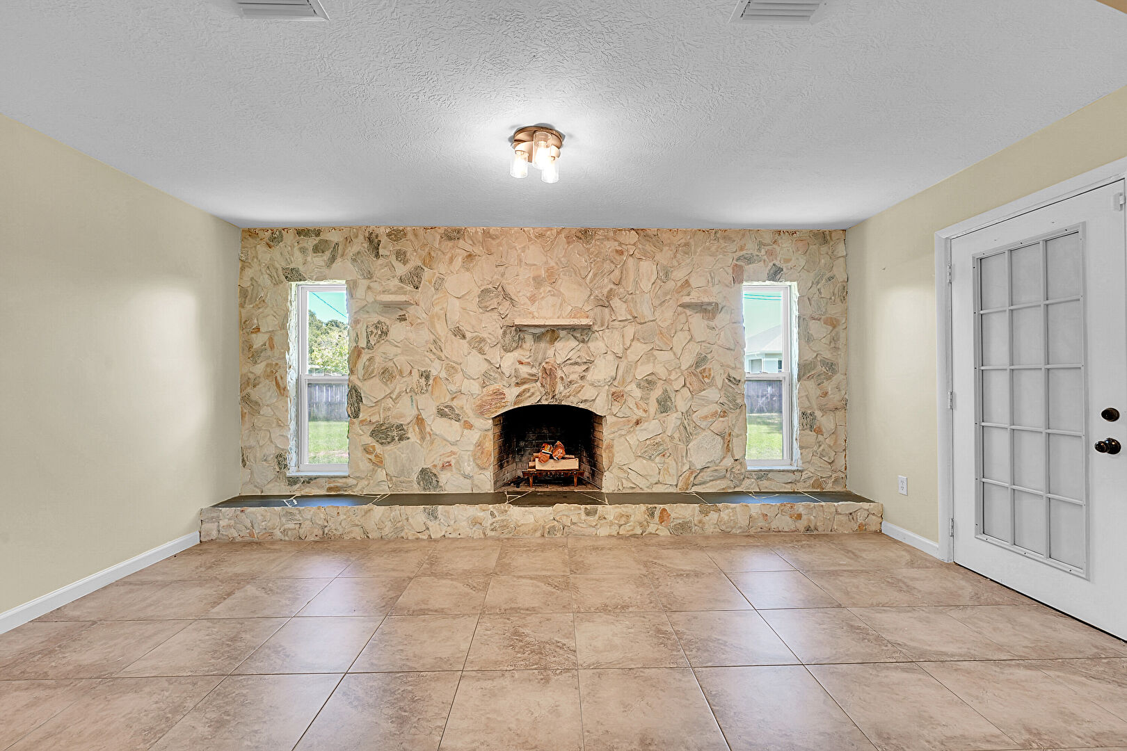 Baseboards Wall, Ceiling Fan, Drywall, Fireplace, High Ceiling, Natural Light, Notable Chandelier, Skylight, Textured Ceiling, Tile Floor, Vaulted Ceiling, Vent, Ceiling Fan, Natural Light, Stone Wall
