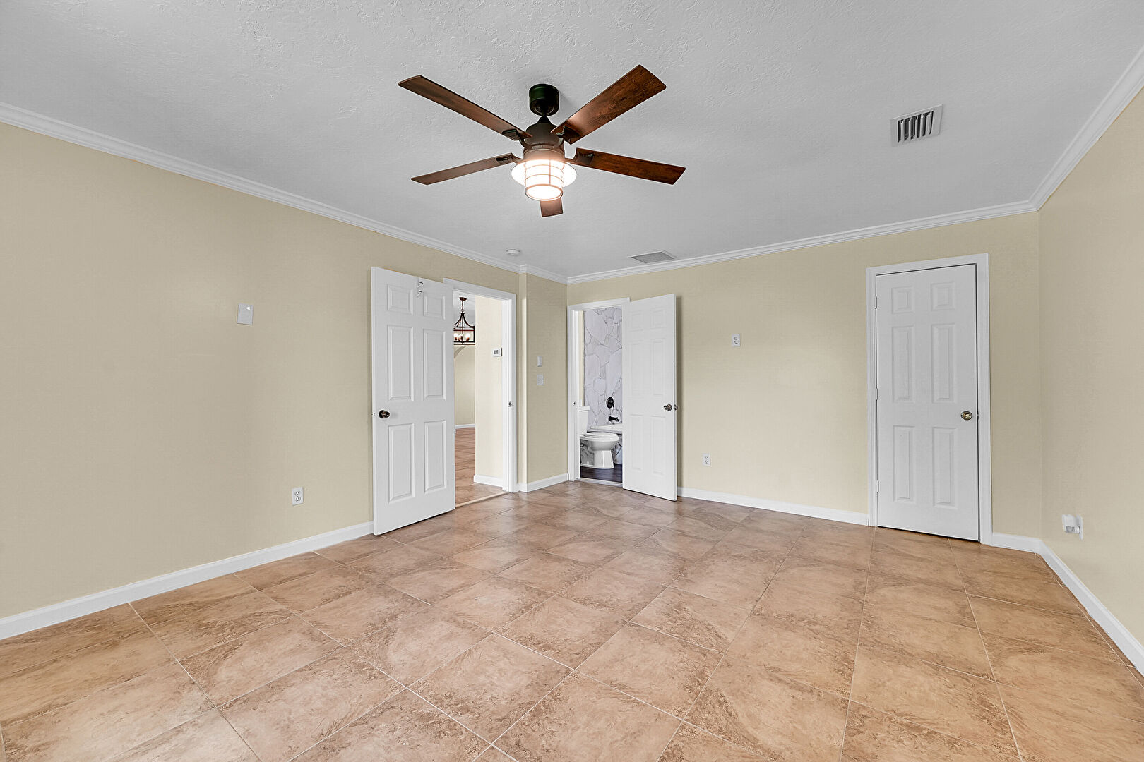 Baseboards Wall, Ceiling Fan, Crown Molding, Drywall, Ensuite Bathroom, Natural Light, Textured Ceiling, Tile Floor, Vent, Baseboards Wall, Tile Floor