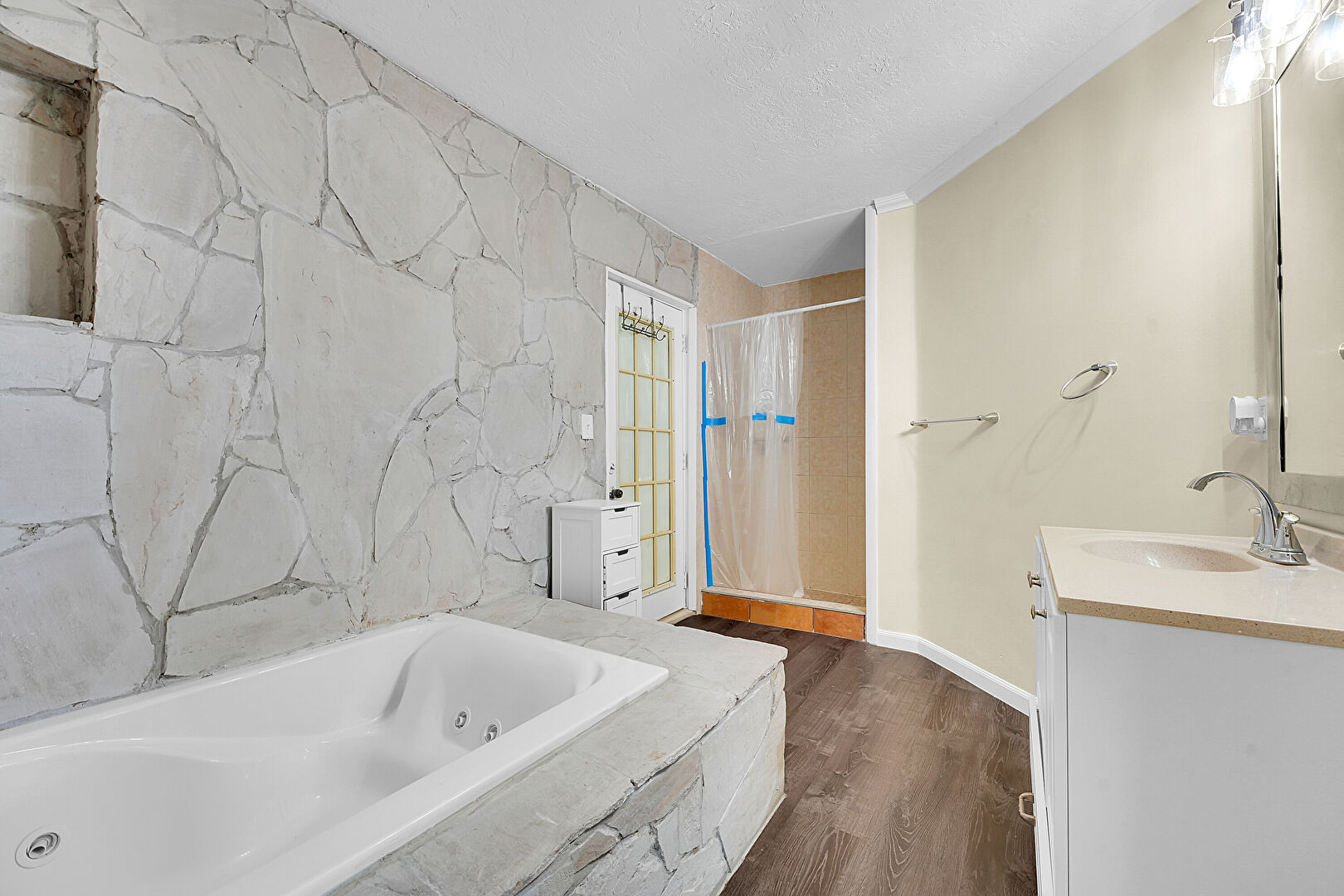 Baseboards Wall, Combined Bath Shower, Crown Molding, Drywall, Full Bathroom, Stone Wall, Textured Ceiling, Vanity, Vent, Wood Finish Floor, Textured Ceiling, Vanity, Wood Finish Floor
