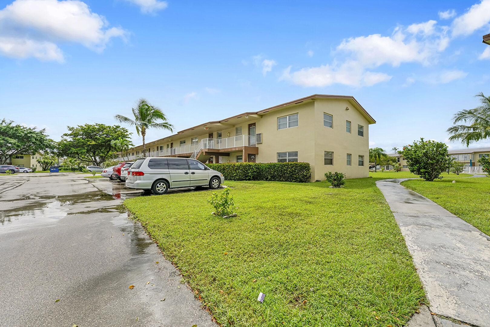 Parking Lot, Stucco Siding, Lawn