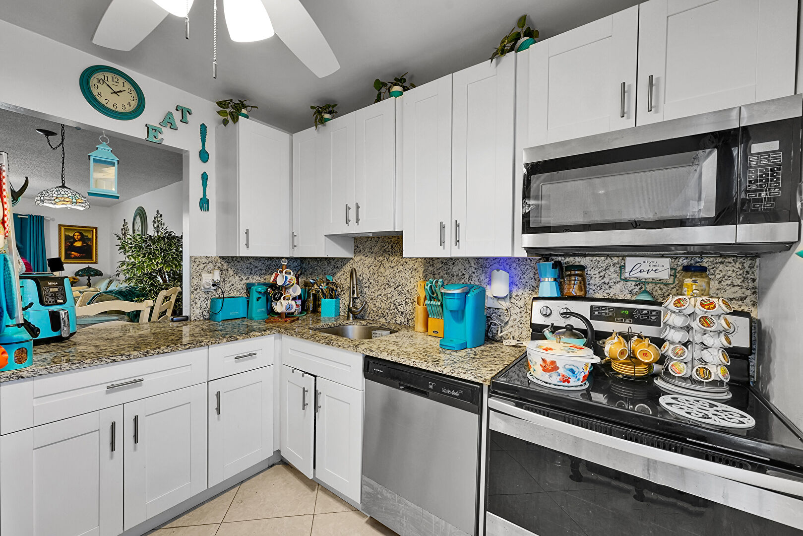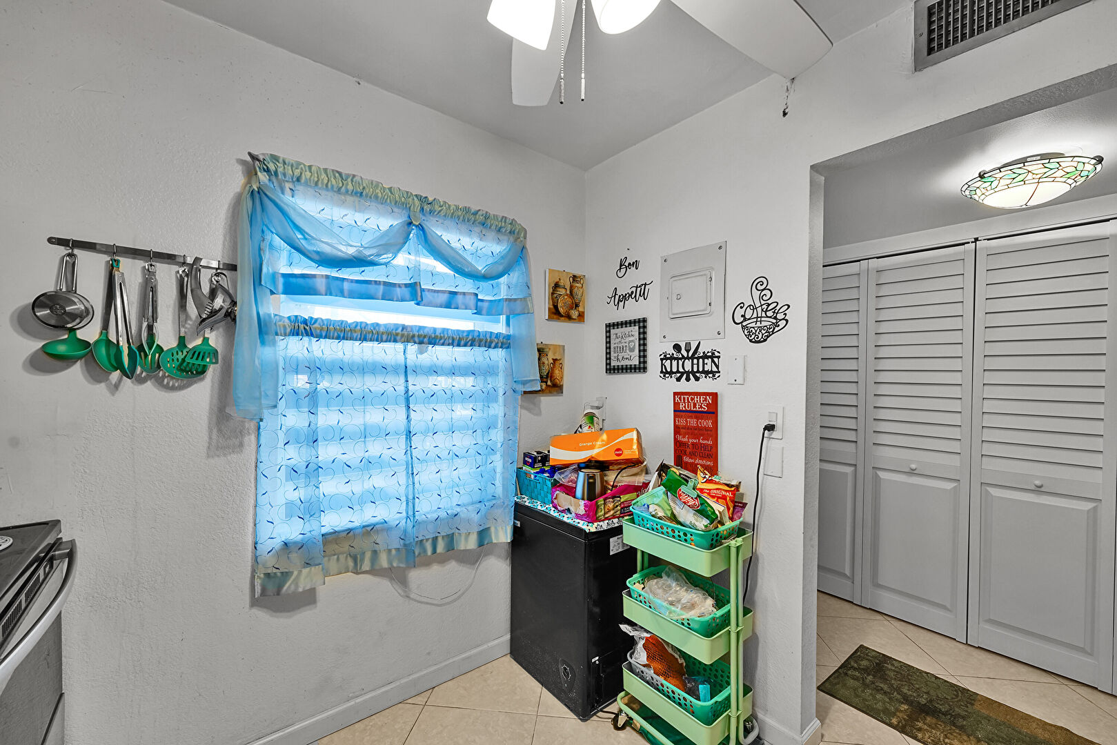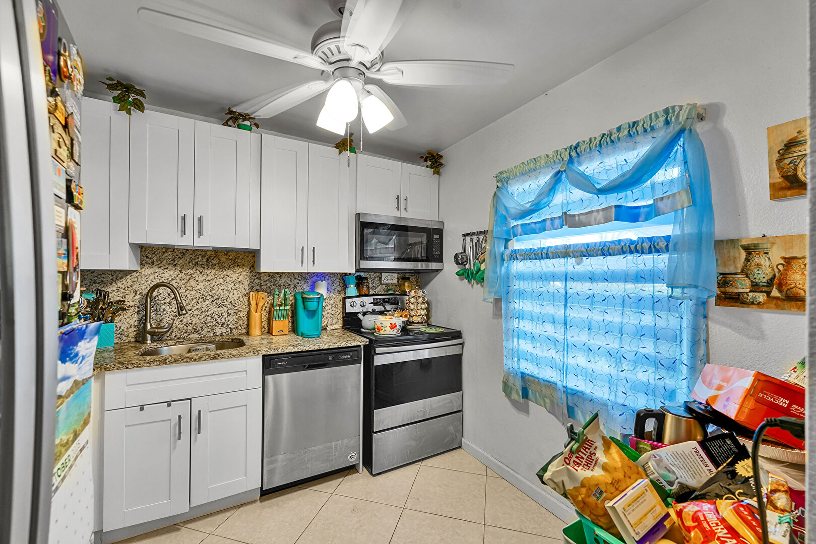 Baseboards Wall, Ceiling Fan, Drywall, Natural Light, Pass Through Window, Pendant Lighting, Shaker Cabinets, Stone Countertops, Tile Floor, Vent, Ceiling Fan, Drywall, Natural Light