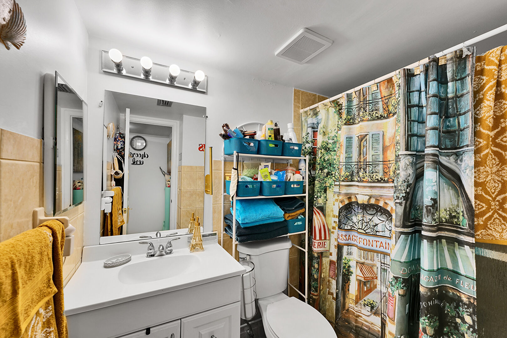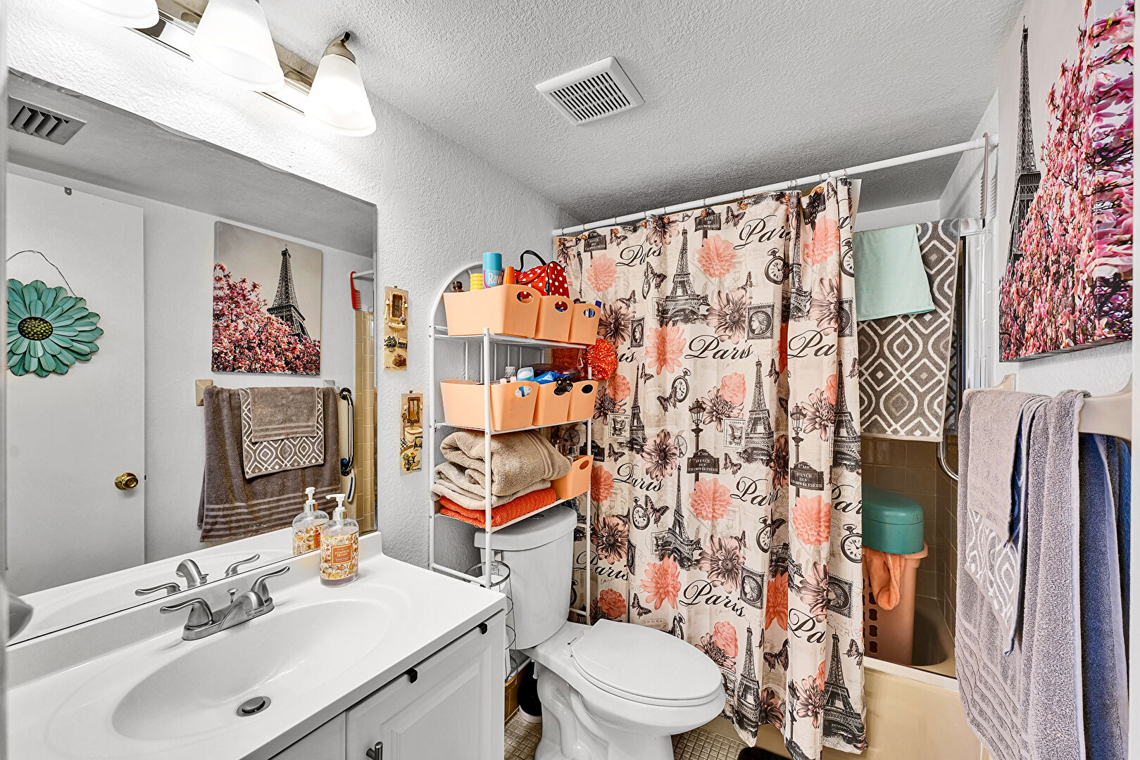 Combined Bath Shower, Drywall, Textured Ceiling, Textured Wall, Tile Wall, Vanity, Vent, Full Bathroom