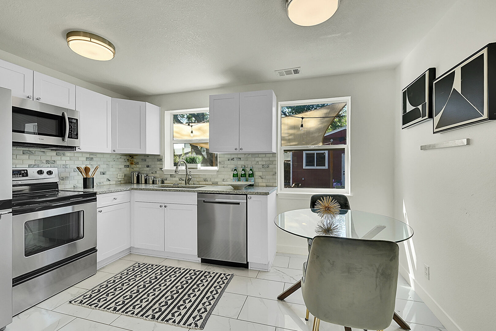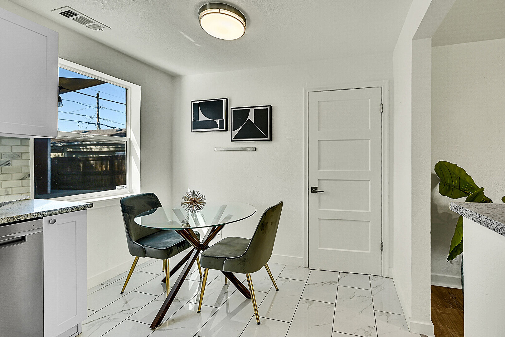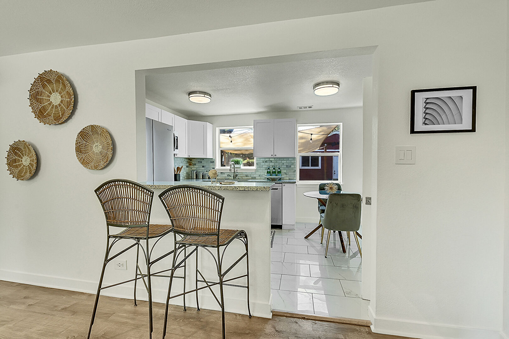 Baseboards Wall, Drywall, Kitchen Bar, L Shaped Kitchen, Natural Light, Shaker Cabinets, Stone Countertops, Tile Floor, U Shaped Kitchen, Vent, Wood Finish Floor, Kitchen Peninsula, Marble Finish Floor, Vent