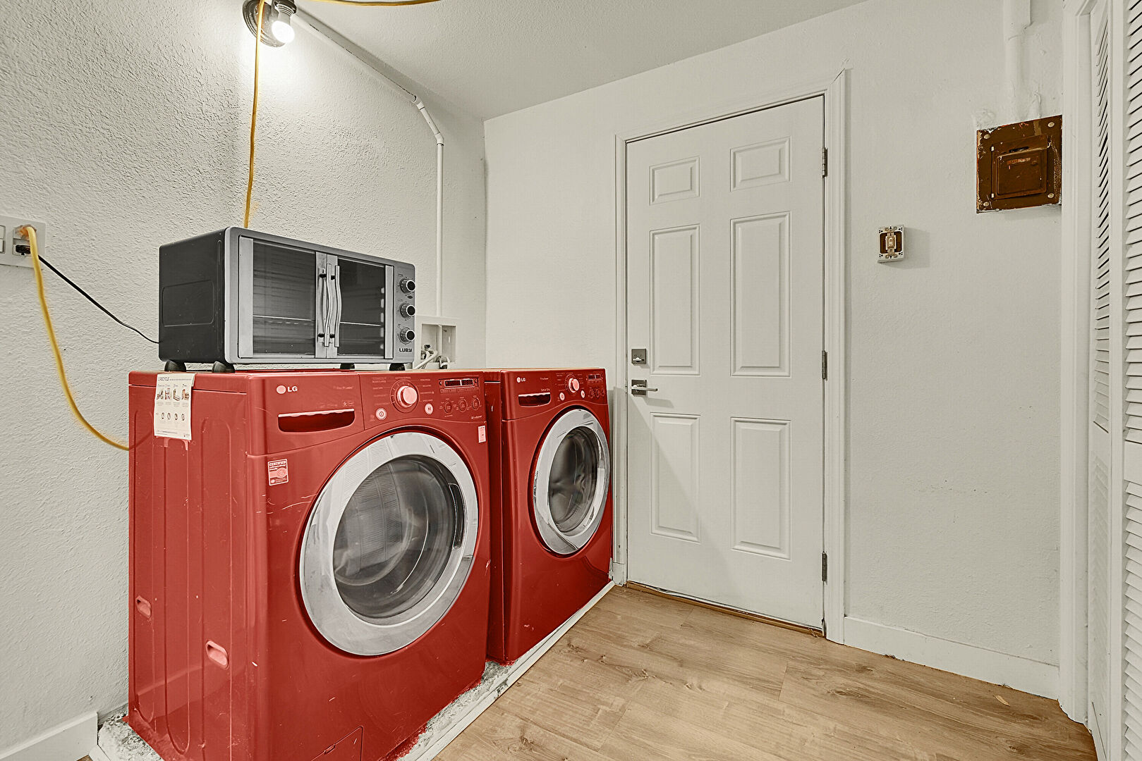 Laundry, Textured Wall, Wood Finish Floor, Baseboards Wall