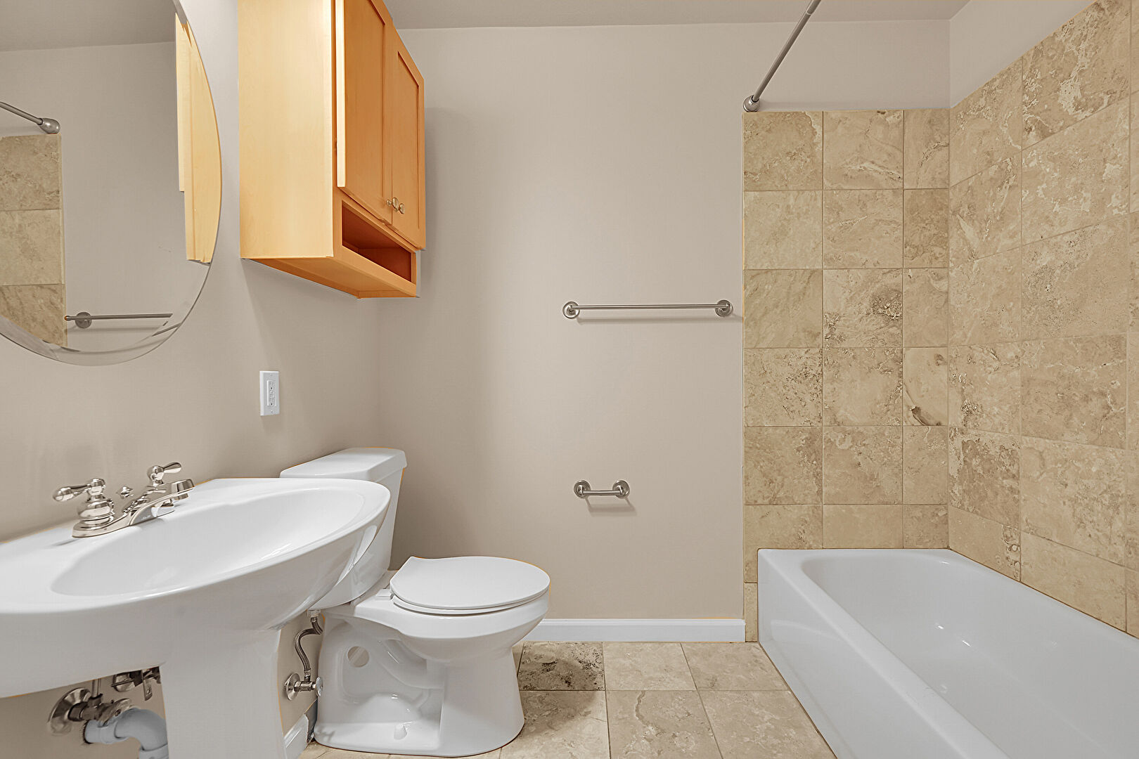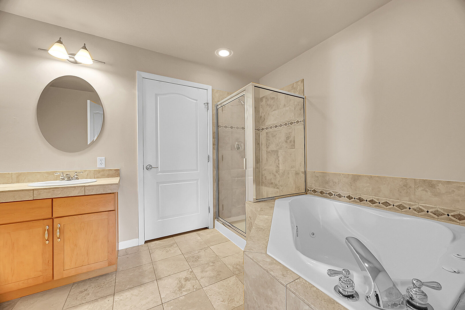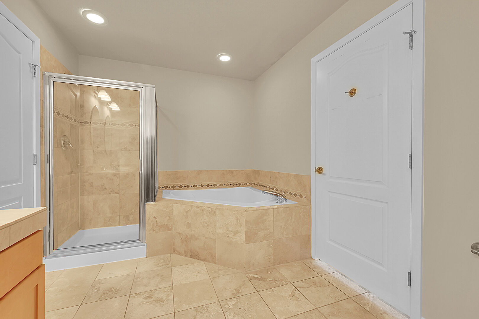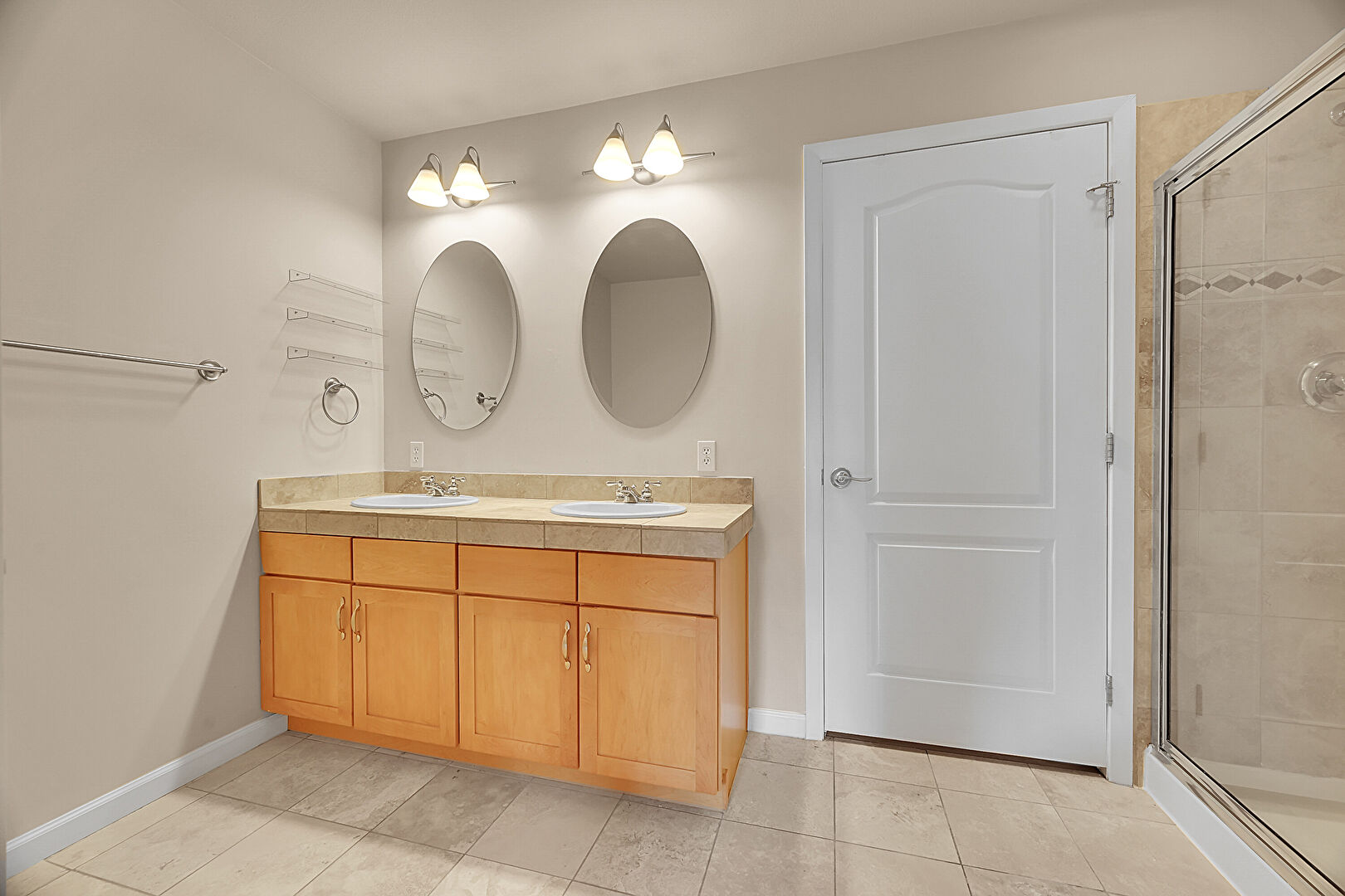 Baseboards Wall, Drywall, Full Bathroom, Recessed Lighting, Tile Floor, Vanity, Baseboards Wall, Double Vanity, Full Bathroom