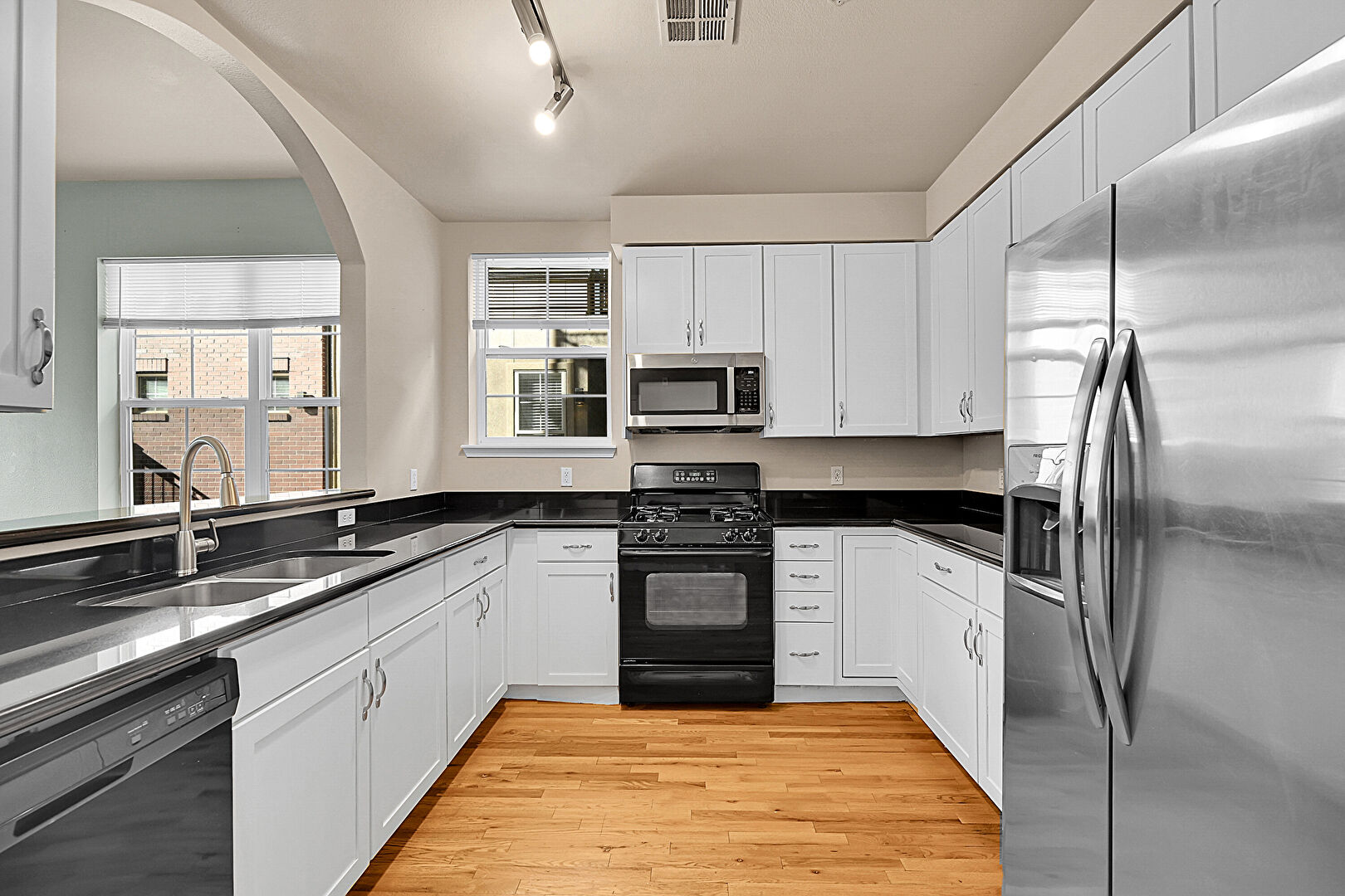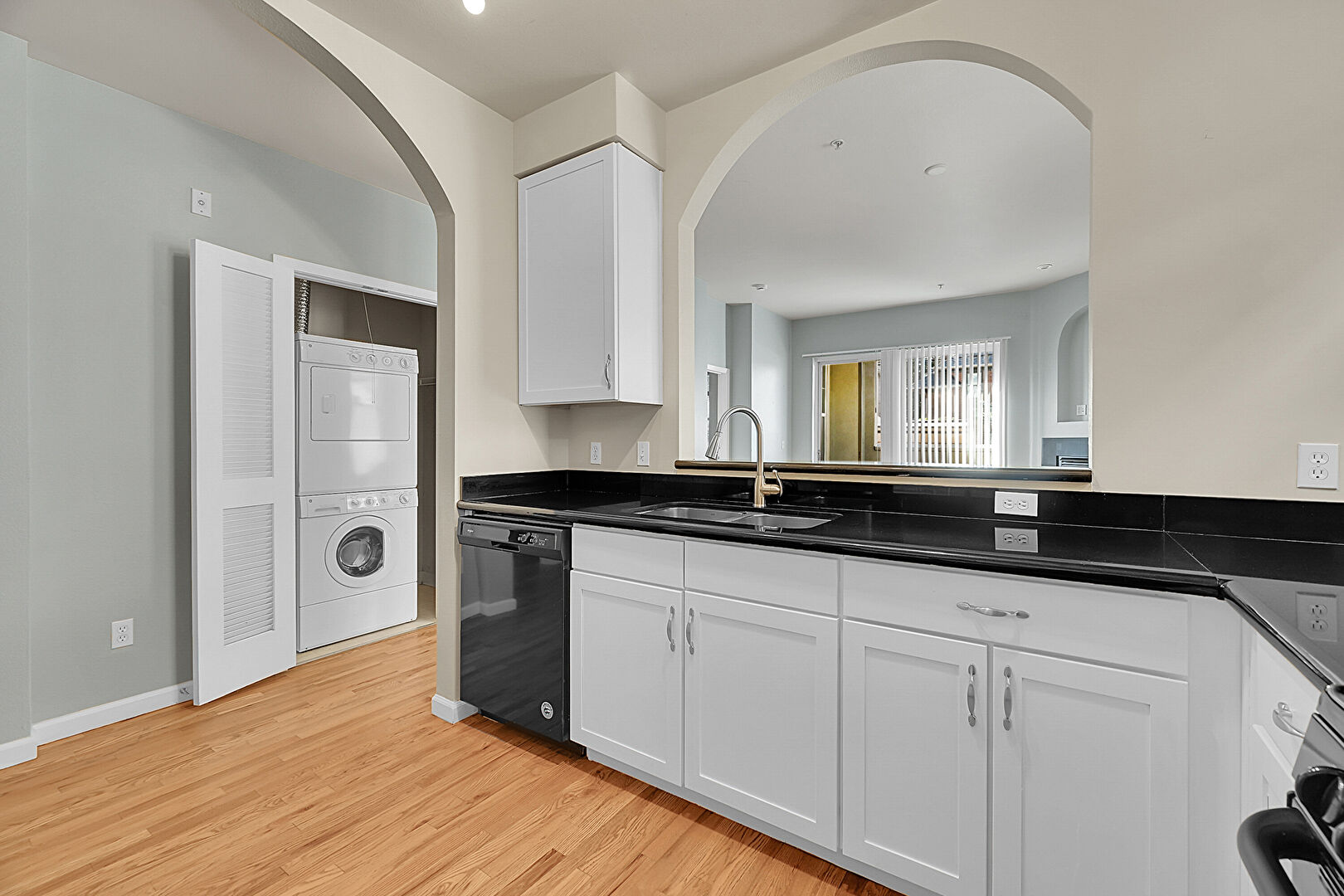 Arched Walkways, Baseboards Wall, Drywall, Laundry, Natural Light, Pass Through Window, Recessed Lighting, Shaker Cabinets, Stone Countertops, Track Lighting, Wood Finish Floor, Drywall, Vent