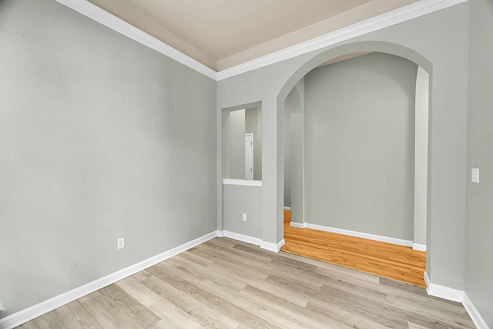 Arched Walkways, Baseboards Wall, Crown Molding, Drywall, Natural Light, Wood Finish Floor, Crown Molding, Natural Light