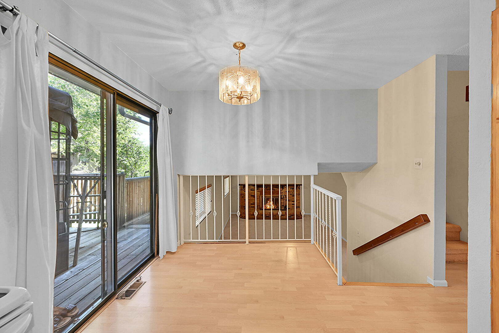 Baseboards Wall, Drywall, Natural Light, Notable Chandelier, Textured Ceiling, Vent, Wood Finish Floor, Baseboards Wall, Notable Chandelier, Stairs
