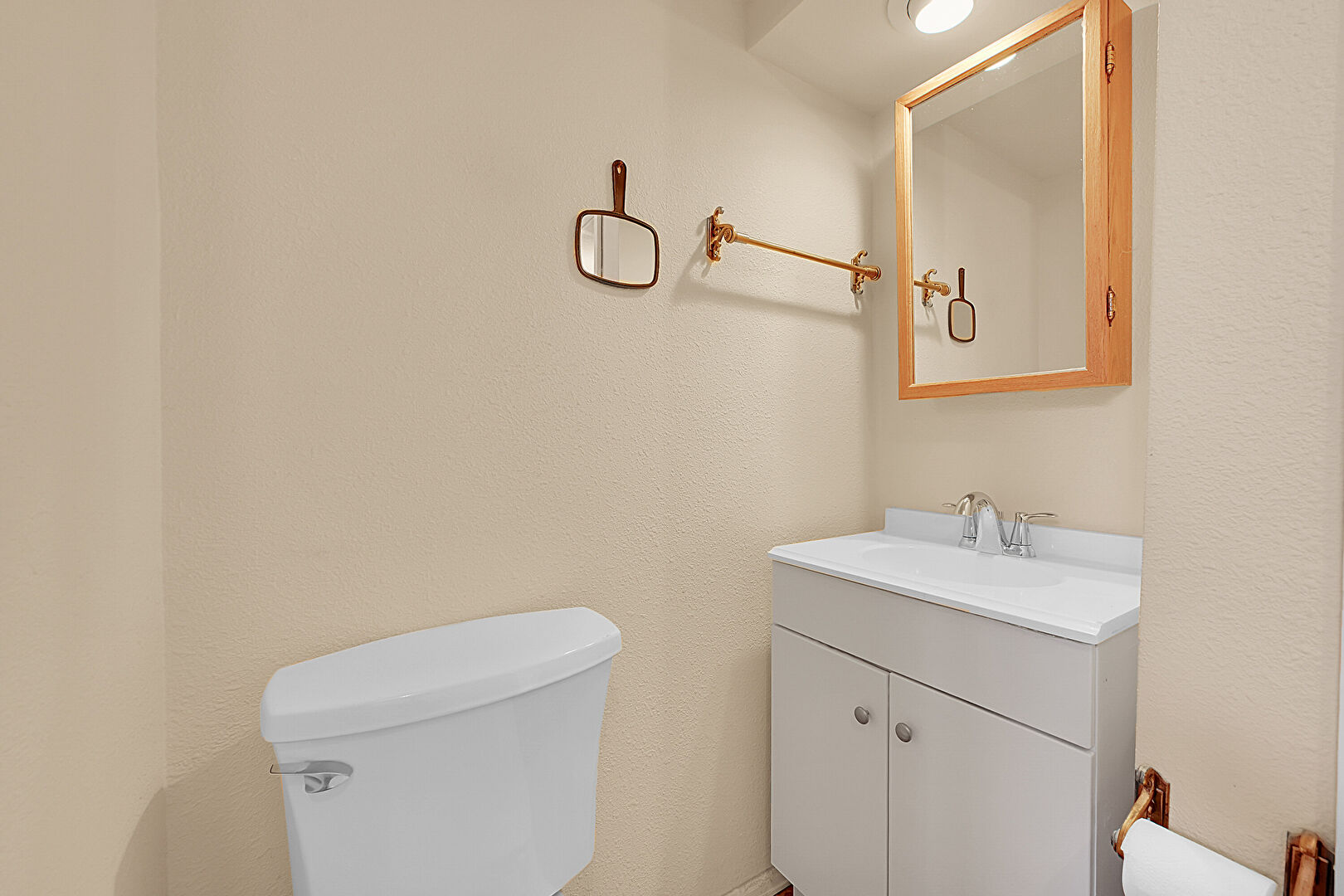 Baseboards Wall, Combined Bath Shower, Full Bathroom, Natural Light, Tile Floor, Vanity, Vinyl Floor, Drywall