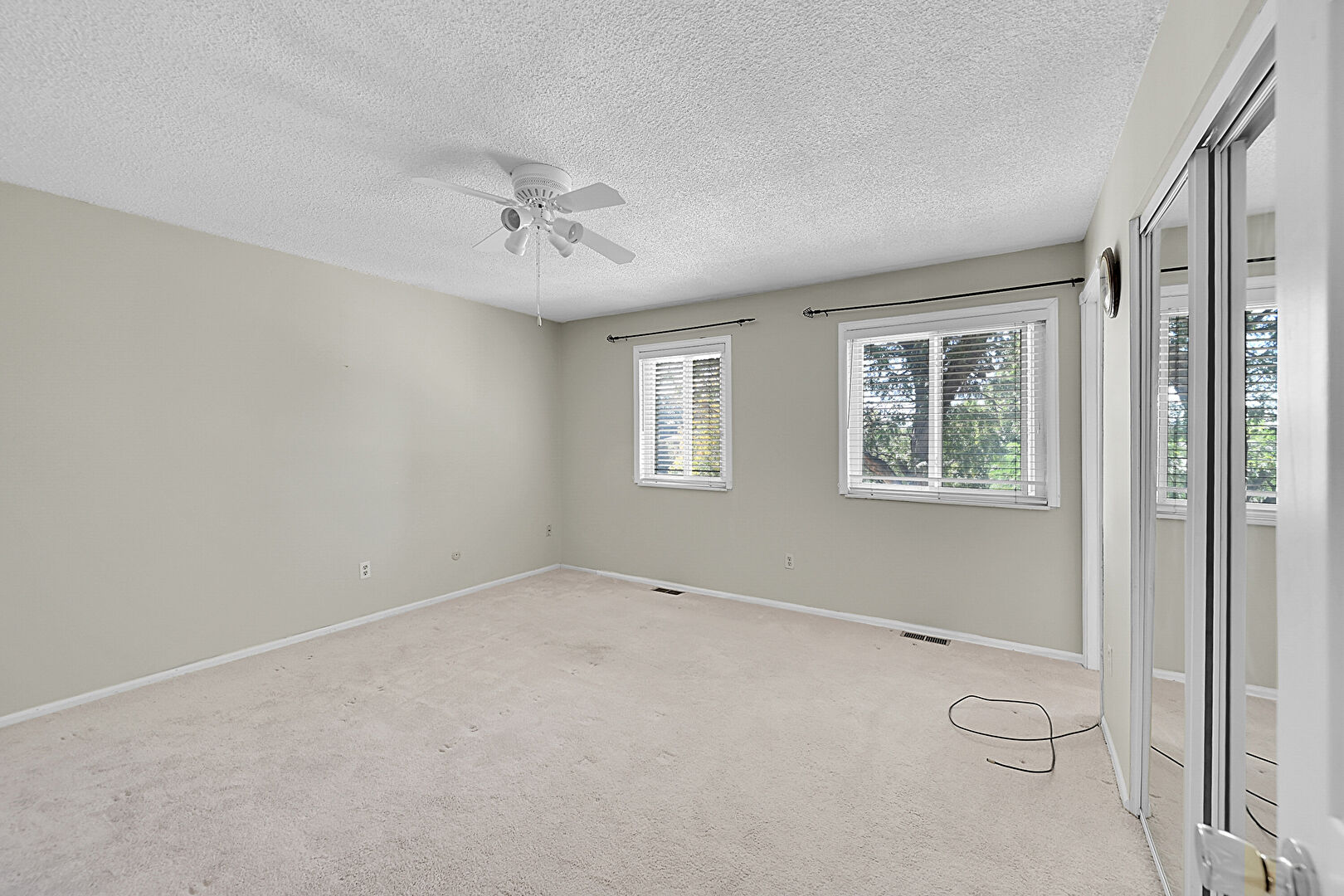 Baseboards Wall, Carpet, Ceiling Fan, Closet, Drywall, Ensuite Bathroom, Natural Light, Textured Ceiling, Two Closets, Vent, Carpet, Ceiling Fan, Textured Ceiling