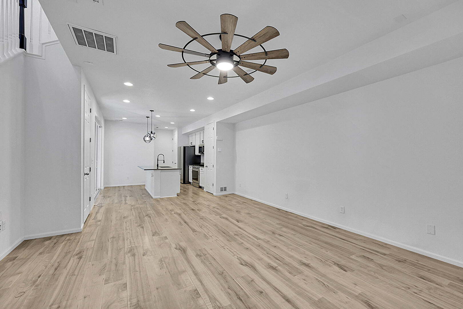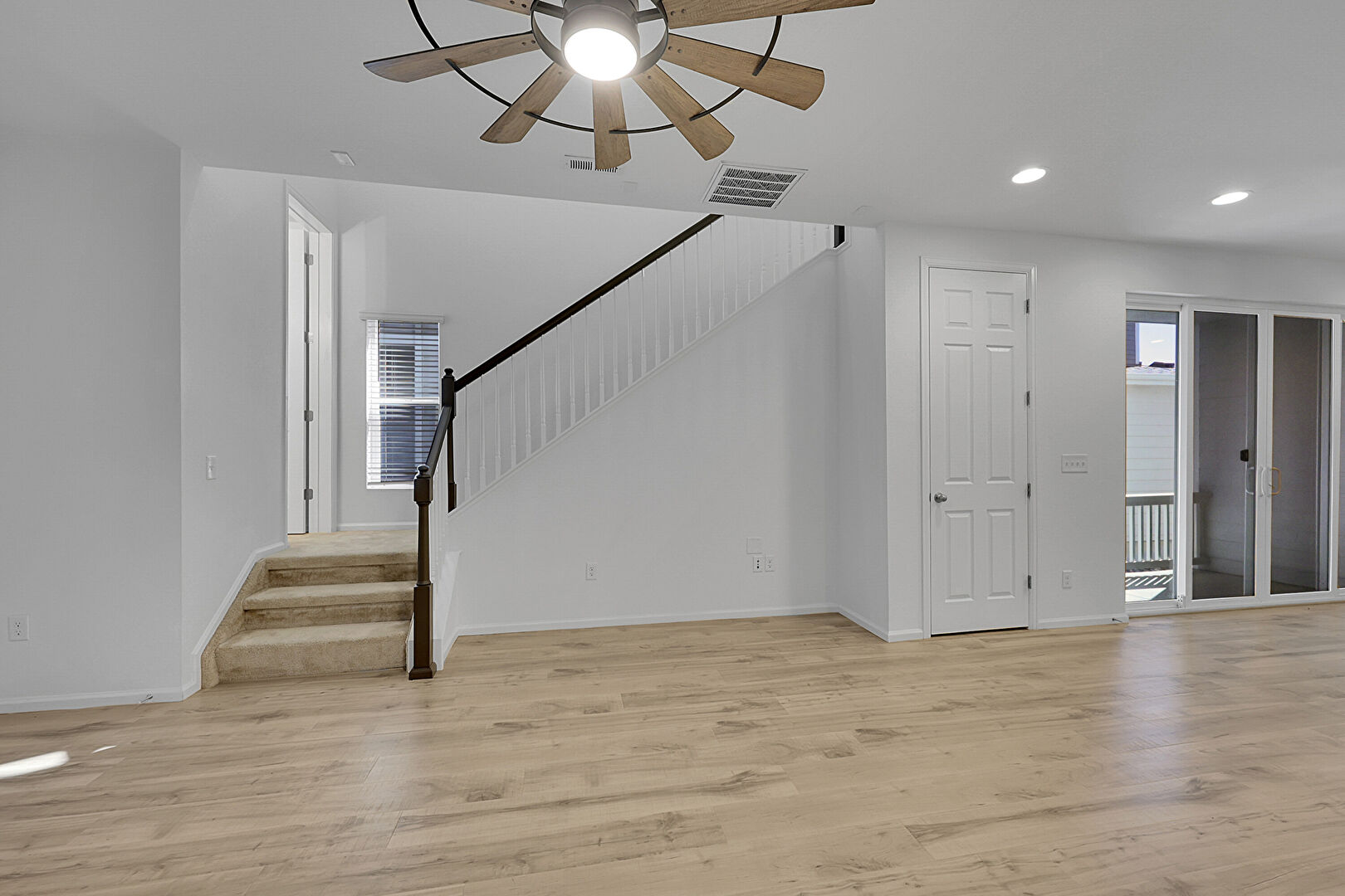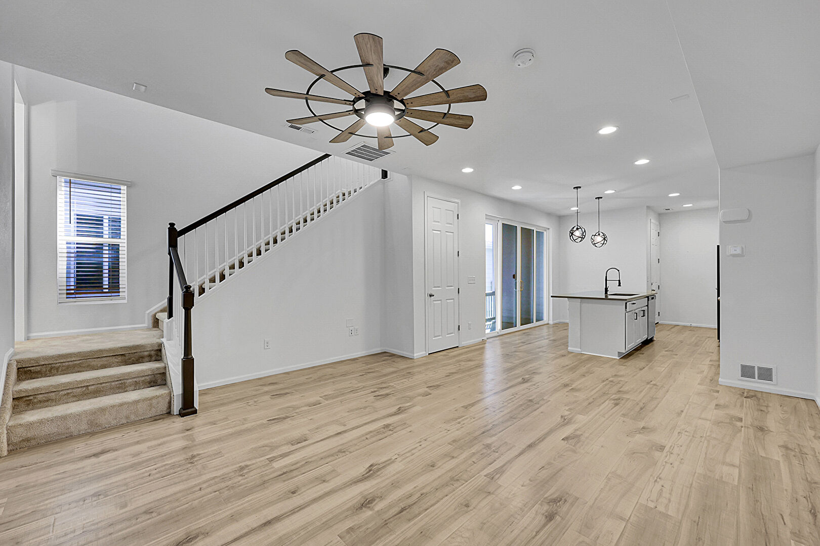 Baseboards Wall, Ceiling Fan, Drywall, Natural Light, One Wall Kitchen, Recessed Lighting, Stairs, Vent, Wood Finish Floor, Ceiling Fan, Natural Light, Recessed Lighting, Stairs