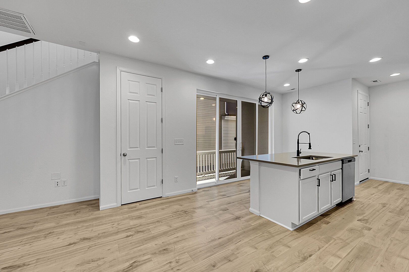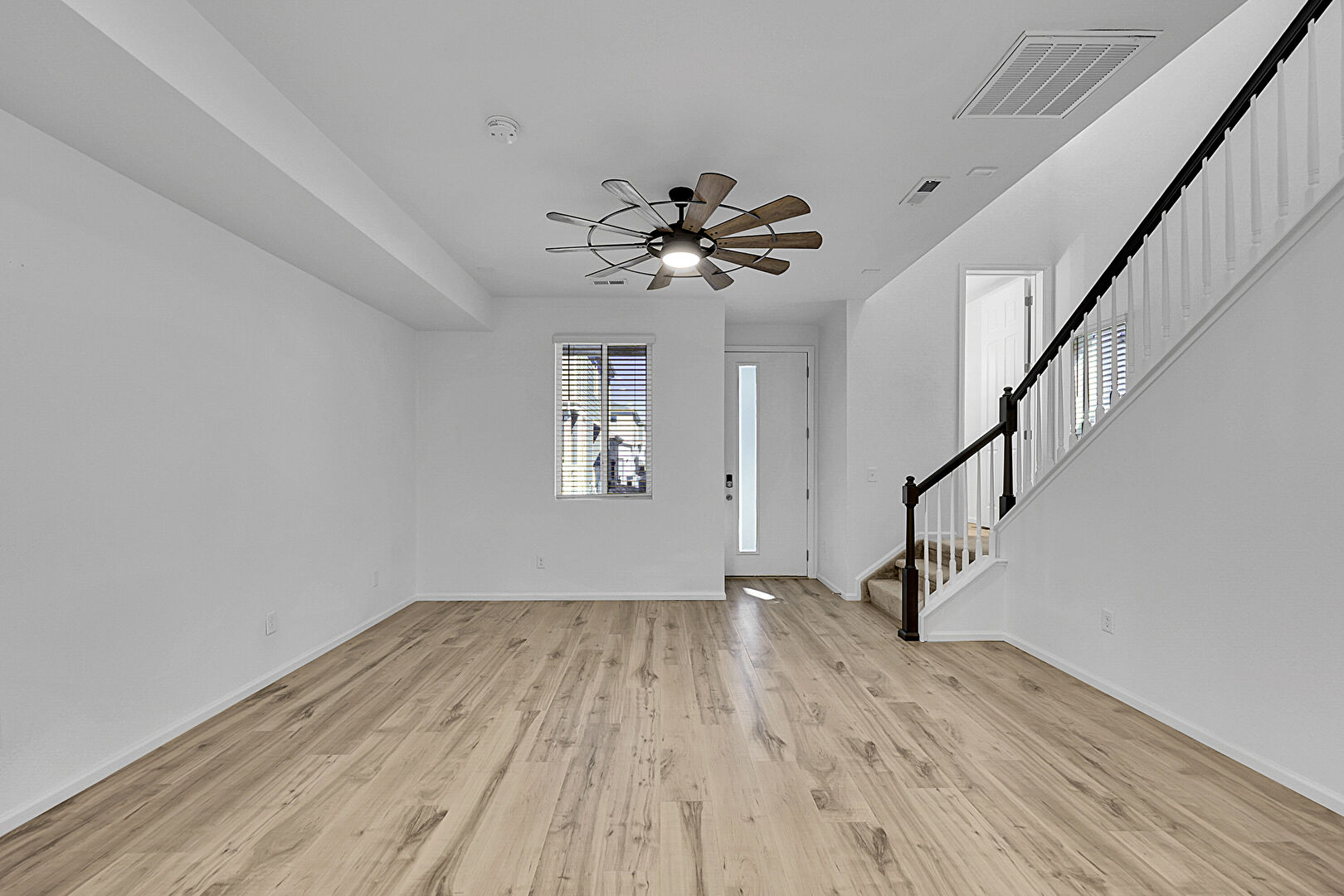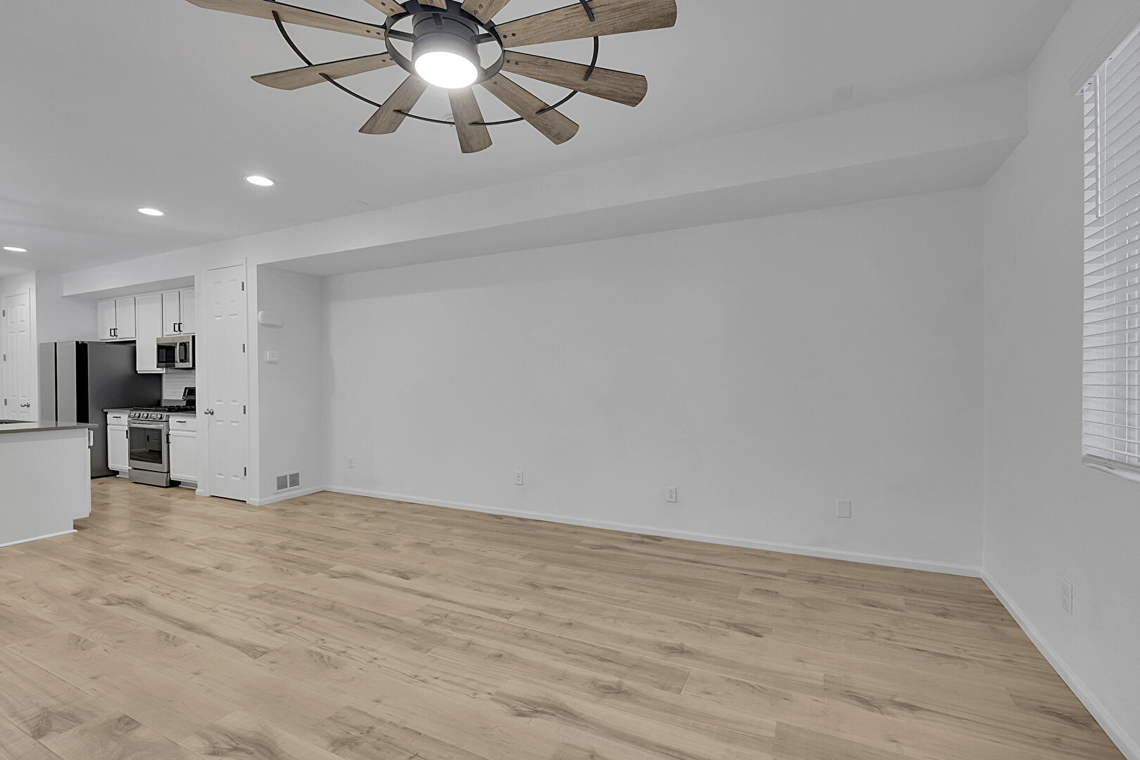 Baseboards Wall, Ceiling Fan, Drywall, Natural Light, One Wall Kitchen, Recessed Lighting, Stairs, Vent, Wood Finish Floor, Ceiling Fan, Natural Light, Recessed Lighting, Stairs