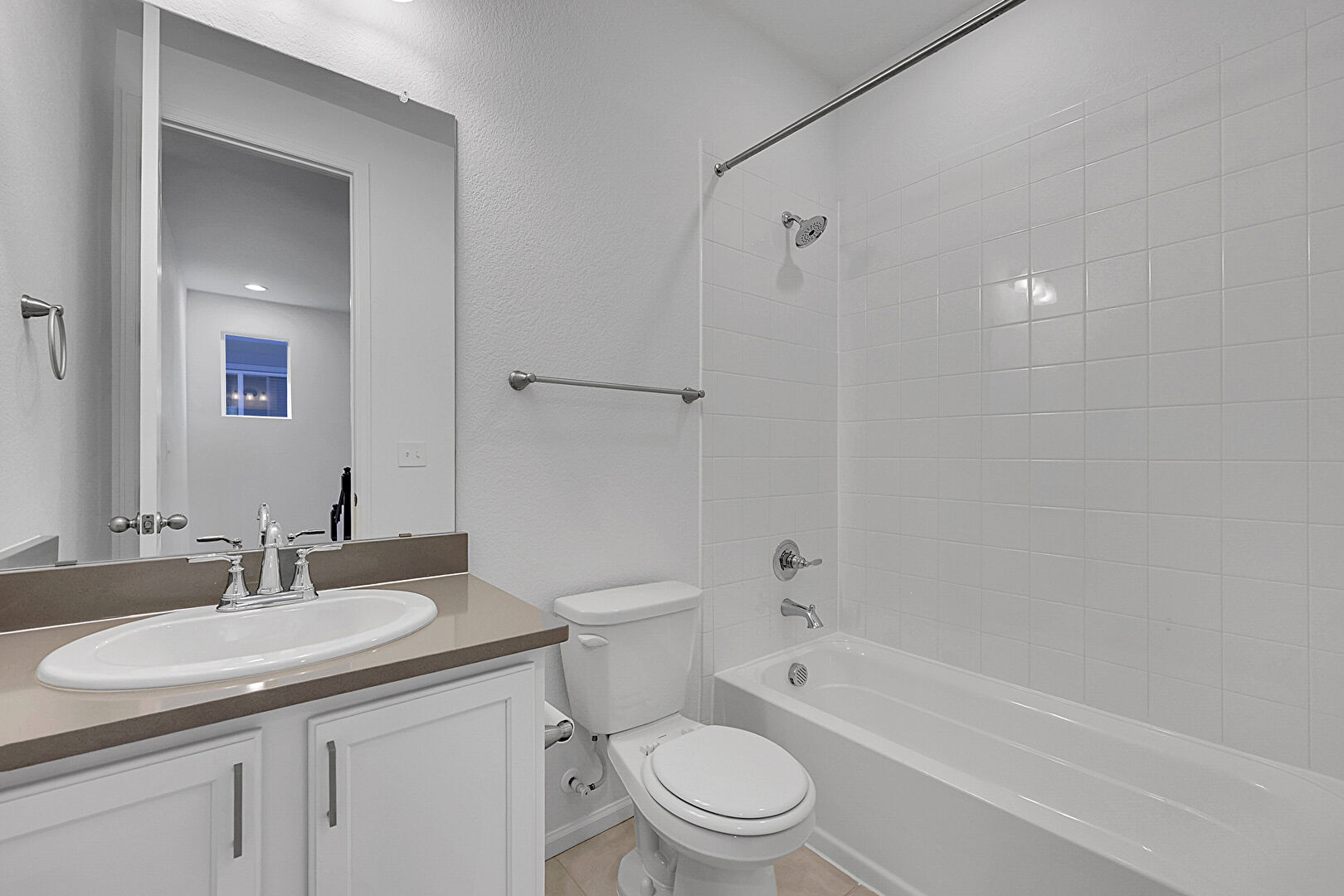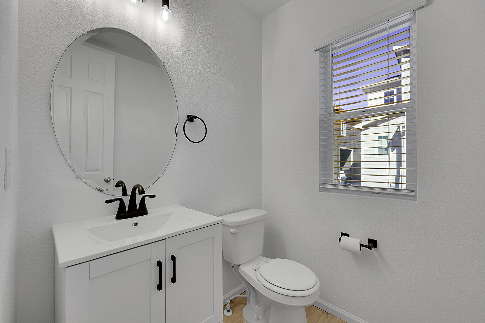 Baseboards Wall, Combined Bath Shower, Full Bathroom, Half Bathroom, Natural Light, Textured Wall, Vanity, Wood Finish Floor, Tile Floor, Vanity