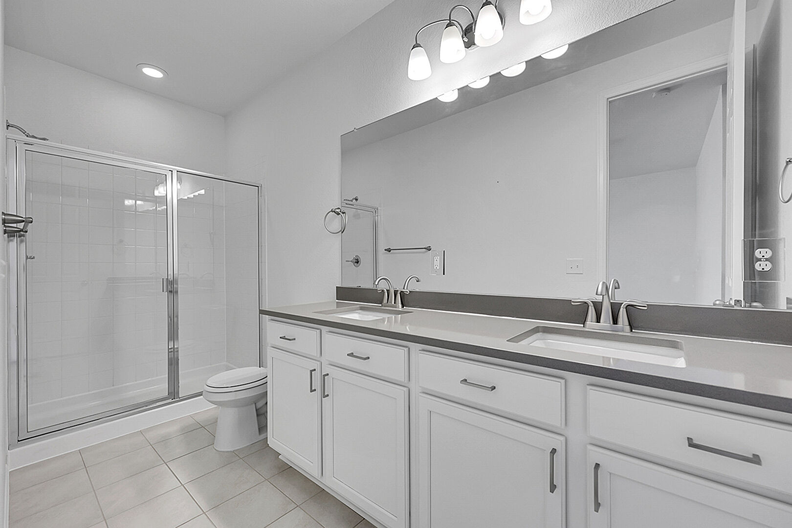 Drywall, Full Bathroom, Recessed Lighting, Tile Floor, Double Vanity