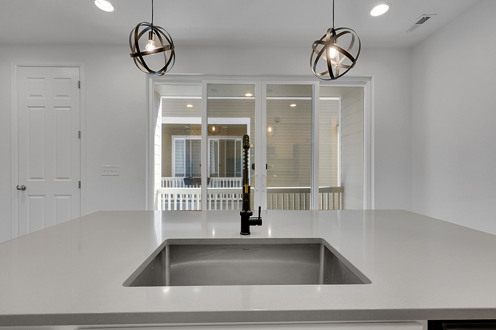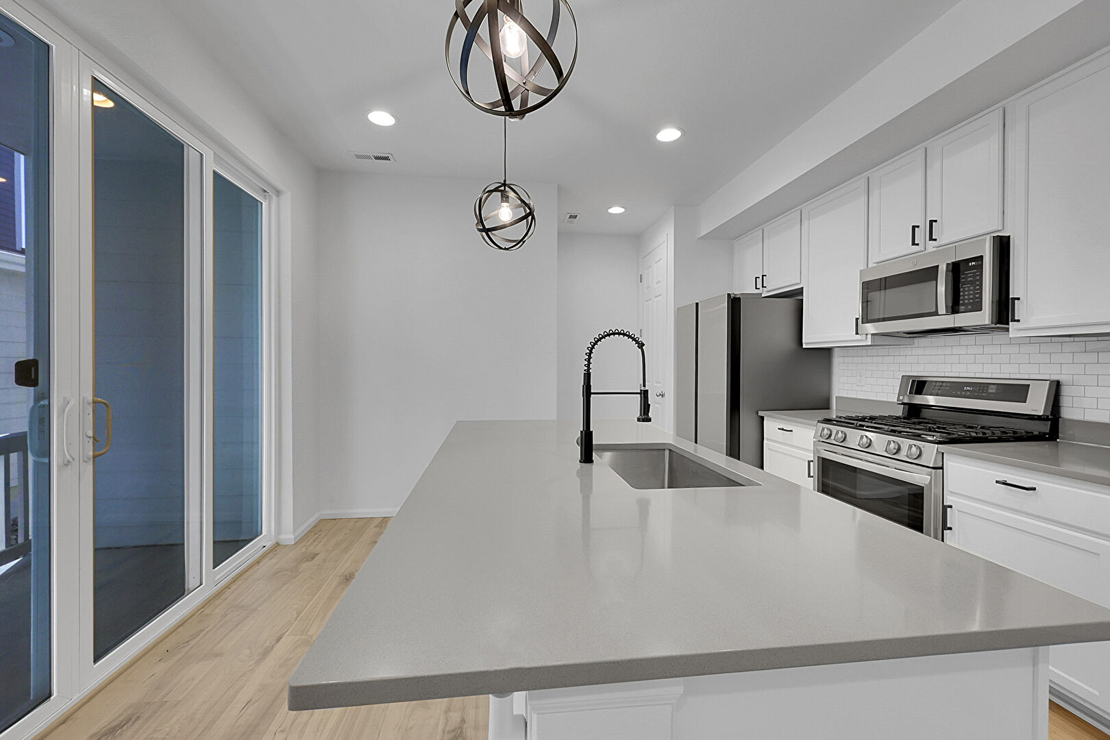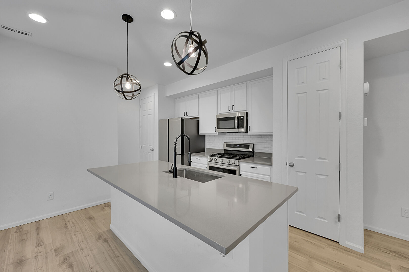 Baseboards Wall, Ceiling Fan, Drywall, Kitchen Bar, Kitchen Island, Natural Light, One Wall Kitchen, Pendant Lighting, Recessed Lighting, Shaker Cabinets, Stone Countertops, Vent, Wood Finish Floor, Baseboards Wall, Drywall, Pendant Lighting, Vent