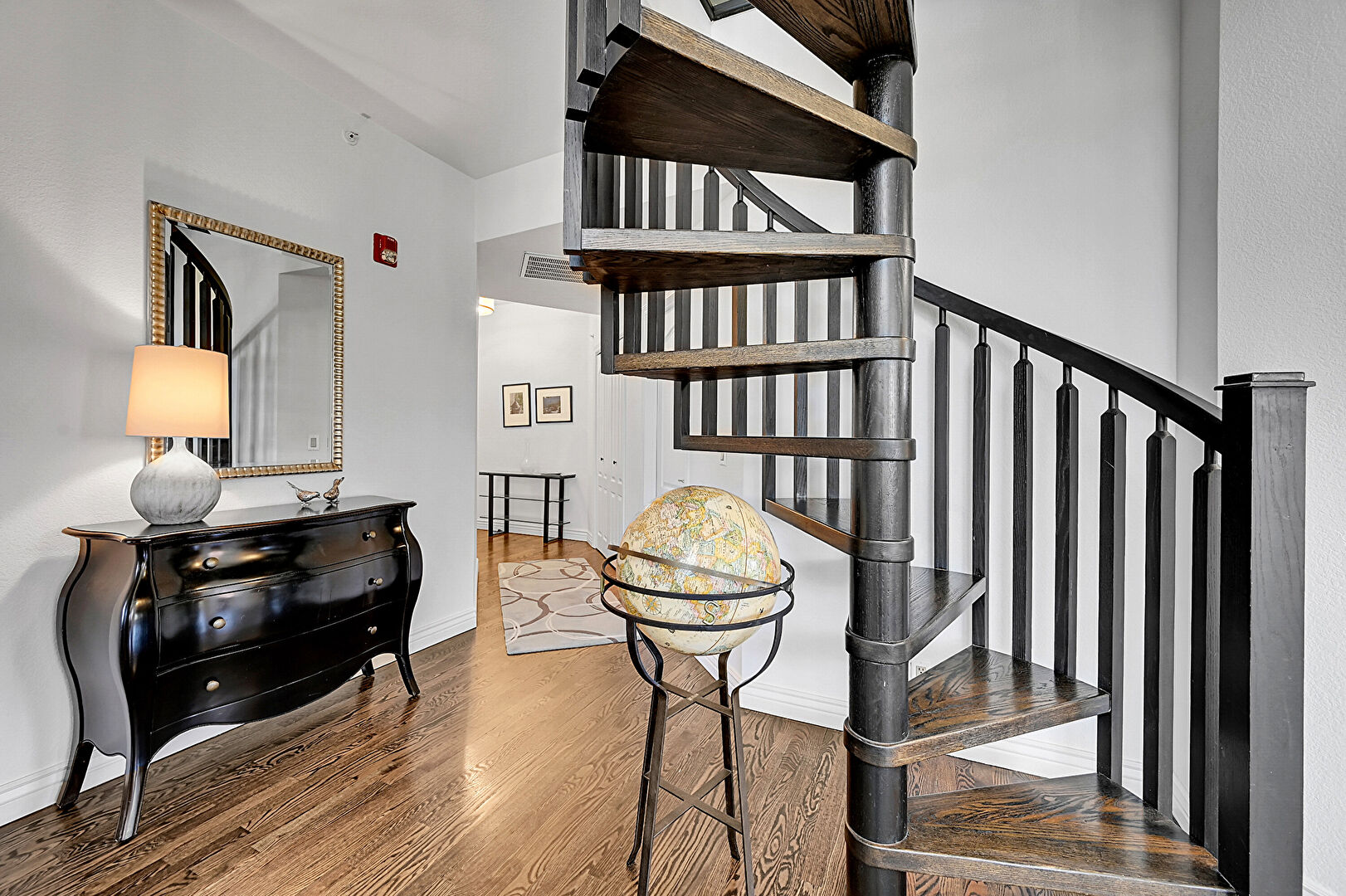 Baseboards Wall, Drywall, Fire Alarm, High Ceiling, Natural Light, Stairs, Textured Wall, Vaulted Ceiling, Vent, Wood Finish Floor, Baseboards Wall, Textured Wall, Wood Finish Floor