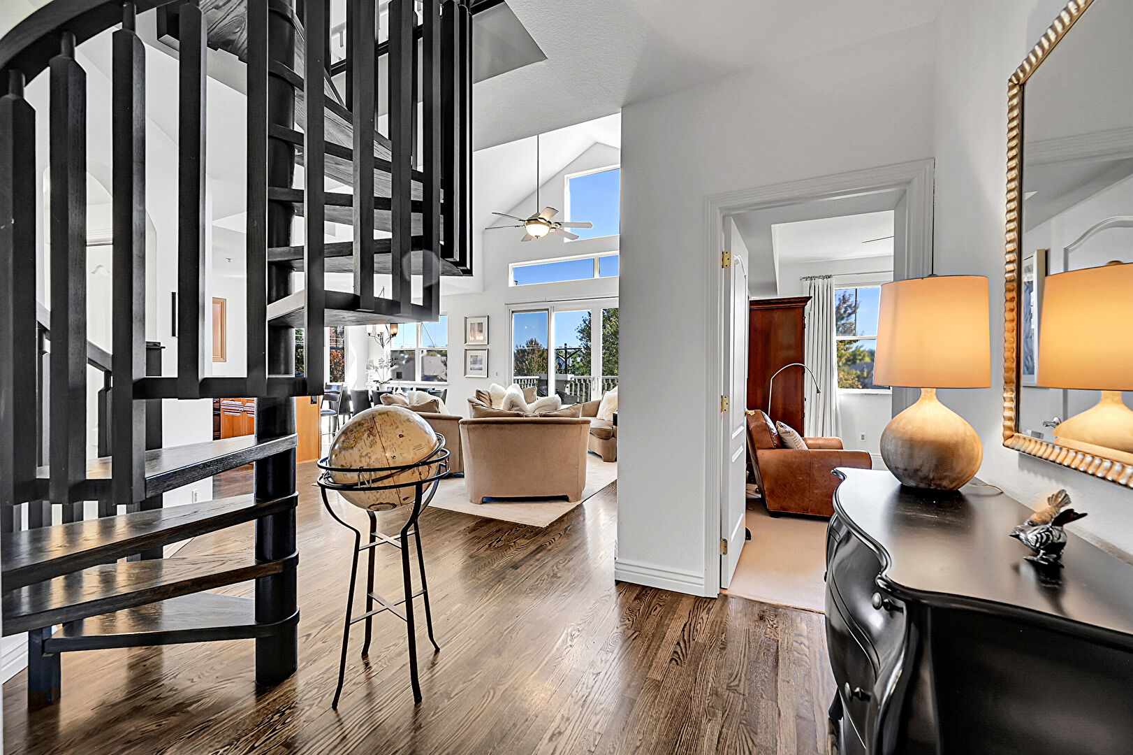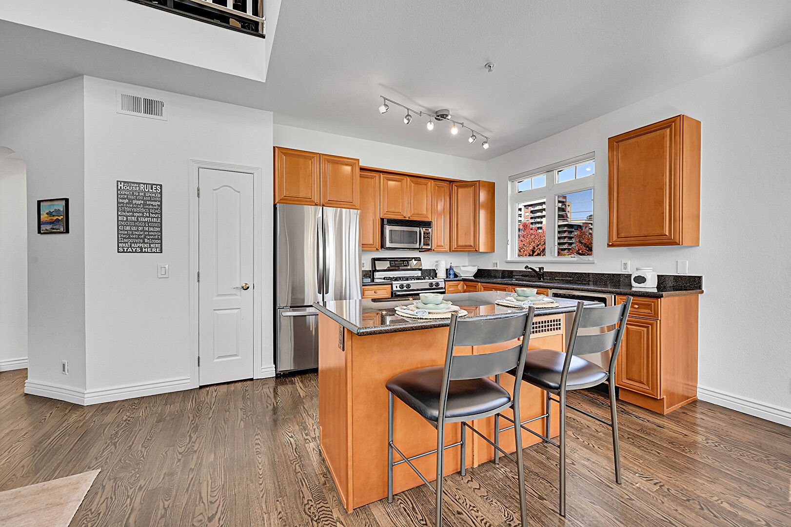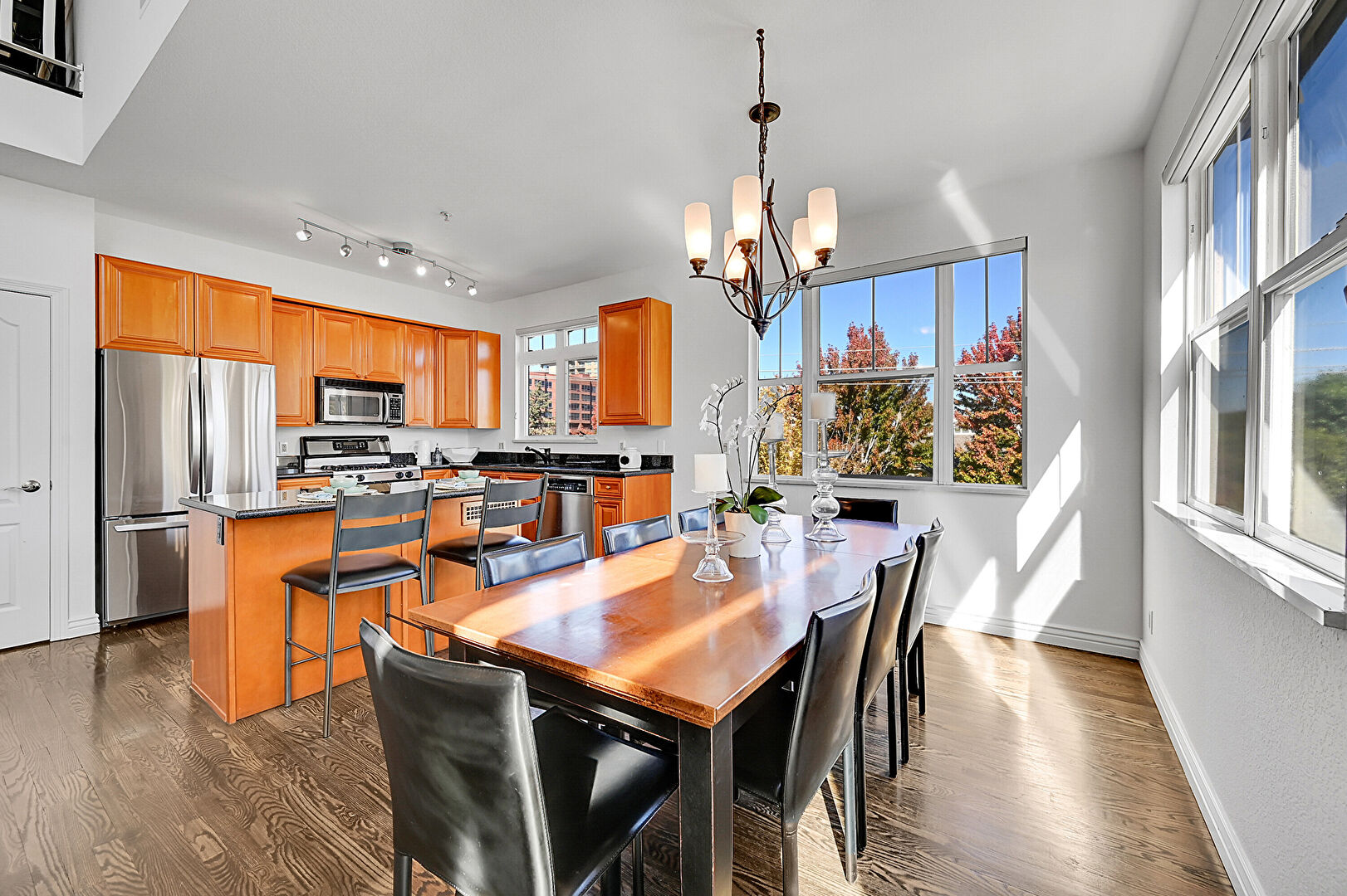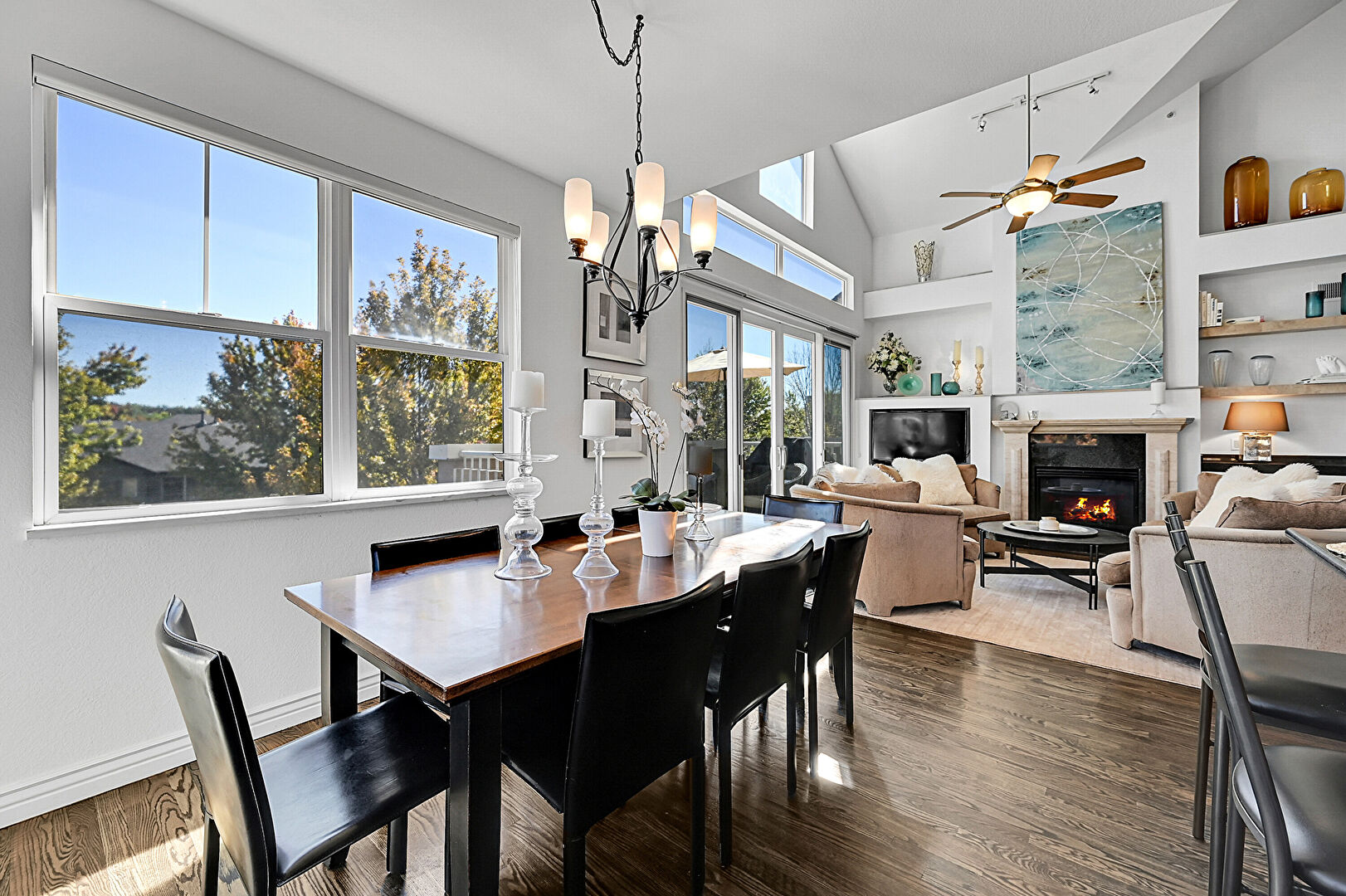Baseboards Wall, Built In Shelves, Ceiling Fan, Drywall, Fireplace, High Ceiling, Natural Light, Notable Chandelier, Stairs, Track Lighting, Vaulted Ceiling, Wood Finish Floor, L Shaped Kitchen, Notable Chandelier, Wood Finish Floor
