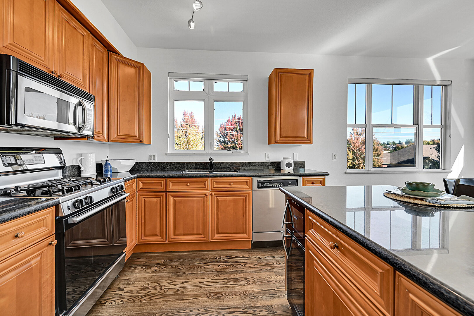 Baseboards Wall, Built In Shelves, Ceiling Fan, Drywall, Fireplace, High Ceiling, Kitchen Bar, Kitchen Island, L Shaped Kitchen, Medium Brown Cabinets, Natural Light, Notable Chandelier, Opens To Living Area, Pendant Lighting, Raised Cabinets, Stone Countertops, Track Lighting, Trash Compactor, Vaulted Ceiling, Vent, Wood Finish Floor, L Shaped Kitchen, Raised Cabinets, Stone Countertops, Wood Finish Floor