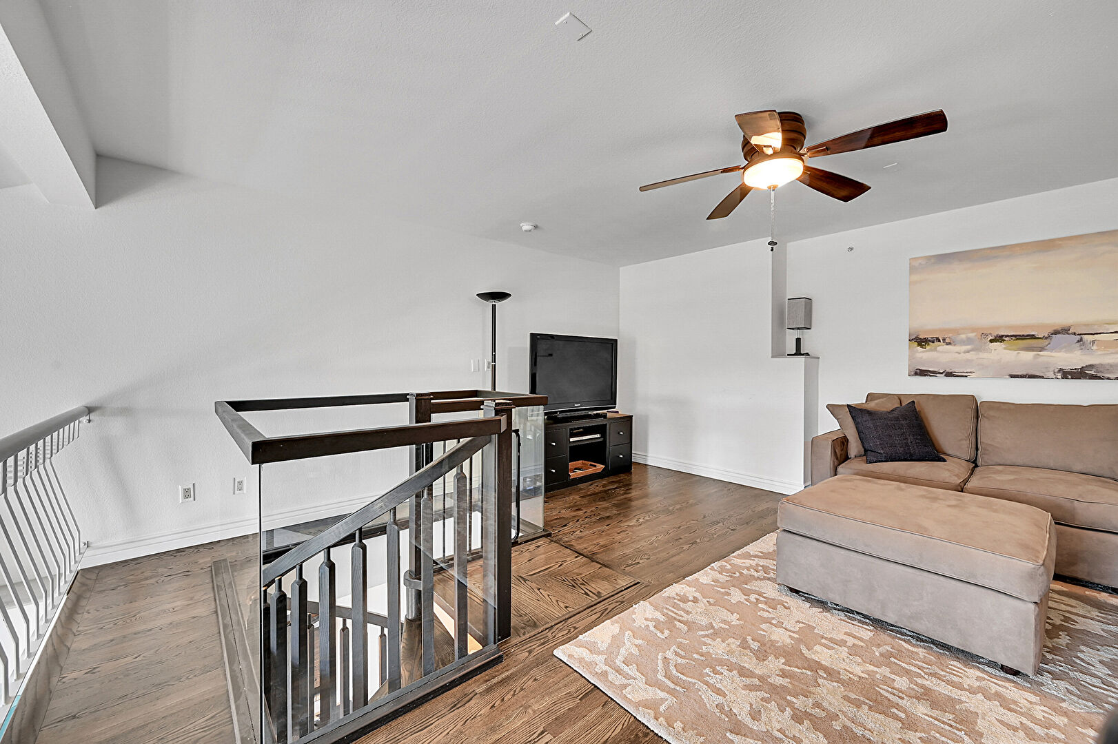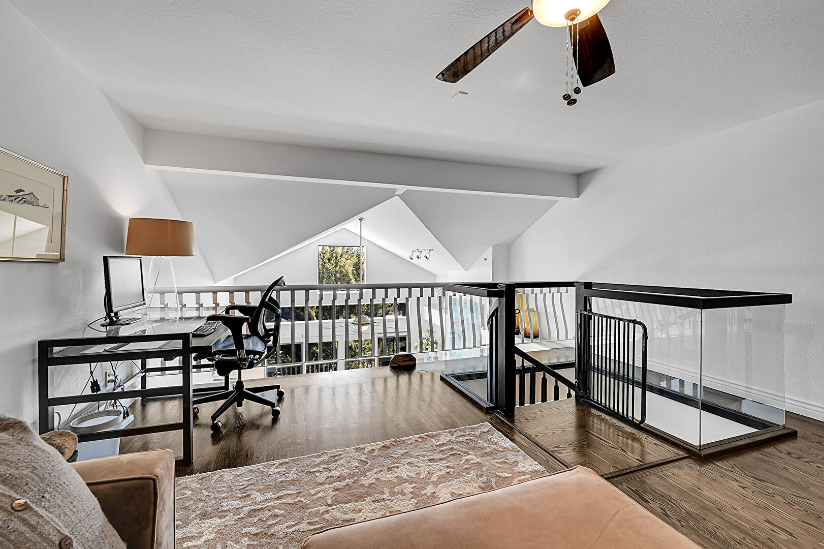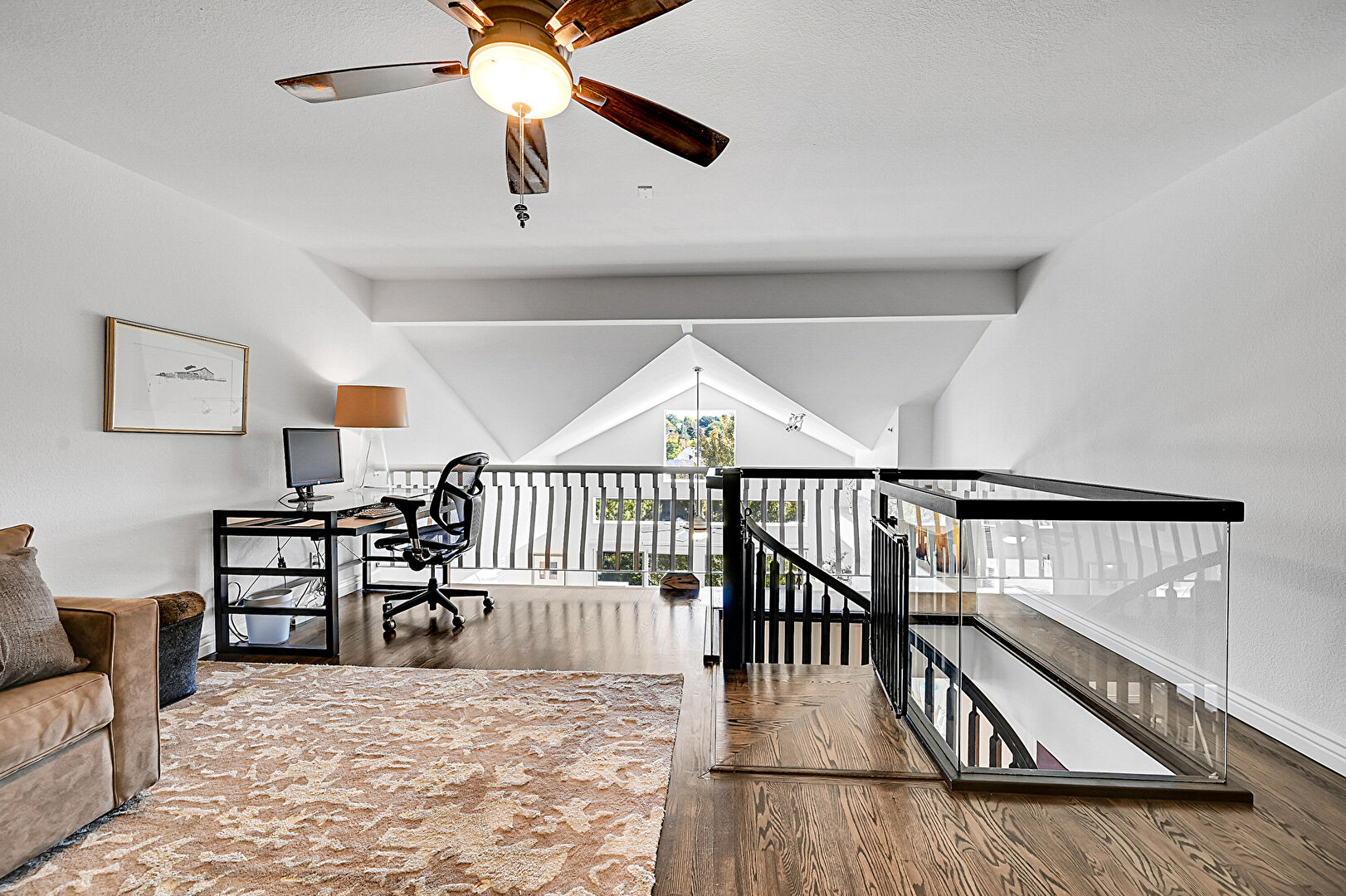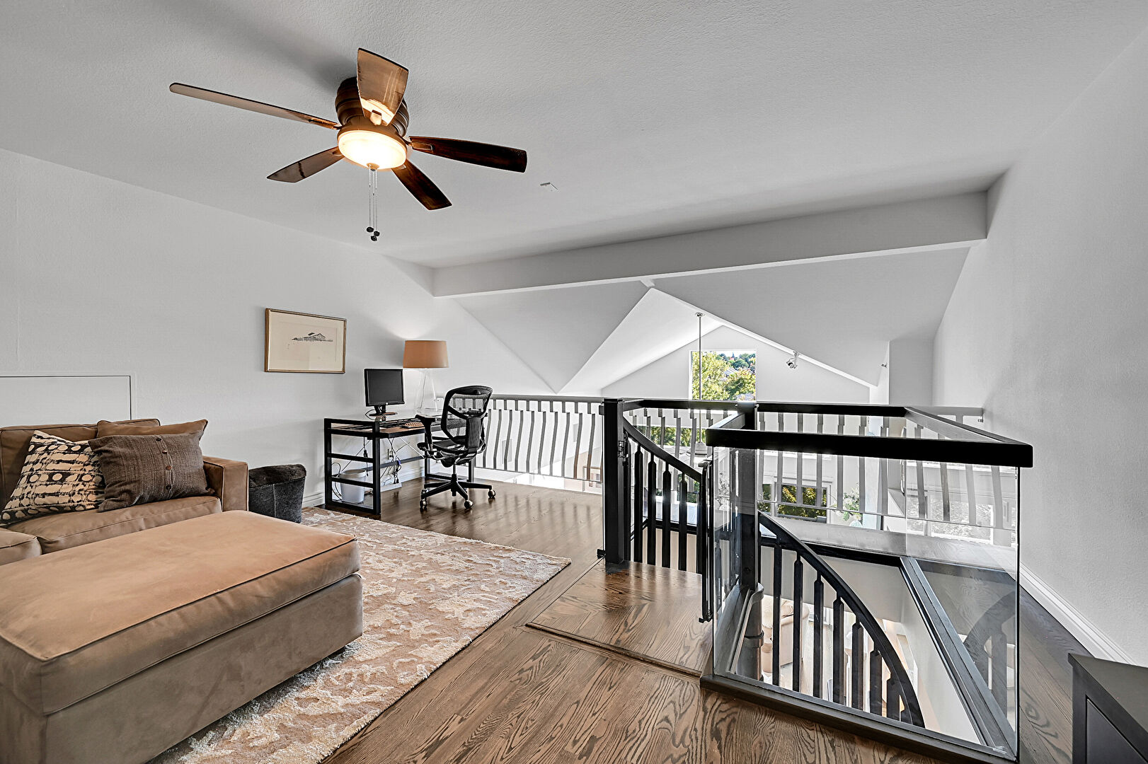 Baseboards Wall, Beamed Ceiling, Ceiling Fan, Drywall, Natural Light, Office Area, Upstairs Landing, Vaulted Ceiling, Wood Finish Floor, Ceiling Fan, Office Area, Vaulted Ceiling, Wood Finish Floor