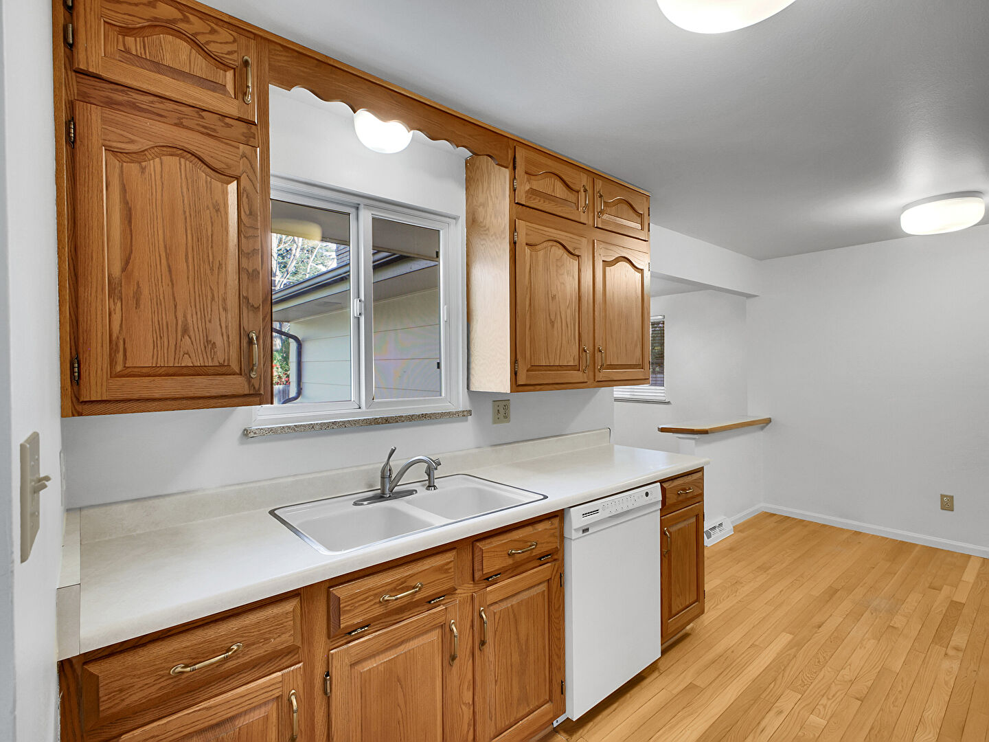 Arched Cabinets, Baseboards Wall, Ceiling Fan, Kitchen Peninsula, Medium Brown Cabinets, Natural Light, Vent, Visible Hinge Cabinets, Wood Finish Floor, Drywall