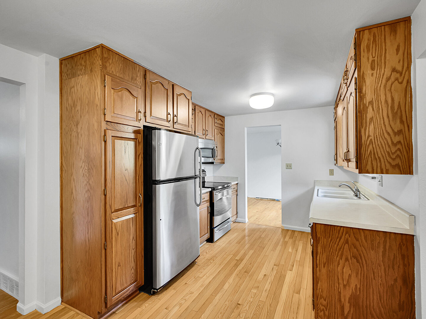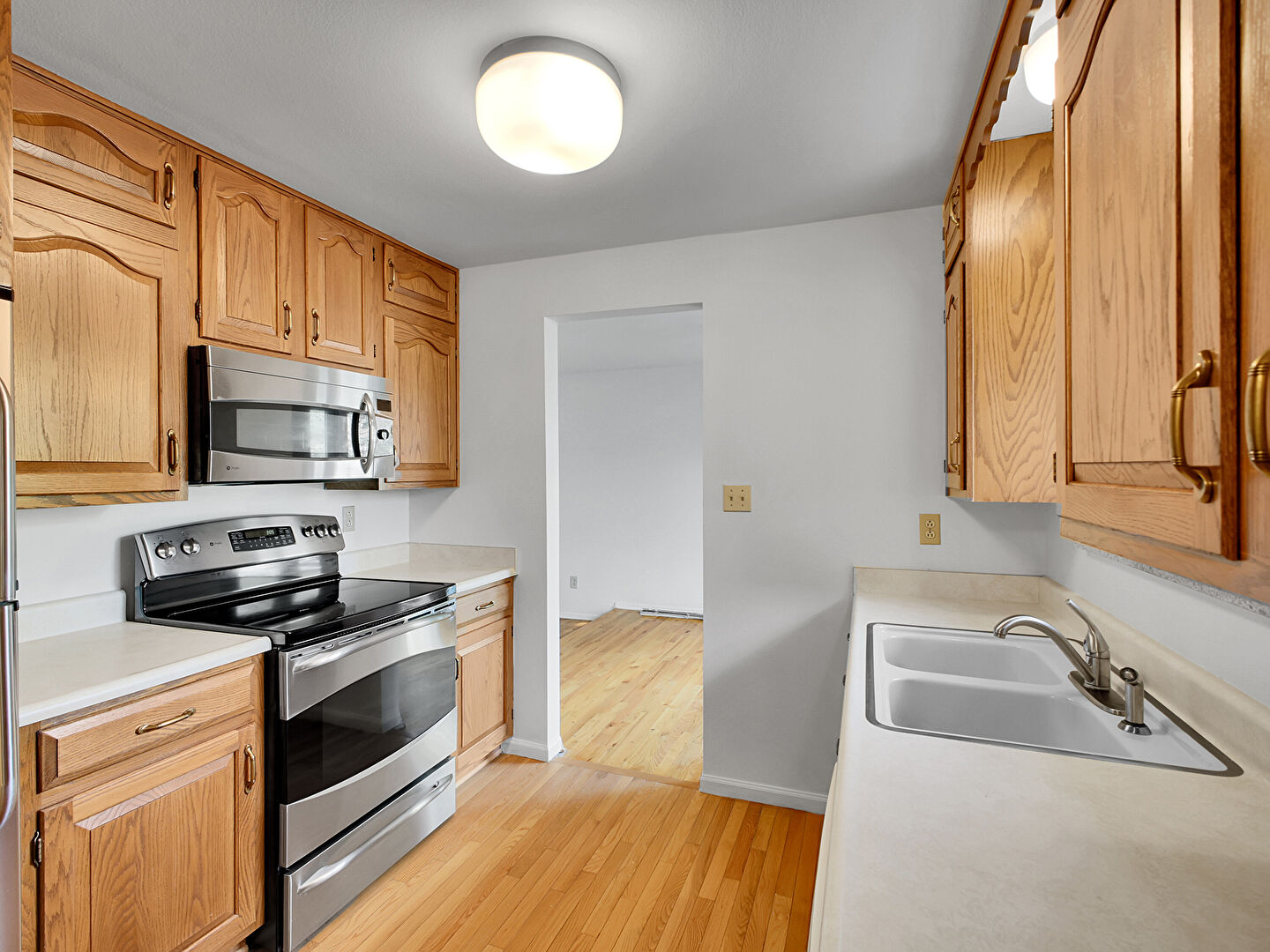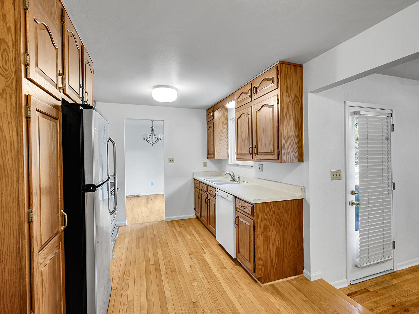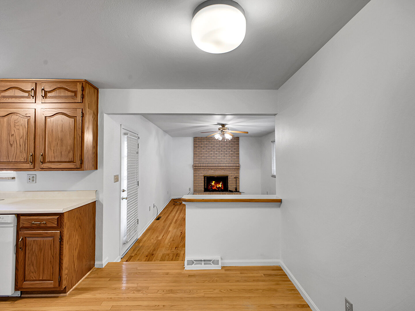 Arched Cabinets, Baseboards Wall, Ceiling Fan, Drywall, Galley Kitchen, Kitchen Peninsula, Medium Brown Cabinets, Raised Cabinets, Vent, Visible Hinge Cabinets, Wood Finish Floor, Baseboards Wall, Fireplace, Natural Light, Visible Hinge Cabinets, Wood Finish Floor