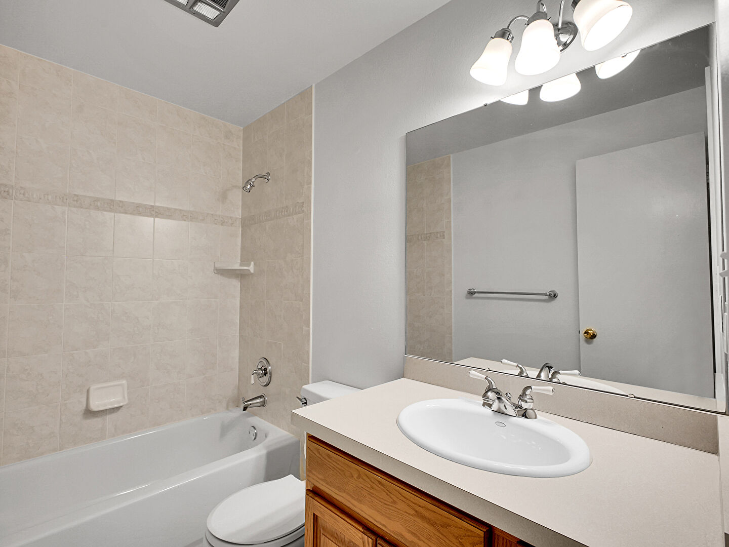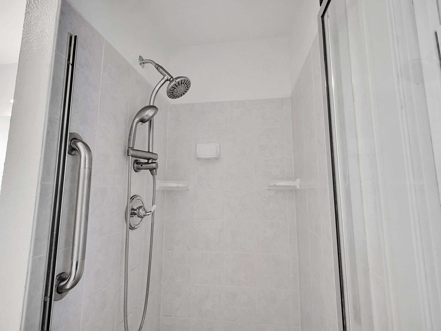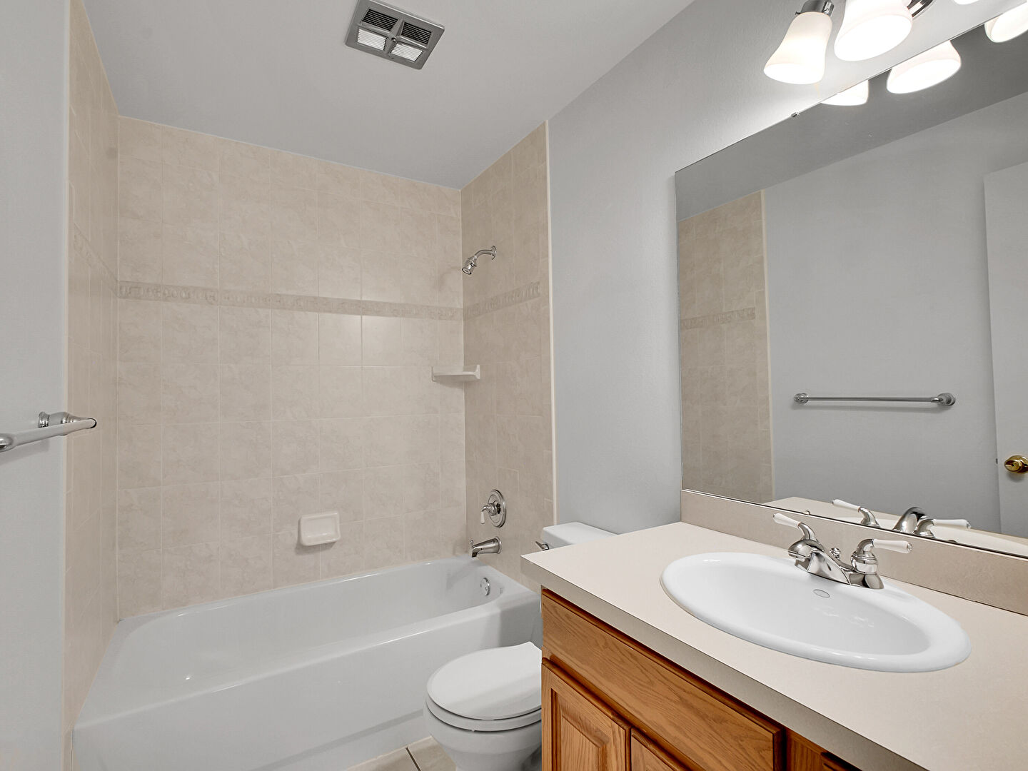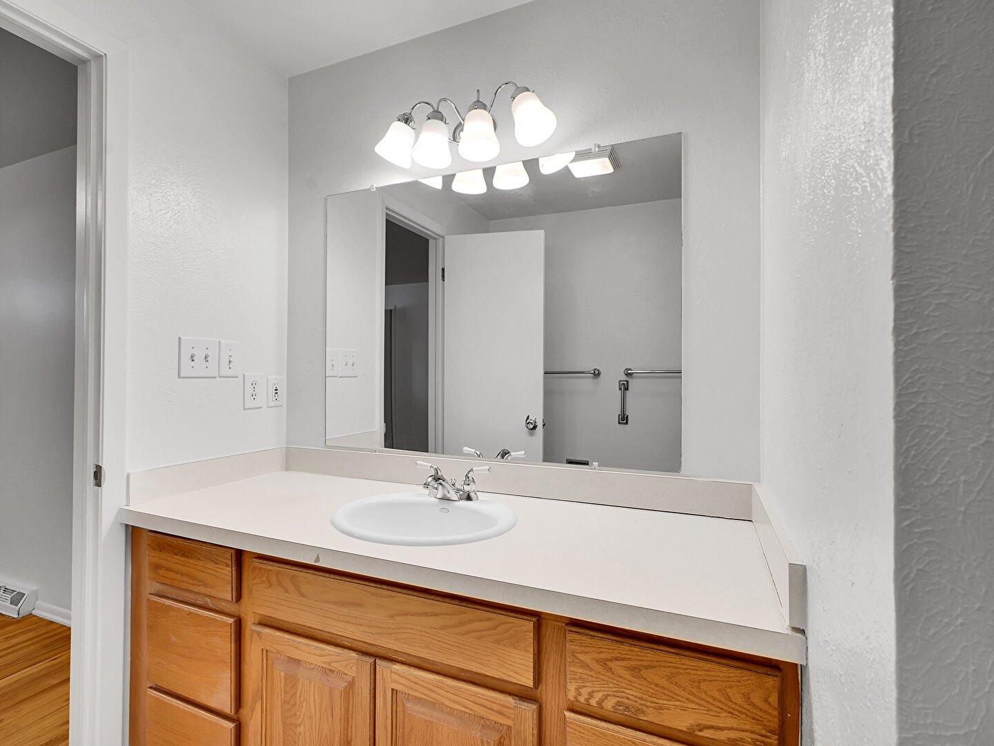 Aggregate Floor, Baseboards Wall, Combined Bath Shower, Drywall, Full Bathroom, Notable Chandelier, Textured Wall, Tile Floor, Vanity, Vent, Wood Finish Floor, Wood Wall, Baseboards Wall, Combined Bath Shower, Half Bathroom, Vanity