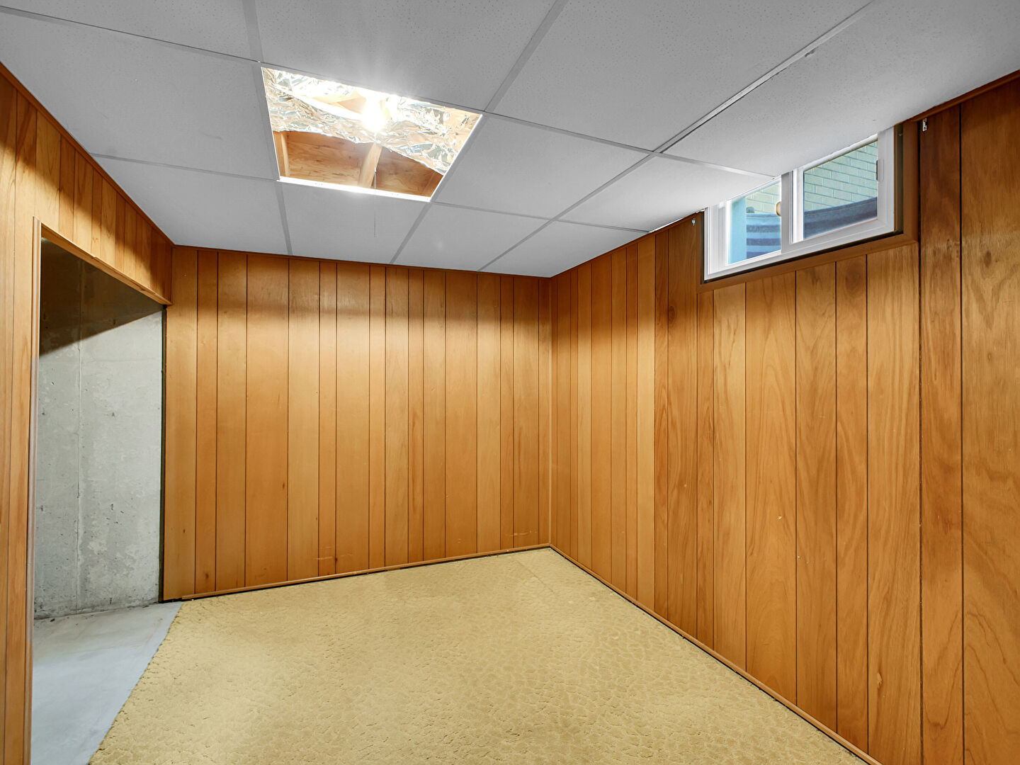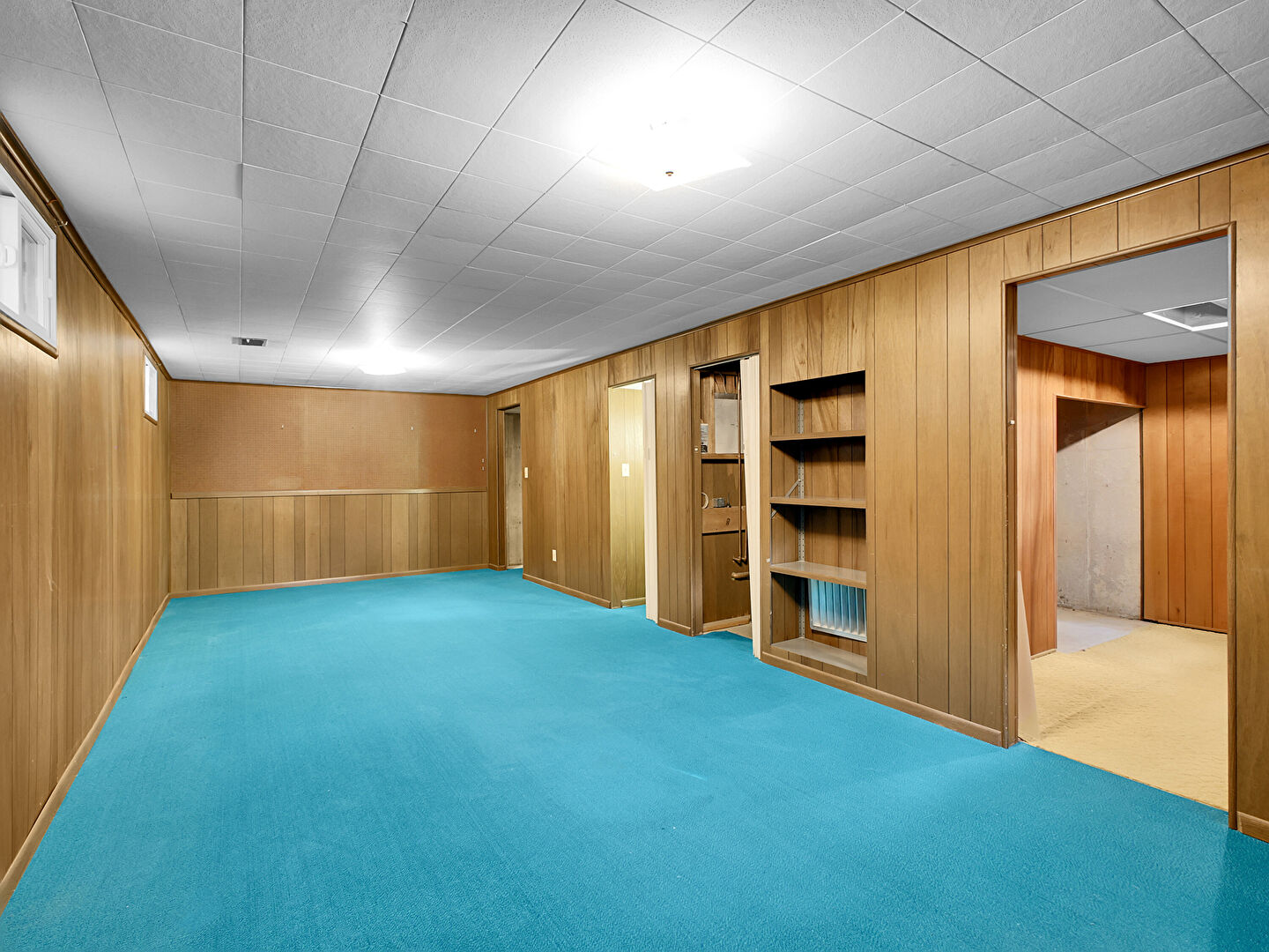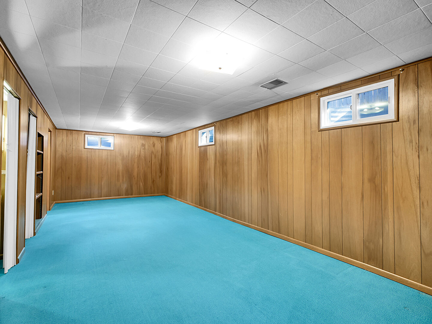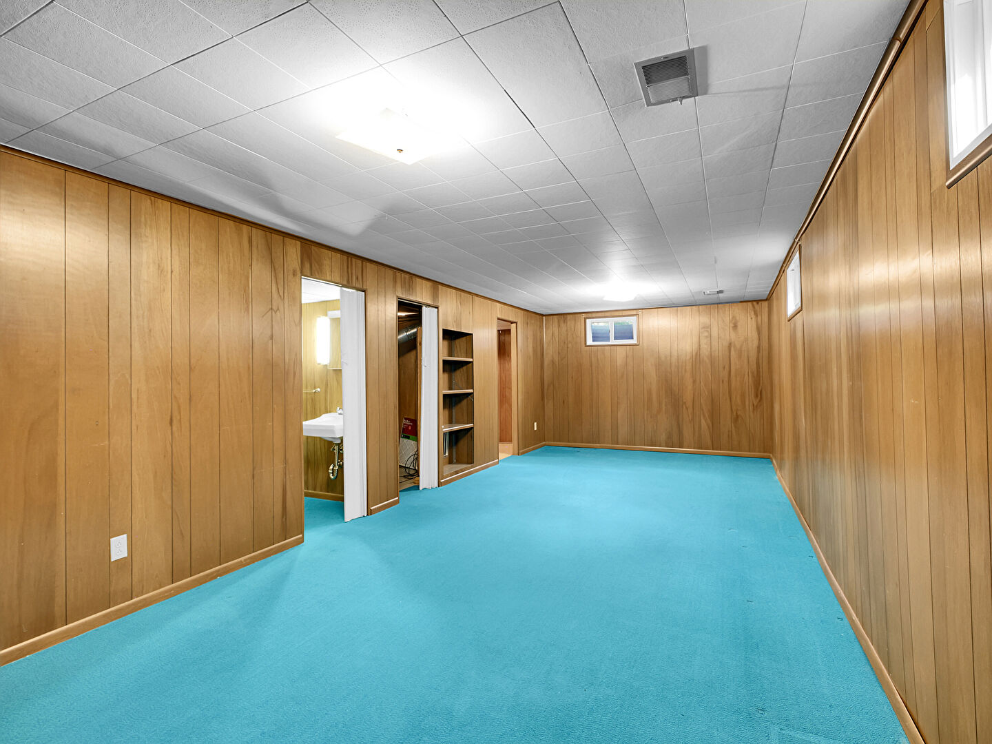 Baseboards Wall, Basement, Built In Shelves, Carpet, Natural Light, Vent, Wood Wall, Basement, Drop Ceiling, Natural Light, Wood Wall
