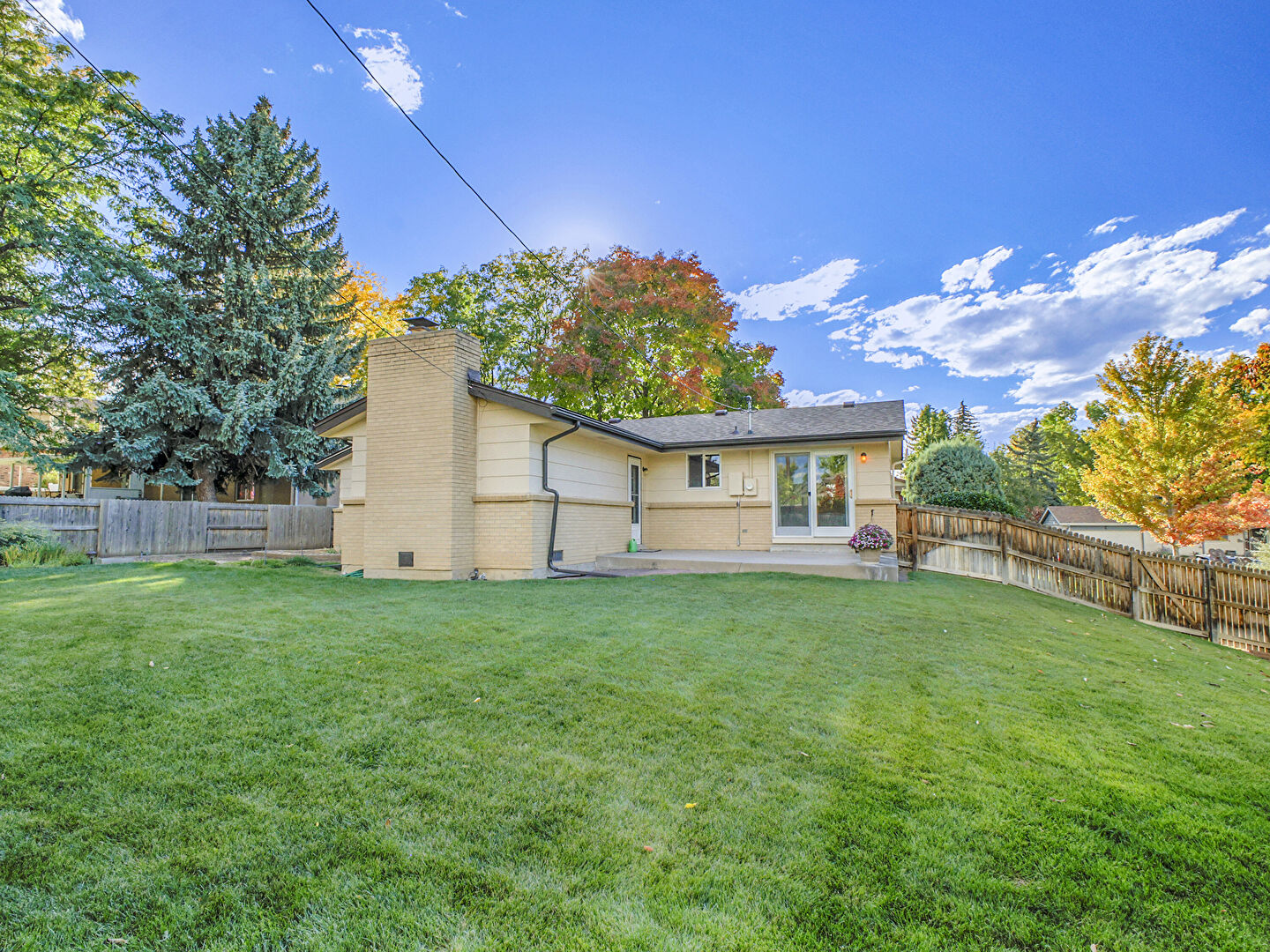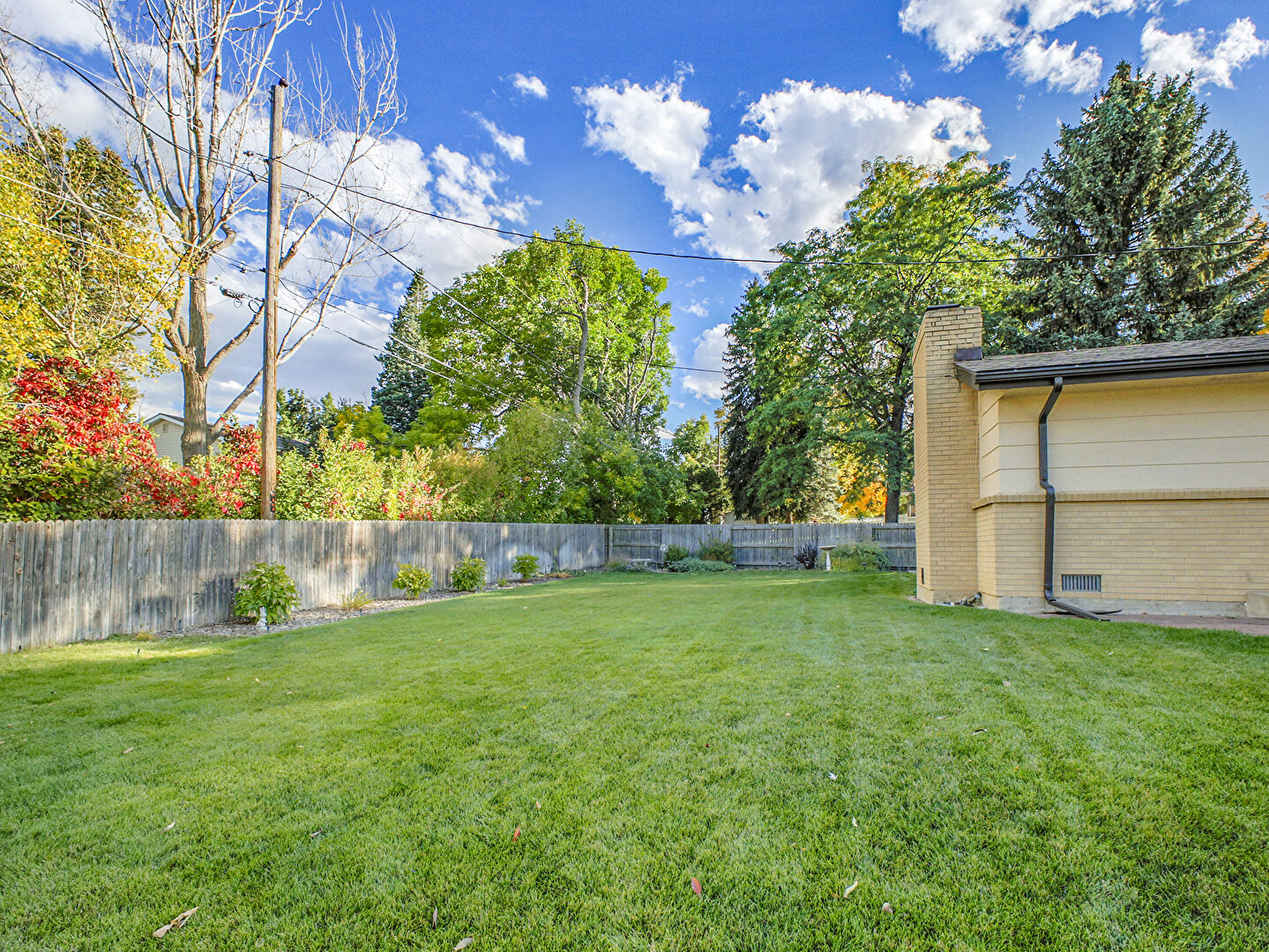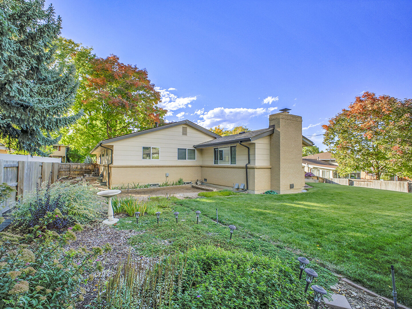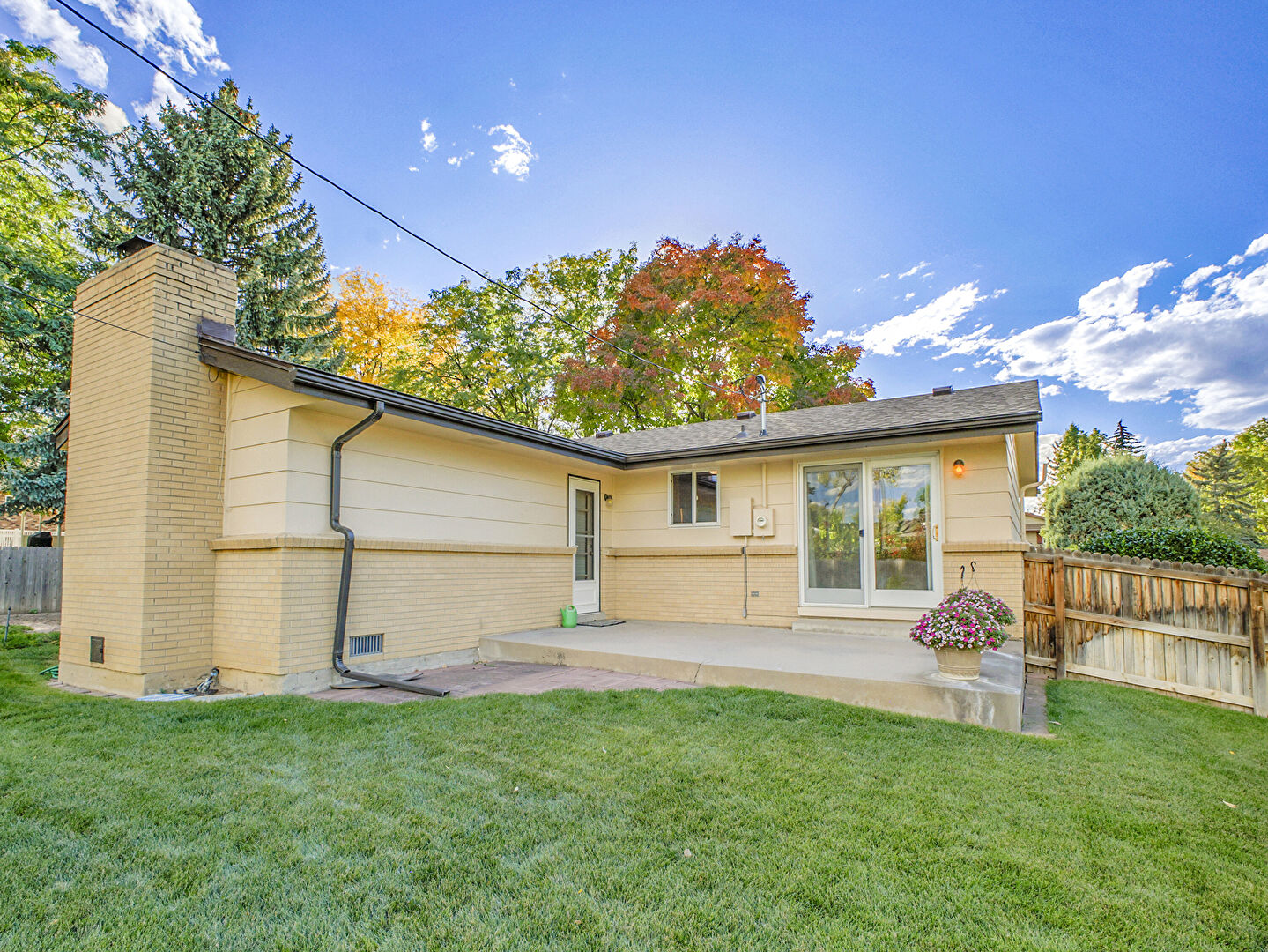 Brick Siding, Chimney, Concrete Foundation, Downspout, Electric Meter, Fence, Gutters, Horizontal Siding, Lawn, Patio, Concrete Foundation, Lawn